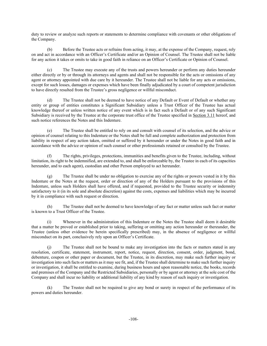 -108- duty to review or analyze such reports or statements to determine compliance with covenants or other obligations of the Company. (b) Before the Trustee acts or refrains from acting, it may, at the expense of the Company, request, rely on and act in accordance with an Officer’s Certificate and/or an Opinion of Counsel. The Trustee shall not be liable for any action it takes or omits to take in good faith in reliance on an Officer’s Certificate or Opinion of Counsel. (c) The Trustee may execute any of the trusts and powers hereunder or perform any duties hereunder either directly or by or through its attorneys and agents and shall not be responsible for the acts or omissions of any agent or attorney appointed with due care by it hereunder. The Trustee shall not be liable for any acts or omissions, except for such losses, damages or expenses which have been finally adjudicated by a court of competent jurisdiction to have directly resulted from the Trustee’s gross negligence or willful misconduct. (d) The Trustee shall not be deemed to have notice of any Default or Event of Default or whether any entity or group of entities constitutes a Significant Subsidiary unless a Trust Officer of the Trustee has actual knowledge thereof or unless written notice of any event which is in fact such a Default or of any such Significant Subsidiary is received by the Trustee at the corporate trust office of the Trustee specified in Section 3.11 hereof, and such notice references the Notes and this Indenture. (e) The Trustee shall be entitled to rely on and consult with counsel of its selection, and the advice or opinion of counsel relating to this Indenture or the Notes shall be full and complete authorization and protection from liability in respect of any action taken, omitted or suffered by it hereunder or under the Notes in good faith and in accordance with the advice or opinion of such counsel or other professionals retained or consulted by the Trustee. (f) The rights, privileges, protections, immunities and benefits given to the Trustee, including, without limitation, its right to be indemnified, are extended to, and shall be enforceable by, the Trustee in each of its capacities hereunder, and to each agent), custodian and other Person employed to act hereunder. (g) The Trustee shall be under no obligation to exercise any of the rights or powers vested in it by this Indenture or the Notes at the request, order or direction of any of the Holders pursuant to the provisions of this Indenture, unless such Holders shall have offered, and if requested, provided to the Trustee security or indemnity satisfactory to it (in its sole and absolute discretion) against the costs, expenses and liabilities which may be incurred by it in compliance with such request or direction. (h) The Trustee shall not be deemed to have knowledge of any fact or matter unless such fact or matter is known to a Trust Officer of the Trustee. (i) Whenever in the administration of this Indenture or the Notes the Trustee shall deem it desirable that a matter be proved or established prior to taking, suffering or omitting any action hereunder or thereunder, the Trustee (unless other evidence be herein specifically prescribed) may, in the absence of negligence or willful misconduct on its part, conclusively rely upon an Officer’s Certificate. (j) The Trustee shall not be bound to make any investigation into the facts or matters stated in any resolution, certificate, statement, instrument, report, notice, request, direction, consent, order, judgment, bond, debenture, coupon or other paper or document, but the Trustee, in its discretion, may make such further inquiry or investigation into such facts or matters as it may see fit, and, if the Trustee shall determine to make such further inquiry or investigation, it shall be entitled to examine, during business hours and upon reasonable notice, the books, records and premises of the Company and the Restricted Subsidiaries, personally or by agent or attorney at the sole cost of the Company and shall incur no liability or additional liability of any kind by reason of such inquiry or investigation. (k) The Trustee shall not be required to give any bond or surety in respect of the performance of its powers and duties hereunder.
