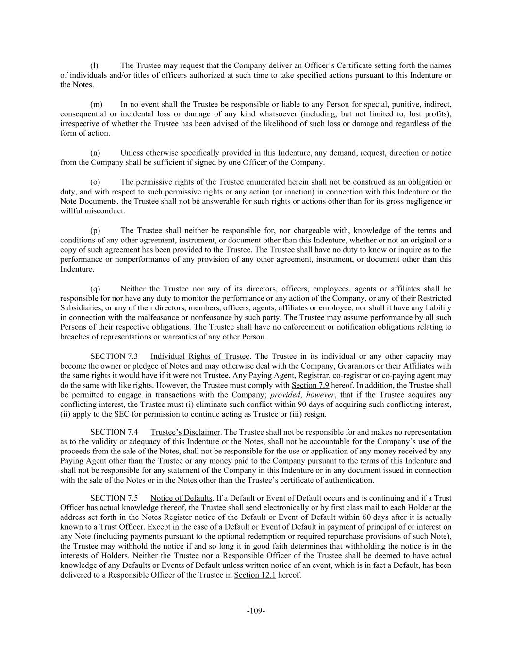 -109- (l) The Trustee may request that the Company deliver an Officer’s Certificate setting forth the names of individuals and/or titles of officers authorized at such time to take specified actions pursuant to this Indenture or the Notes. (m) In no event shall the Trustee be responsible or liable to any Person for special, punitive, indirect, consequential or incidental loss or damage of any kind whatsoever (including, but not limited to, lost profits), irrespective of whether the Trustee has been advised of the likelihood of such loss or damage and regardless of the form of action. (n) Unless otherwise specifically provided in this Indenture, any demand, request, direction or notice from the Company shall be sufficient if signed by one Officer of the Company. (o) The permissive rights of the Trustee enumerated herein shall not be construed as an obligation or duty, and with respect to such permissive rights or any action (or inaction) in connection with this Indenture or the Note Documents, the Trustee shall not be answerable for such rights or actions other than for its gross negligence or willful misconduct. (p) The Trustee shall neither be responsible for, nor chargeable with, knowledge of the terms and conditions of any other agreement, instrument, or document other than this Indenture, whether or not an original or a copy of such agreement has been provided to the Trustee. The Trustee shall have no duty to know or inquire as to the performance or nonperformance of any provision of any other agreement, instrument, or document other than this Indenture. (q) Neither the Trustee nor any of its directors, officers, employees, agents or affiliates shall be responsible for nor have any duty to monitor the performance or any action of the Company, or any of their Restricted Subsidiaries, or any of their directors, members, officers, agents, affiliates or employee, nor shall it have any liability in connection with the malfeasance or nonfeasance by such party. The Trustee may assume performance by all such Persons of their respective obligations. The Trustee shall have no enforcement or notification obligations relating to breaches of representations or warranties of any other Person. SECTION 7.3 Individual Rights of Trustee. The Trustee in its individual or any other capacity may become the owner or pledgee of Notes and may otherwise deal with the Company, Guarantors or their Affiliates with the same rights it would have if it were not Trustee. Any Paying Agent, Registrar, co-registrar or co-paying agent may do the same with like rights. However, the Trustee must comply with Section 7.9 hereof. In addition, the Trustee shall be permitted to engage in transactions with the Company; provided, however, that if the Trustee acquires any conflicting interest, the Trustee must (i) eliminate such conflict within 90 days of acquiring such conflicting interest, (ii) apply to the SEC for permission to continue acting as Trustee or (iii) resign. SECTION 7.4 Trustee’s Disclaimer. The Trustee shall not be responsible for and makes no representation as to the validity or adequacy of this Indenture or the Notes, shall not be accountable for the Company’s use of the proceeds from the sale of the Notes, shall not be responsible for the use or application of any money received by any Paying Agent other than the Trustee or any money paid to the Company pursuant to the terms of this Indenture and shall not be responsible for any statement of the Company in this Indenture or in any document issued in connection with the sale of the Notes or in the Notes other than the Trustee’s certificate of authentication. SECTION 7.5 Notice of Defaults. If a Default or Event of Default occurs and is continuing and if a Trust Officer has actual knowledge thereof, the Trustee shall send electronically or by first class mail to each Holder at the address set forth in the Notes Register notice of the Default or Event of Default within 60 days after it is actually known to a Trust Officer. Except in the case of a Default or Event of Default in payment of principal of or interest on any Note (including payments pursuant to the optional redemption or required repurchase provisions of such Note), the Trustee may withhold the notice if and so long it in good faith determines that withholding the notice is in the interests of Holders. Neither the Trustee nor a Responsible Officer of the Trustee shall be deemed to have actual knowledge of any Defaults or Events of Default unless written notice of an event, which is in fact a Default, has been delivered to a Responsible Officer of the Trustee in Section 12.1 hereof.