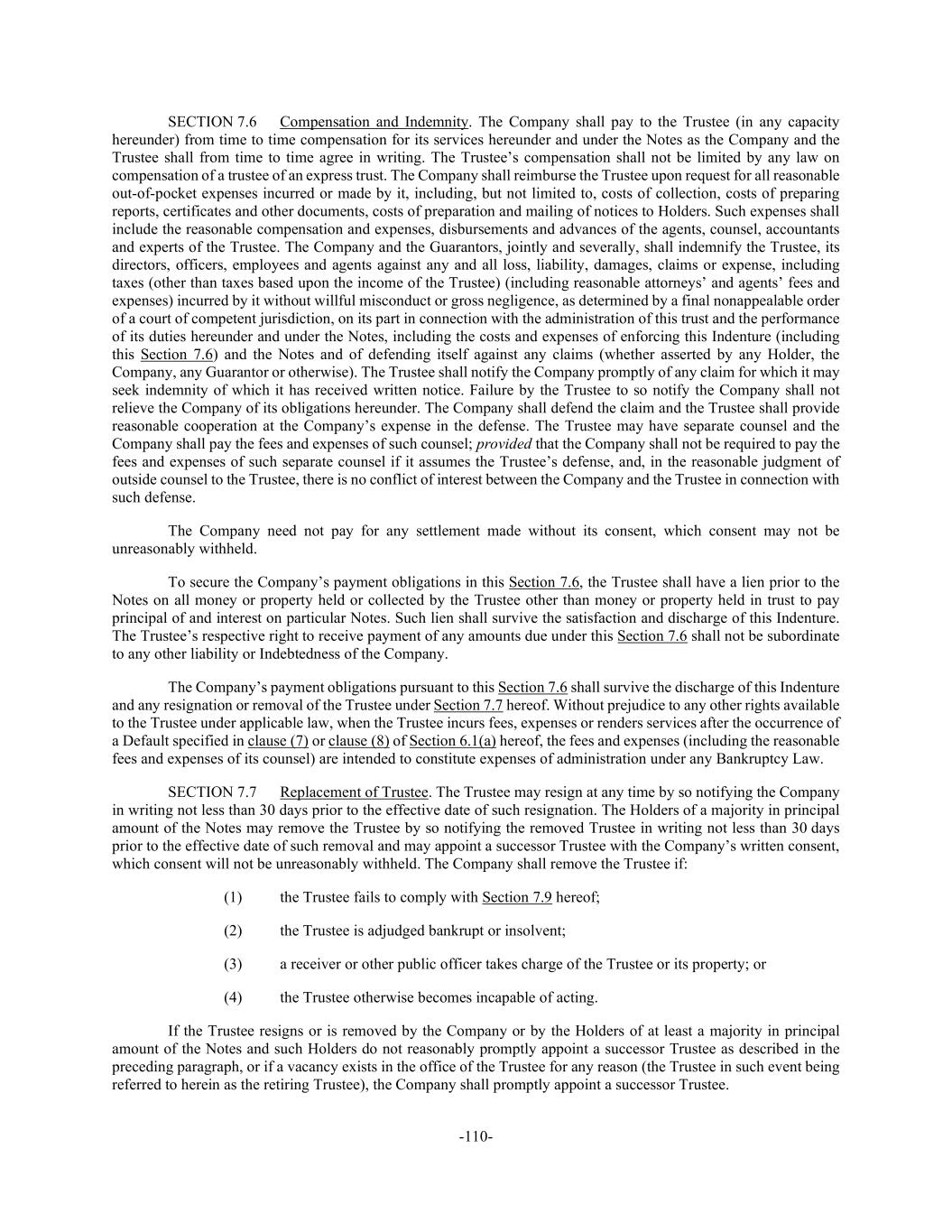 -110- SECTION 7.6 Compensation and Indemnity. The Company shall pay to the Trustee (in any capacity hereunder) from time to time compensation for its services hereunder and under the Notes as the Company and the Trustee shall from time to time agree in writing. The Trustee’s compensation shall not be limited by any law on compensation of a trustee of an express trust. The Company shall reimburse the Trustee upon request for all reasonable out-of-pocket expenses incurred or made by it, including, but not limited to, costs of collection, costs of preparing reports, certificates and other documents, costs of preparation and mailing of notices to Holders. Such expenses shall include the reasonable compensation and expenses, disbursements and advances of the agents, counsel, accountants and experts of the Trustee. The Company and the Guarantors, jointly and severally, shall indemnify the Trustee, its directors, officers, employees and agents against any and all loss, liability, damages, claims or expense, including taxes (other than taxes based upon the income of the Trustee) (including reasonable attorneys’ and agents’ fees and expenses) incurred by it without willful misconduct or gross negligence, as determined by a final nonappealable order of a court of competent jurisdiction, on its part in connection with the administration of this trust and the performance of its duties hereunder and under the Notes, including the costs and expenses of enforcing this Indenture (including this Section 7.6) and the Notes and of defending itself against any claims (whether asserted by any Holder, the Company, any Guarantor or otherwise). The Trustee shall notify the Company promptly of any claim for which it may seek indemnity of which it has received written notice. Failure by the Trustee to so notify the Company shall not relieve the Company of its obligations hereunder. The Company shall defend the claim and the Trustee shall provide reasonable cooperation at the Company’s expense in the defense. The Trustee may have separate counsel and the Company shall pay the fees and expenses of such counsel; provided that the Company shall not be required to pay the fees and expenses of such separate counsel if it assumes the Trustee’s defense, and, in the reasonable judgment of outside counsel to the Trustee, there is no conflict of interest between the Company and the Trustee in connection with such defense. The Company need not pay for any settlement made without its consent, which consent may not be unreasonably withheld. To secure the Company’s payment obligations in this Section 7.6, the Trustee shall have a lien prior to the Notes on all money or property held or collected by the Trustee other than money or property held in trust to pay principal of and interest on particular Notes. Such lien shall survive the satisfaction and discharge of this Indenture. The Trustee’s respective right to receive payment of any amounts due under this Section 7.6 shall not be subordinate to any other liability or Indebtedness of the Company. The Company’s payment obligations pursuant to this Section 7.6 shall survive the discharge of this Indenture and any resignation or removal of the Trustee under Section 7.7 hereof. Without prejudice to any other rights available to the Trustee under applicable law, when the Trustee incurs fees, expenses or renders services after the occurrence of a Default specified in clause (7) or clause (8) of Section 6.1(a) hereof, the fees and expenses (including the reasonable fees and expenses of its counsel) are intended to constitute expenses of administration under any Bankruptcy Law. SECTION 7.7 Replacement of Trustee. The Trustee may resign at any time by so notifying the Company in writing not less than 30 days prior to the effective date of such resignation. The Holders of a majority in principal amount of the Notes may remove the Trustee by so notifying the removed Trustee in writing not less than 30 days prior to the effective date of such removal and may appoint a successor Trustee with the Company’s written consent, which consent will not be unreasonably withheld. The Company shall remove the Trustee if: (1) the Trustee fails to comply with Section 7.9 hereof; (2) the Trustee is adjudged bankrupt or insolvent; (3) a receiver or other public officer takes charge of the Trustee or its property; or (4) the Trustee otherwise becomes incapable of acting. If the Trustee resigns or is removed by the Company or by the Holders of at least a majority in principal amount of the Notes and such Holders do not reasonably promptly appoint a successor Trustee as described in the preceding paragraph, or if a vacancy exists in the office of the Trustee for any reason (the Trustee in such event being referred to herein as the retiring Trustee), the Company shall promptly appoint a successor Trustee.