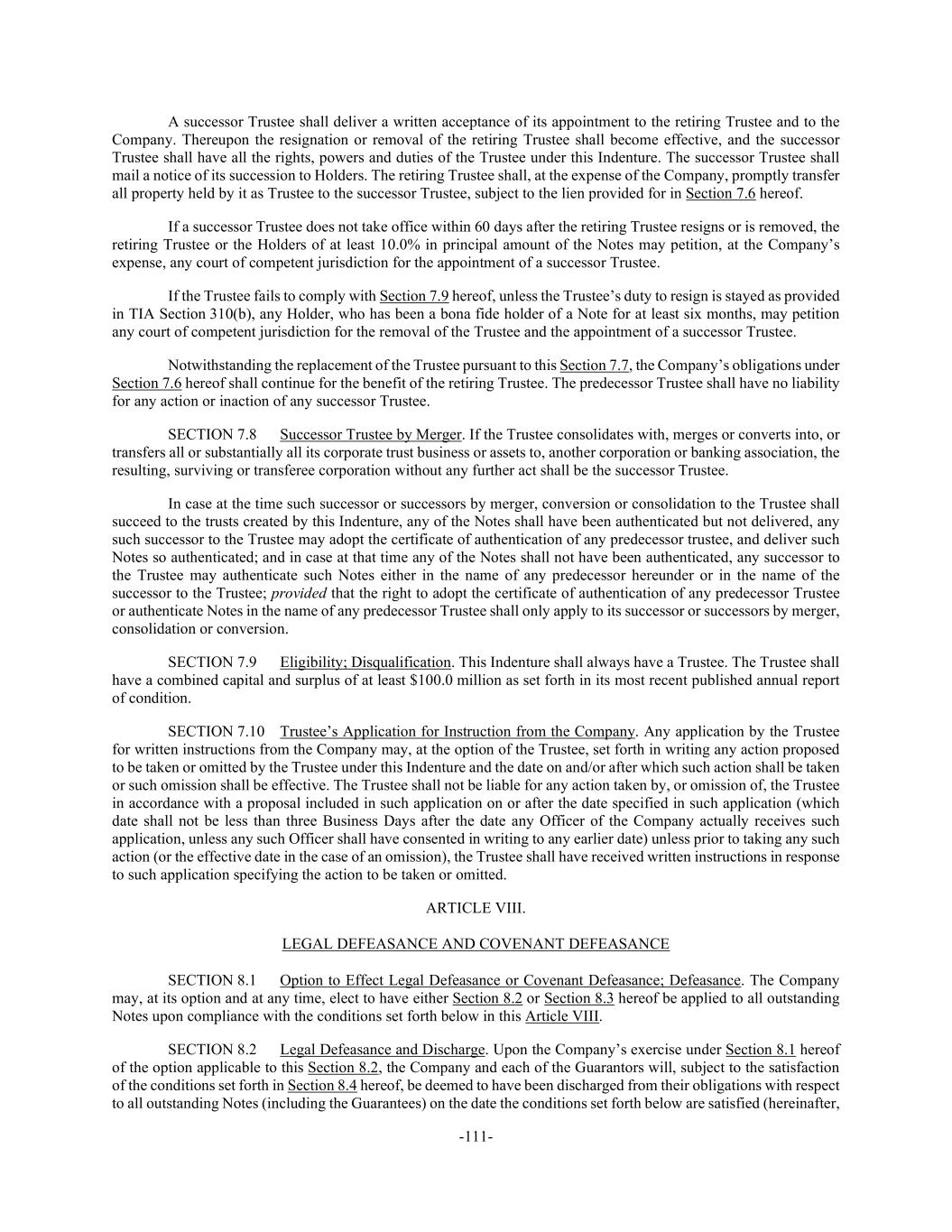 -111- A successor Trustee shall deliver a written acceptance of its appointment to the retiring Trustee and to the Company. Thereupon the resignation or removal of the retiring Trustee shall become effective, and the successor Trustee shall have all the rights, powers and duties of the Trustee under this Indenture. The successor Trustee shall mail a notice of its succession to Holders. The retiring Trustee shall, at the expense of the Company, promptly transfer all property held by it as Trustee to the successor Trustee, subject to the lien provided for in Section 7.6 hereof. If a successor Trustee does not take office within 60 days after the retiring Trustee resigns or is removed, the retiring Trustee or the Holders of at least 10.0% in principal amount of the Notes may petition, at the Company’s expense, any court of competent jurisdiction for the appointment of a successor Trustee. If the Trustee fails to comply with Section 7.9 hereof, unless the Trustee’s duty to resign is stayed as provided in TIA Section 310(b), any Holder, who has been a bona fide holder of a Note for at least six months, may petition any court of competent jurisdiction for the removal of the Trustee and the appointment of a successor Trustee. Notwithstanding the replacement of the Trustee pursuant to this Section 7.7, the Company’s obligations under Section 7.6 hereof shall continue for the benefit of the retiring Trustee. The predecessor Trustee shall have no liability for any action or inaction of any successor Trustee. SECTION 7.8 Successor Trustee by Merger. If the Trustee consolidates with, merges or converts into, or transfers all or substantially all its corporate trust business or assets to, another corporation or banking association, the resulting, surviving or transferee corporation without any further act shall be the successor Trustee. In case at the time such successor or successors by merger, conversion or consolidation to the Trustee shall succeed to the trusts created by this Indenture, any of the Notes shall have been authenticated but not delivered, any such successor to the Trustee may adopt the certificate of authentication of any predecessor trustee, and deliver such Notes so authenticated; and in case at that time any of the Notes shall not have been authenticated, any successor to the Trustee may authenticate such Notes either in the name of any predecessor hereunder or in the name of the successor to the Trustee; provided that the right to adopt the certificate of authentication of any predecessor Trustee or authenticate Notes in the name of any predecessor Trustee shall only apply to its successor or successors by merger, consolidation or conversion. SECTION 7.9 Eligibility; Disqualification. This Indenture shall always have a Trustee. The Trustee shall have a combined capital and surplus of at least $100.0 million as set forth in its most recent published annual report of condition. SECTION 7.10 Trustee’s Application for Instruction from the Company. Any application by the Trustee for written instructions from the Company may, at the option of the Trustee, set forth in writing any action proposed to be taken or omitted by the Trustee under this Indenture and the date on and/or after which such action shall be taken or such omission shall be effective. The Trustee shall not be liable for any action taken by, or omission of, the Trustee in accordance with a proposal included in such application on or after the date specified in such application (which date shall not be less than three Business Days after the date any Officer of the Company actually receives such application, unless any such Officer shall have consented in writing to any earlier date) unless prior to taking any such action (or the effective date in the case of an omission), the Trustee shall have received written instructions in response to such application specifying the action to be taken or omitted. ARTICLE VIII. LEGAL DEFEASANCE AND COVENANT DEFEASANCE SECTION 8.1 Option to Effect Legal Defeasance or Covenant Defeasance; Defeasance. The Company may, at its option and at any time, elect to have either Section 8.2 or Section 8.3 hereof be applied to all outstanding Notes upon compliance with the conditions set forth below in this Article VIII. SECTION 8.2 Legal Defeasance and Discharge. Upon the Company’s exercise under Section 8.1 hereof of the option applicable to this Section 8.2, the Company and each of the Guarantors will, subject to the satisfaction of the conditions set forth in Section 8.4 hereof, be deemed to have been discharged from their obligations with respect to all outstanding Notes (including the Guarantees) on the date the conditions set forth below are satisfied (hereinafter,