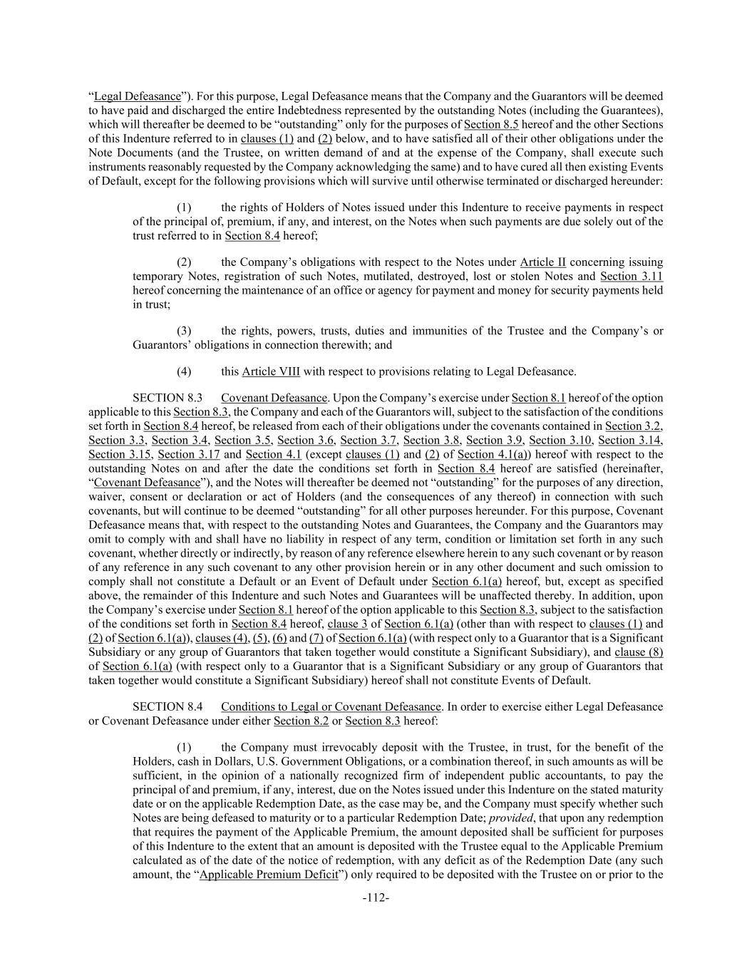 -112- “Legal Defeasance”). For this purpose, Legal Defeasance means that the Company and the Guarantors will be deemed to have paid and discharged the entire Indebtedness represented by the outstanding Notes (including the Guarantees), which will thereafter be deemed to be “outstanding” only for the purposes of Section 8.5 hereof and the other Sections of this Indenture referred to in clauses (1) and (2) below, and to have satisfied all of their other obligations under the Note Documents (and the Trustee, on written demand of and at the expense of the Company, shall execute such instruments reasonably requested by the Company acknowledging the same) and to have cured all then existing Events of Default, except for the following provisions which will survive until otherwise terminated or discharged hereunder: (1) the rights of Holders of Notes issued under this Indenture to receive payments in respect of the principal of, premium, if any, and interest, on the Notes when such payments are due solely out of the trust referred to in Section 8.4 hereof; (2) the Company’s obligations with respect to the Notes under Article II concerning issuing temporary Notes, registration of such Notes, mutilated, destroyed, lost or stolen Notes and Section 3.11 hereof concerning the maintenance of an office or agency for payment and money for security payments held in trust; (3) the rights, powers, trusts, duties and immunities of the Trustee and the Company’s or Guarantors’ obligations in connection therewith; and (4) this Article VIII with respect to provisions relating to Legal Defeasance. SECTION 8.3 Covenant Defeasance. Upon the Company’s exercise under Section 8.1 hereof of the option applicable to this Section 8.3, the Company and each of the Guarantors will, subject to the satisfaction of the conditions set forth in Section 8.4 hereof, be released from each of their obligations under the covenants contained in Section 3.2, Section 3.3, Section 3.4, Section 3.5, Section 3.6, Section 3.7, Section 3.8, Section 3.9, Section 3.10, Section 3.14, Section 3.15, Section 3.17 and Section 4.1 (except clauses (1) and (2) of Section 4.1(a)) hereof with respect to the outstanding Notes on and after the date the conditions set forth in Section 8.4 hereof are satisfied (hereinafter, “Covenant Defeasance”), and the Notes will thereafter be deemed not “outstanding” for the purposes of any direction, waiver, consent or declaration or act of Holders (and the consequences of any thereof) in connection with such covenants, but will continue to be deemed “outstanding” for all other purposes hereunder. For this purpose, Covenant Defeasance means that, with respect to the outstanding Notes and Guarantees, the Company and the Guarantors may omit to comply with and shall have no liability in respect of any term, condition or limitation set forth in any such covenant, whether directly or indirectly, by reason of any reference elsewhere herein to any such covenant or by reason of any reference in any such covenant to any other provision herein or in any other document and such omission to comply shall not constitute a Default or an Event of Default under Section 6.1(a) hereof, but, except as specified above, the remainder of this Indenture and such Notes and Guarantees will be unaffected thereby. In addition, upon the Company’s exercise under Section 8.1 hereof of the option applicable to this Section 8.3, subject to the satisfaction of the conditions set forth in Section 8.4 hereof, clause 3 of Section 6.1(a) (other than with respect to clauses (1) and (2) of Section 6.1(a)), clauses (4), (5), (6) and (7) of Section 6.1(a) (with respect only to a Guarantor that is a Significant Subsidiary or any group of Guarantors that taken together would constitute a Significant Subsidiary), and clause (8) of Section 6.1(a) (with respect only to a Guarantor that is a Significant Subsidiary or any group of Guarantors that taken together would constitute a Significant Subsidiary) hereof shall not constitute Events of Default. SECTION 8.4 Conditions to Legal or Covenant Defeasance. In order to exercise either Legal Defeasance or Covenant Defeasance under either Section 8.2 or Section 8.3 hereof: (1) the Company must irrevocably deposit with the Trustee, in trust, for the benefit of the Holders, cash in Dollars, U.S. Government Obligations, or a combination thereof, in such amounts as will be sufficient, in the opinion of a nationally recognized firm of independent public accountants, to pay the principal of and premium, if any, interest, due on the Notes issued under this Indenture on the stated maturity date or on the applicable Redemption Date, as the case may be, and the Company must specify whether such Notes are being defeased to maturity or to a particular Redemption Date; provided, that upon any redemption that requires the payment of the Applicable Premium, the amount deposited shall be sufficient for purposes of this Indenture to the extent that an amount is deposited with the Trustee equal to the Applicable Premium calculated as of the date of the notice of redemption, with any deficit as of the Redemption Date (any such amount, the “Applicable Premium Deficit”) only required to be deposited with the Trustee on or prior to the