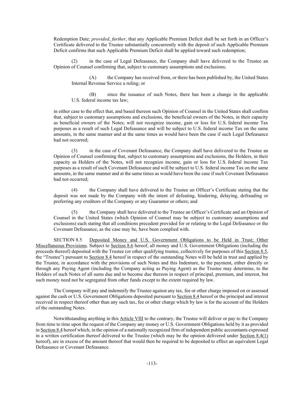 -113- Redemption Date; provided, further, that any Applicable Premium Deficit shall be set forth in an Officer’s Certificate delivered to the Trustee substantially concurrently with the deposit of such Applicable Premium Deficit confirms that such Applicable Premium Deficit shall be applied toward such redemption; (2) in the case of Legal Defeasance, the Company shall have delivered to the Trustee an Opinion of Counsel confirming that, subject to customary assumptions and exclusions; (A) the Company has received from, or there has been published by, the United States Internal Revenue Service a ruling; or (B) since the issuance of such Notes, there has been a change in the applicable U.S. federal income tax law; in either case to the effect that, and based thereon such Opinion of Counsel in the United States shall confirm that, subject to customary assumptions and exclusions, the beneficial owners of the Notes, in their capacity as beneficial owners of the Notes; will not recognize income, gain or loss for U.S. federal income Tax purposes as a result of such Legal Defeasance and will be subject to U.S. federal income Tax on the same amounts, in the same manner and at the same times as would have been the case if such Legal Defeasance had not occurred; (3) in the case of Covenant Defeasance, the Company shall have delivered to the Trustee an Opinion of Counsel confirming that, subject to customary assumptions and exclusions, the Holders, in their capacity as Holders of the Notes, will not recognize income, gain or loss for U.S. federal income Tax purposes as a result of such Covenant Defeasance and will be subject to U.S. federal income Tax on the same amounts, in the same manner and at the same times as would have been the case if such Covenant Defeasance had not occurred; (4) the Company shall have delivered to the Trustee an Officer’s Certificate stating that the deposit was not made by the Company with the intent of defeating, hindering, delaying, defrauding or preferring any creditors of the Company or any Guarantor or others; and (5) the Company shall have delivered to the Trustee an Officer’s Certificate and an Opinion of Counsel in the United States (which Opinion of Counsel may be subject to customary assumptions and exclusions) each stating that all conditions precedent provided for or relating to the Legal Defeasance or the Covenant Defeasance, as the case may be, have been complied with. SECTION 8.5 Deposited Money and U.S. Government Obligations to be Held in Trust; Other Miscellaneous Provisions. Subject to Section 8.6 hereof, all money and U.S. Government Obligations (including the proceeds thereof) deposited with the Trustee (or other qualifying trustee, collectively for purposes of this Section 8.5, the “Trustee”) pursuant to Section 8.4 hereof in respect of the outstanding Notes will be held in trust and applied by the Trustee, in accordance with the provisions of such Notes and this Indenture, to the payment, either directly or through any Paying Agent (including the Company acting as Paying Agent) as the Trustee may determine, to the Holders of such Notes of all sums due and to become due thereon in respect of principal, premium, and interest, but such money need not be segregated from other funds except to the extent required by law. The Company will pay and indemnify the Trustee against any tax, fee or other charge imposed on or assessed against the cash or U.S. Government Obligations deposited pursuant to Section 8.4 hereof or the principal and interest received in respect thereof other than any such tax, fee or other charge which by law is for the account of the Holders of the outstanding Notes. Notwithstanding anything in this Article VIII to the contrary, the Trustee will deliver or pay to the Company from time to time upon the request of the Company any money or U.S. Government Obligations held by it as provided in Section 8.4 hereof which, in the opinion of a nationally recognized firm of independent public accountants expressed in a written certification thereof delivered to the Trustee (which may be the opinion delivered under Section 8.4(1) hereof), are in excess of the amount thereof that would then be required to be deposited to effect an equivalent Legal Defeasance or Covenant Defeasance.