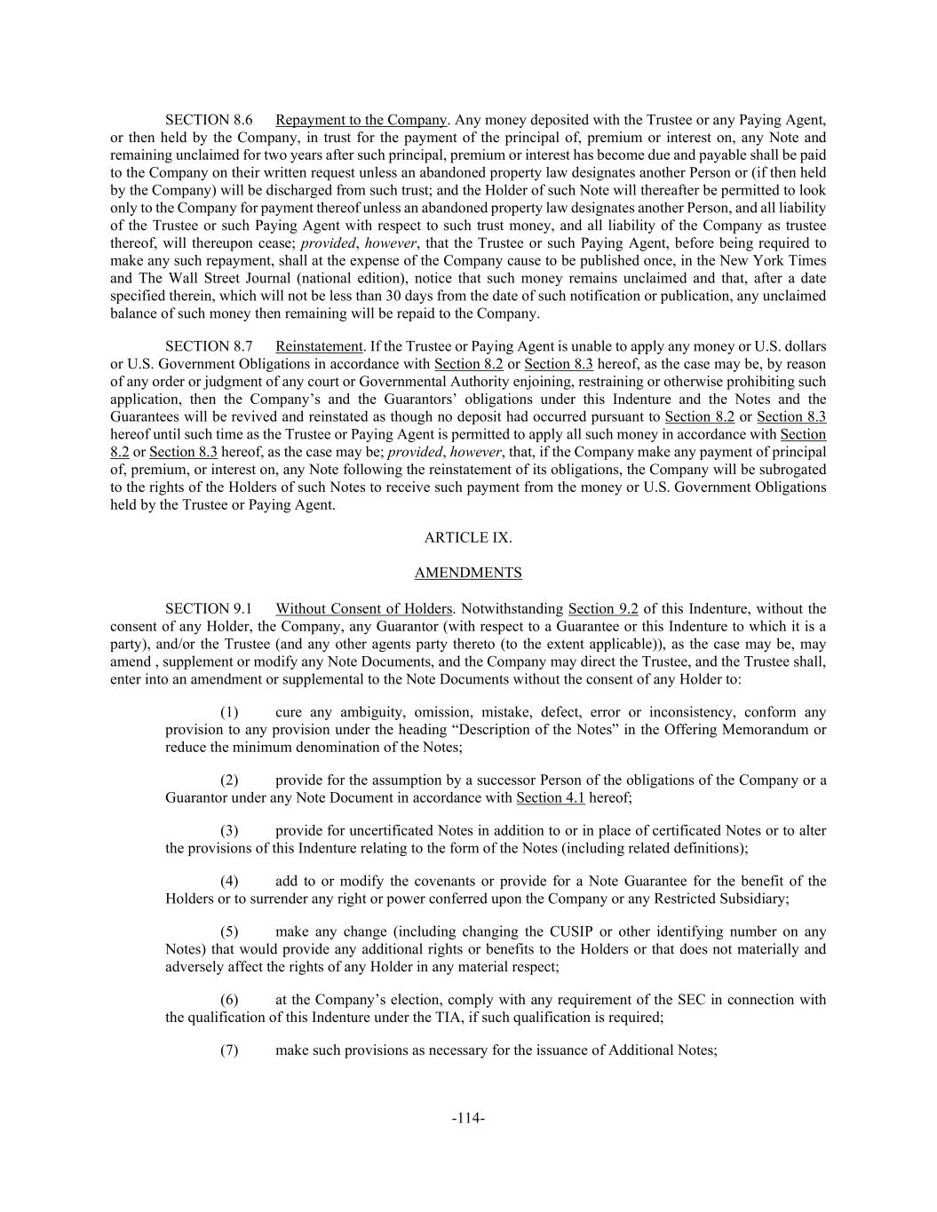 -114- SECTION 8.6 Repayment to the Company. Any money deposited with the Trustee or any Paying Agent, or then held by the Company, in trust for the payment of the principal of, premium or interest on, any Note and remaining unclaimed for two years after such principal, premium or interest has become due and payable shall be paid to the Company on their written request unless an abandoned property law designates another Person or (if then held by the Company) will be discharged from such trust; and the Holder of such Note will thereafter be permitted to look only to the Company for payment thereof unless an abandoned property law designates another Person, and all liability of the Trustee or such Paying Agent with respect to such trust money, and all liability of the Company as trustee thereof, will thereupon cease; provided, however, that the Trustee or such Paying Agent, before being required to make any such repayment, shall at the expense of the Company cause to be published once, in the New York Times and The Wall Street Journal (national edition), notice that such money remains unclaimed and that, after a date specified therein, which will not be less than 30 days from the date of such notification or publication, any unclaimed balance of such money then remaining will be repaid to the Company. SECTION 8.7 Reinstatement. If the Trustee or Paying Agent is unable to apply any money or U.S. dollars or U.S. Government Obligations in accordance with Section 8.2 or Section 8.3 hereof, as the case may be, by reason of any order or judgment of any court or Governmental Authority enjoining, restraining or otherwise prohibiting such application, then the Company’s and the Guarantors’ obligations under this Indenture and the Notes and the Guarantees will be revived and reinstated as though no deposit had occurred pursuant to Section 8.2 or Section 8.3 hereof until such time as the Trustee or Paying Agent is permitted to apply all such money in accordance with Section 8.2 or Section 8.3 hereof, as the case may be; provided, however, that, if the Company make any payment of principal of, premium, or interest on, any Note following the reinstatement of its obligations, the Company will be subrogated to the rights of the Holders of such Notes to receive such payment from the money or U.S. Government Obligations held by the Trustee or Paying Agent. ARTICLE IX. AMENDMENTS SECTION 9.1 Without Consent of Holders. Notwithstanding Section 9.2 of this Indenture, without the consent of any Holder, the Company, any Guarantor (with respect to a Guarantee or this Indenture to which it is a party), and/or the Trustee (and any other agents party thereto (to the extent applicable)), as the case may be, may amend , supplement or modify any Note Documents, and the Company may direct the Trustee, and the Trustee shall, enter into an amendment or supplemental to the Note Documents without the consent of any Holder to: (1) cure any ambiguity, omission, mistake, defect, error or inconsistency, conform any provision to any provision under the heading “Description of the Notes” in the Offering Memorandum or reduce the minimum denomination of the Notes; (2) provide for the assumption by a successor Person of the obligations of the Company or a Guarantor under any Note Document in accordance with Section 4.1 hereof; (3) provide for uncertificated Notes in addition to or in place of certificated Notes or to alter the provisions of this Indenture relating to the form of the Notes (including related definitions); (4) add to or modify the covenants or provide for a Note Guarantee for the benefit of the Holders or to surrender any right or power conferred upon the Company or any Restricted Subsidiary; (5) make any change (including changing the CUSIP or other identifying number on any Notes) that would provide any additional rights or benefits to the Holders or that does not materially and adversely affect the rights of any Holder in any material respect; (6) at the Company’s election, comply with any requirement of the SEC in connection with the qualification of this Indenture under the TIA, if such qualification is required; (7) make such provisions as necessary for the issuance of Additional Notes;