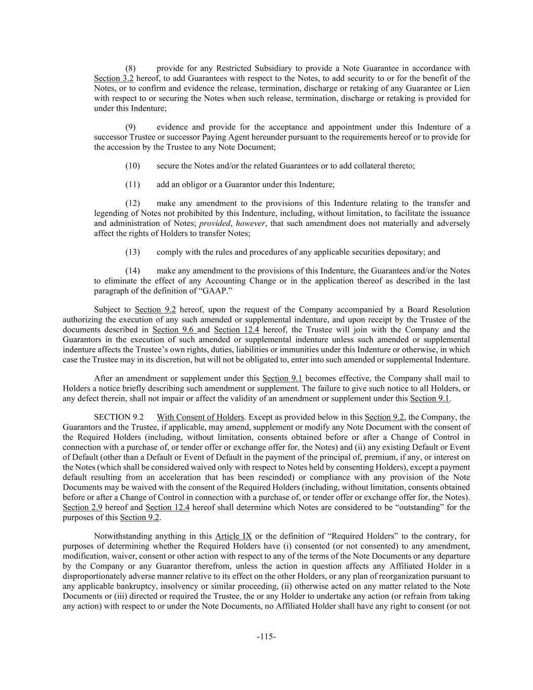 -115- (8) provide for any Restricted Subsidiary to provide a Note Guarantee in accordance with Section 3.2 hereof, to add Guarantees with respect to the Notes, to add security to or for the benefit of the Notes, or to confirm and evidence the release, termination, discharge or retaking of any Guarantee or Lien with respect to or securing the Notes when such release, termination, discharge or retaking is provided for under this Indenture; (9) evidence and provide for the acceptance and appointment under this Indenture of a successor Trustee or successor Paying Agent hereunder pursuant to the requirements hereof or to provide for the accession by the Trustee to any Note Document; (10) secure the Notes and/or the related Guarantees or to add collateral thereto; (11) add an obligor or a Guarantor under this Indenture; (12) make any amendment to the provisions of this Indenture relating to the transfer and legending of Notes not prohibited by this Indenture, including, without limitation, to facilitate the issuance and administration of Notes; provided, however, that such amendment does not materially and adversely affect the rights of Holders to transfer Notes; (13) comply with the rules and procedures of any applicable securities depositary; and (14) make any amendment to the provisions of this Indenture, the Guarantees and/or the Notes to eliminate the effect of any Accounting Change or in the application thereof as described in the last paragraph of the definition of “GAAP.” Subject to Section 9.2 hereof, upon the request of the Company accompanied by a Board Resolution authorizing the execution of any such amended or supplemental indenture, and upon receipt by the Trustee of the documents described in Section 9.6 and Section 12.4 hereof, the Trustee will join with the Company and the Guarantors in the execution of such amended or supplemental indenture unless such amended or supplemental indenture affects the Trustee’s own rights, duties, liabilities or immunities under this Indenture or otherwise, in which case the Trustee may in its discretion, but will not be obligated to, enter into such amended or supplemental Indenture. After an amendment or supplement under this Section 9.1 becomes effective, the Company shall mail to Holders a notice briefly describing such amendment or supplement. The failure to give such notice to all Holders, or any defect therein, shall not impair or affect the validity of an amendment or supplement under this Section 9.1. SECTION 9.2 With Consent of Holders. Except as provided below in this Section 9.2, the Company, the Guarantors and the Trustee, if applicable, may amend, supplement or modify any Note Document with the consent of the Required Holders (including, without limitation, consents obtained before or after a Change of Control in connection with a purchase of, or tender offer or exchange offer for, the Notes) and (ii) any existing Default or Event of Default (other than a Default or Event of Default in the payment of the principal of, premium, if any, or interest on the Notes (which shall be considered waived only with respect to Notes held by consenting Holders), except a payment default resulting from an acceleration that has been rescinded) or compliance with any provision of the Note Documents may be waived with the consent of the Required Holders (including, without limitation, consents obtained before or after a Change of Control in connection with a purchase of, or tender offer or exchange offer for, the Notes). Section 2.9 hereof and Section 12.4 hereof shall determine which Notes are considered to be “outstanding” for the purposes of this Section 9.2. Notwithstanding anything in this Article IX or the definition of “Required Holders” to the contrary, for purposes of determining whether the Required Holders have (i) consented (or not consented) to any amendment, modification, waiver, consent or other action with respect to any of the terms of the Note Documents or any departure by the Company or any Guarantor therefrom, unless the action in question affects any Affiliated Holder in a disproportionately adverse manner relative to its effect on the other Holders, or any plan of reorganization pursuant to any applicable bankruptcy, insolvency or similar proceeding, (ii) otherwise acted on any matter related to the Note Documents or (iii) directed or required the Trustee, the or any Holder to undertake any action (or refrain from taking any action) with respect to or under the Note Documents, no Affiliated Holder shall have any right to consent (or not