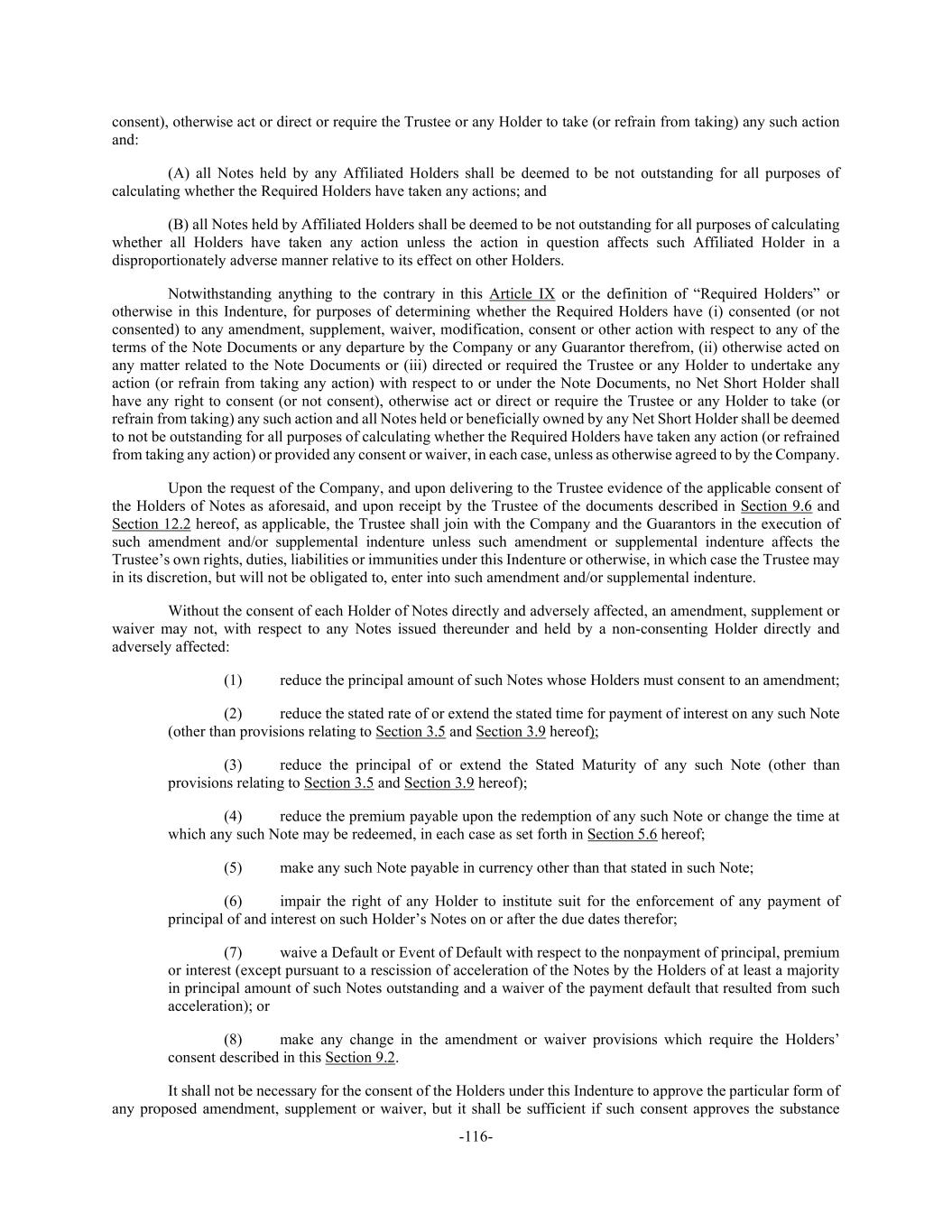 -116- consent), otherwise act or direct or require the Trustee or any Holder to take (or refrain from taking) any such action and: (A) all Notes held by any Affiliated Holders shall be deemed to be not outstanding for all purposes of calculating whether the Required Holders have taken any actions; and (B) all Notes held by Affiliated Holders shall be deemed to be not outstanding for all purposes of calculating whether all Holders have taken any action unless the action in question affects such Affiliated Holder in a disproportionately adverse manner relative to its effect on other Holders. Notwithstanding anything to the contrary in this Article IX or the definition of “Required Holders” or otherwise in this Indenture, for purposes of determining whether the Required Holders have (i) consented (or not consented) to any amendment, supplement, waiver, modification, consent or other action with respect to any of the terms of the Note Documents or any departure by the Company or any Guarantor therefrom, (ii) otherwise acted on any matter related to the Note Documents or (iii) directed or required the Trustee or any Holder to undertake any action (or refrain from taking any action) with respect to or under the Note Documents, no Net Short Holder shall have any right to consent (or not consent), otherwise act or direct or require the Trustee or any Holder to take (or refrain from taking) any such action and all Notes held or beneficially owned by any Net Short Holder shall be deemed to not be outstanding for all purposes of calculating whether the Required Holders have taken any action (or refrained from taking any action) or provided any consent or waiver, in each case, unless as otherwise agreed to by the Company. Upon the request of the Company, and upon delivering to the Trustee evidence of the applicable consent of the Holders of Notes as aforesaid, and upon receipt by the Trustee of the documents described in Section 9.6 and Section 12.2 hereof, as applicable, the Trustee shall join with the Company and the Guarantors in the execution of such amendment and/or supplemental indenture unless such amendment or supplemental indenture affects the Trustee’s own rights, duties, liabilities or immunities under this Indenture or otherwise, in which case the Trustee may in its discretion, but will not be obligated to, enter into such amendment and/or supplemental indenture. Without the consent of each Holder of Notes directly and adversely affected, an amendment, supplement or waiver may not, with respect to any Notes issued thereunder and held by a non-consenting Holder directly and adversely affected: (1) reduce the principal amount of such Notes whose Holders must consent to an amendment; (2) reduce the stated rate of or extend the stated time for payment of interest on any such Note (other than provisions relating to Section 3.5 and Section 3.9 hereof); (3) reduce the principal of or extend the Stated Maturity of any such Note (other than provisions relating to Section 3.5 and Section 3.9 hereof); (4) reduce the premium payable upon the redemption of any such Note or change the time at which any such Note may be redeemed, in each case as set forth in Section 5.6 hereof; (5) make any such Note payable in currency other than that stated in such Note; (6) impair the right of any Holder to institute suit for the enforcement of any payment of principal of and interest on such Holder’s Notes on or after the due dates therefor; (7) waive a Default or Event of Default with respect to the nonpayment of principal, premium or interest (except pursuant to a rescission of acceleration of the Notes by the Holders of at least a majority in principal amount of such Notes outstanding and a waiver of the payment default that resulted from such acceleration); or (8) make any change in the amendment or waiver provisions which require the Holders’ consent described in this Section 9.2. It shall not be necessary for the consent of the Holders under this Indenture to approve the particular form of any proposed amendment, supplement or waiver, but it shall be sufficient if such consent approves the substance