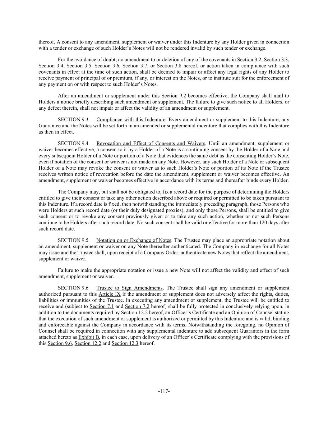 -117- thereof. A consent to any amendment, supplement or waiver under this Indenture by any Holder given in connection with a tender or exchange of such Holder’s Notes will not be rendered invalid by such tender or exchange. For the avoidance of doubt, no amendment to or deletion of any of the covenants in Section 3.2, Section 3.3, Section 3.4, Section 3.5, Section 3.6, Section 3.7, or Section 3.8 hereof, or action taken in compliance with such covenants in effect at the time of such action, shall be deemed to impair or affect any legal rights of any Holder to receive payment of principal of or premium, if any, or interest on the Notes, or to institute suit for the enforcement of any payment on or with respect to such Holder’s Notes. After an amendment or supplement under this Section 9.2 becomes effective, the Company shall mail to Holders a notice briefly describing such amendment or supplement. The failure to give such notice to all Holders, or any defect therein, shall not impair or affect the validity of an amendment or supplement. SECTION 9.3 Compliance with this Indenture. Every amendment or supplement to this Indenture, any Guarantee and the Notes will be set forth in an amended or supplemental indenture that complies with this Indenture as then in effect. SECTION 9.4 Revocation and Effect of Consents and Waivers. Until an amendment, supplement or waiver becomes effective, a consent to it by a Holder of a Note is a continuing consent by the Holder of a Note and every subsequent Holder of a Note or portion of a Note that evidences the same debt as the consenting Holder’s Note, even if notation of the consent or waiver is not made on any Note. However, any such Holder of a Note or subsequent Holder of a Note may revoke the consent or waiver as to such Holder’s Note or portion of its Note if the Trustee receives written notice of revocation before the date the amendment, supplement or waiver becomes effective. An amendment, supplement or waiver becomes effective in accordance with its terms and thereafter binds every Holder. The Company may, but shall not be obligated to, fix a record date for the purpose of determining the Holders entitled to give their consent or take any other action described above or required or permitted to be taken pursuant to this Indenture. If a record date is fixed, then notwithstanding the immediately preceding paragraph, those Persons who were Holders at such record date (or their duly designated proxies), and only those Persons, shall be entitled to give such consent or to revoke any consent previously given or to take any such action, whether or not such Persons continue to be Holders after such record date. No such consent shall be valid or effective for more than 120 days after such record date. SECTION 9.5 Notation on or Exchange of Notes. The Trustee may place an appropriate notation about an amendment, supplement or waiver on any Note thereafter authenticated. The Company in exchange for all Notes may issue and the Trustee shall, upon receipt of a Company Order, authenticate new Notes that reflect the amendment, supplement or waiver. Failure to make the appropriate notation or issue a new Note will not affect the validity and effect of such amendment, supplement or waiver. SECTION 9.6 Trustee to Sign Amendments. The Trustee shall sign any amendment or supplement authorized pursuant to this Article IX if the amendment or supplement does not adversely affect the rights, duties, liabilities or immunities of the Trustee. In executing any amendment or supplement, the Trustee will be entitled to receive and (subject to Section 7.1 and Section 7.2 hereof) shall be fully protected in conclusively relying upon, in addition to the documents required by Section 12.2 hereof, an Officer’s Certificate and an Opinion of Counsel stating that the execution of such amendment or supplement is authorized or permitted by this Indenture and is valid, binding and enforceable against the Company in accordance with its terms. Notwithstanding the foregoing, no Opinion of Counsel shall be required in connection with any supplemental indenture to add subsequent Guarantors in the form attached hereto as Exhibit B, in each case, upon delivery of an Officer’s Certificate complying with the provisions of this Section 9.6, Section 12.2 and Section 12.3 hereof.