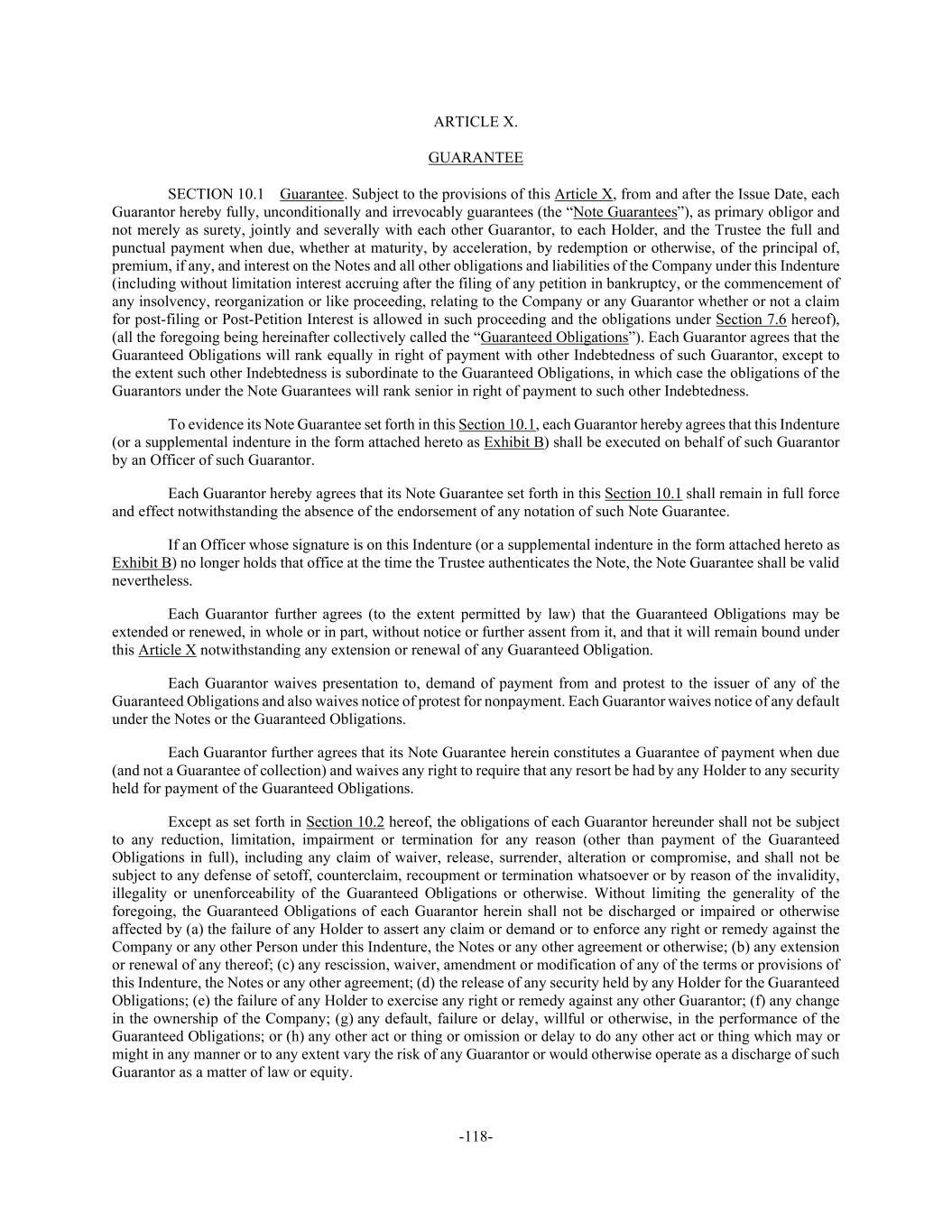 -118- ARTICLE X. GUARANTEE SECTION 10.1 Guarantee. Subject to the provisions of this Article X, from and after the Issue Date, each Guarantor hereby fully, unconditionally and irrevocably guarantees (the “Note Guarantees”), as primary obligor and not merely as surety, jointly and severally with each other Guarantor, to each Holder, and the Trustee the full and punctual payment when due, whether at maturity, by acceleration, by redemption or otherwise, of the principal of, premium, if any, and interest on the Notes and all other obligations and liabilities of the Company under this Indenture (including without limitation interest accruing after the filing of any petition in bankruptcy, or the commencement of any insolvency, reorganization or like proceeding, relating to the Company or any Guarantor whether or not a claim for post-filing or Post-Petition Interest is allowed in such proceeding and the obligations under Section 7.6 hereof), (all the foregoing being hereinafter collectively called the “Guaranteed Obligations”). Each Guarantor agrees that the Guaranteed Obligations will rank equally in right of payment with other Indebtedness of such Guarantor, except to the extent such other Indebtedness is subordinate to the Guaranteed Obligations, in which case the obligations of the Guarantors under the Note Guarantees will rank senior in right of payment to such other Indebtedness. To evidence its Note Guarantee set forth in this Section 10.1, each Guarantor hereby agrees that this Indenture (or a supplemental indenture in the form attached hereto as Exhibit B) shall be executed on behalf of such Guarantor by an Officer of such Guarantor. Each Guarantor hereby agrees that its Note Guarantee set forth in this Section 10.1 shall remain in full force and effect notwithstanding the absence of the endorsement of any notation of such Note Guarantee. If an Officer whose signature is on this Indenture (or a supplemental indenture in the form attached hereto as Exhibit B) no longer holds that office at the time the Trustee authenticates the Note, the Note Guarantee shall be valid nevertheless. Each Guarantor further agrees (to the extent permitted by law) that the Guaranteed Obligations may be extended or renewed, in whole or in part, without notice or further assent from it, and that it will remain bound under this Article X notwithstanding any extension or renewal of any Guaranteed Obligation. Each Guarantor waives presentation to, demand of payment from and protest to the issuer of any of the Guaranteed Obligations and also waives notice of protest for nonpayment. Each Guarantor waives notice of any default under the Notes or the Guaranteed Obligations. Each Guarantor further agrees that its Note Guarantee herein constitutes a Guarantee of payment when due (and not a Guarantee of collection) and waives any right to require that any resort be had by any Holder to any security held for payment of the Guaranteed Obligations. Except as set forth in Section 10.2 hereof, the obligations of each Guarantor hereunder shall not be subject to any reduction, limitation, impairment or termination for any reason (other than payment of the Guaranteed Obligations in full), including any claim of waiver, release, surrender, alteration or compromise, and shall not be subject to any defense of setoff, counterclaim, recoupment or termination whatsoever or by reason of the invalidity, illegality or unenforceability of the Guaranteed Obligations or otherwise. Without limiting the generality of the foregoing, the Guaranteed Obligations of each Guarantor herein shall not be discharged or impaired or otherwise affected by (a) the failure of any Holder to assert any claim or demand or to enforce any right or remedy against the Company or any other Person under this Indenture, the Notes or any other agreement or otherwise; (b) any extension or renewal of any thereof; (c) any rescission, waiver, amendment or modification of any of the terms or provisions of this Indenture, the Notes or any other agreement; (d) the release of any security held by any Holder for the Guaranteed Obligations; (e) the failure of any Holder to exercise any right or remedy against any other Guarantor; (f) any change in the ownership of the Company; (g) any default, failure or delay, willful or otherwise, in the performance of the Guaranteed Obligations; or (h) any other act or thing or omission or delay to do any other act or thing which may or might in any manner or to any extent vary the risk of any Guarantor or would otherwise operate as a discharge of such Guarantor as a matter of law or equity.