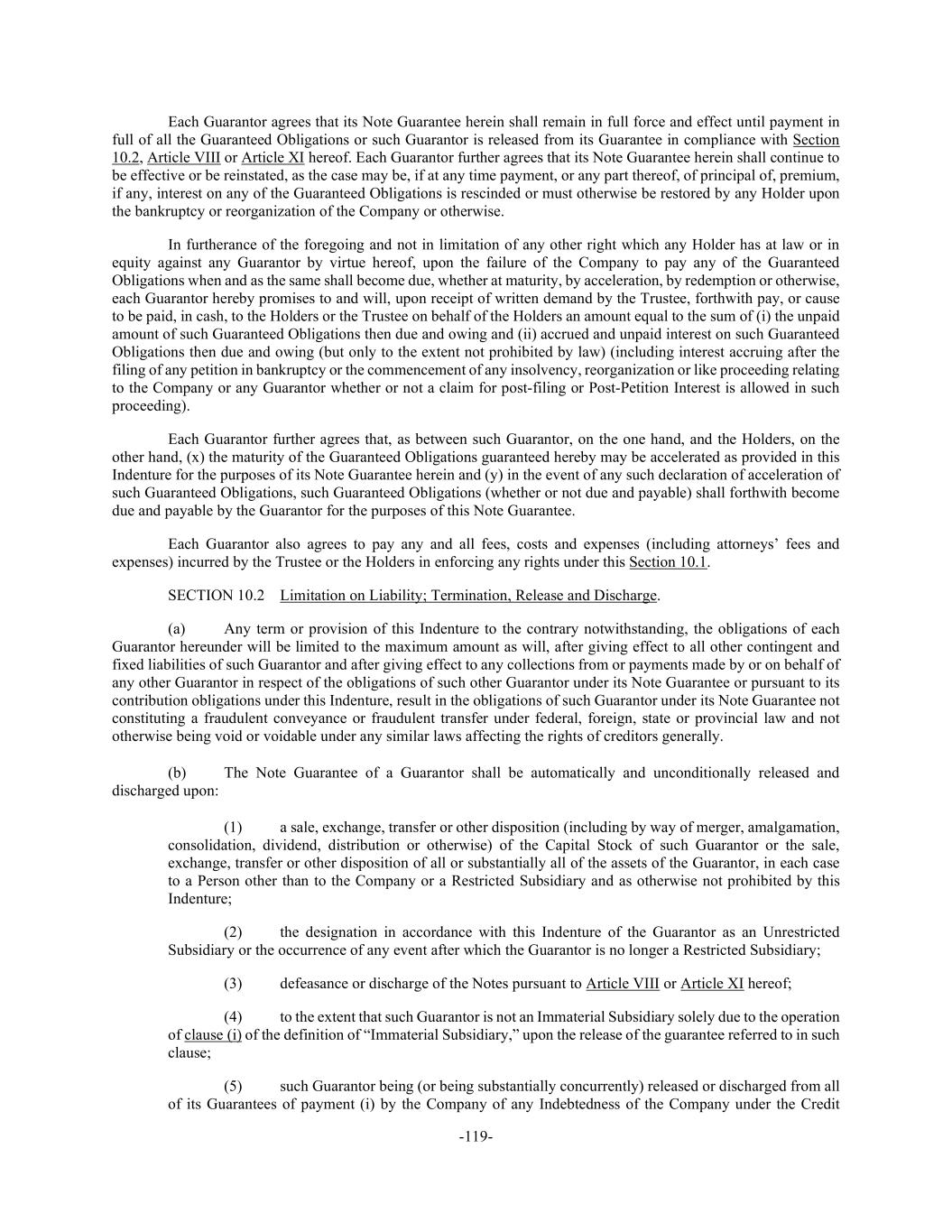 -119- Each Guarantor agrees that its Note Guarantee herein shall remain in full force and effect until payment in full of all the Guaranteed Obligations or such Guarantor is released from its Guarantee in compliance with Section 10.2, Article VIII or Article XI hereof. Each Guarantor further agrees that its Note Guarantee herein shall continue to be effective or be reinstated, as the case may be, if at any time payment, or any part thereof, of principal of, premium, if any, interest on any of the Guaranteed Obligations is rescinded or must otherwise be restored by any Holder upon the bankruptcy or reorganization of the Company or otherwise. In furtherance of the foregoing and not in limitation of any other right which any Holder has at law or in equity against any Guarantor by virtue hereof, upon the failure of the Company to pay any of the Guaranteed Obligations when and as the same shall become due, whether at maturity, by acceleration, by redemption or otherwise, each Guarantor hereby promises to and will, upon receipt of written demand by the Trustee, forthwith pay, or cause to be paid, in cash, to the Holders or the Trustee on behalf of the Holders an amount equal to the sum of (i) the unpaid amount of such Guaranteed Obligations then due and owing and (ii) accrued and unpaid interest on such Guaranteed Obligations then due and owing (but only to the extent not prohibited by law) (including interest accruing after the filing of any petition in bankruptcy or the commencement of any insolvency, reorganization or like proceeding relating to the Company or any Guarantor whether or not a claim for post-filing or Post-Petition Interest is allowed in such proceeding). Each Guarantor further agrees that, as between such Guarantor, on the one hand, and the Holders, on the other hand, (x) the maturity of the Guaranteed Obligations guaranteed hereby may be accelerated as provided in this Indenture for the purposes of its Note Guarantee herein and (y) in the event of any such declaration of acceleration of such Guaranteed Obligations, such Guaranteed Obligations (whether or not due and payable) shall forthwith become due and payable by the Guarantor for the purposes of this Note Guarantee. Each Guarantor also agrees to pay any and all fees, costs and expenses (including attorneys’ fees and expenses) incurred by the Trustee or the Holders in enforcing any rights under this Section 10.1. SECTION 10.2 Limitation on Liability; Termination, Release and Discharge. (a) Any term or provision of this Indenture to the contrary notwithstanding, the obligations of each Guarantor hereunder will be limited to the maximum amount as will, after giving effect to all other contingent and fixed liabilities of such Guarantor and after giving effect to any collections from or payments made by or on behalf of any other Guarantor in respect of the obligations of such other Guarantor under its Note Guarantee or pursuant to its contribution obligations under this Indenture, result in the obligations of such Guarantor under its Note Guarantee not constituting a fraudulent conveyance or fraudulent transfer under federal, foreign, state or provincial law and not otherwise being void or voidable under any similar laws affecting the rights of creditors generally. (b) The Note Guarantee of a Guarantor shall be automatically and unconditionally released and discharged upon: (1) a sale, exchange, transfer or other disposition (including by way of merger, amalgamation, consolidation, dividend, distribution or otherwise) of the Capital Stock of such Guarantor or the sale, exchange, transfer or other disposition of all or substantially all of the assets of the Guarantor, in each case to a Person other than to the Company or a Restricted Subsidiary and as otherwise not prohibited by this Indenture; (2) the designation in accordance with this Indenture of the Guarantor as an Unrestricted Subsidiary or the occurrence of any event after which the Guarantor is no longer a Restricted Subsidiary; (3) defeasance or discharge of the Notes pursuant to Article VIII or Article XI hereof; (4) to the extent that such Guarantor is not an Immaterial Subsidiary solely due to the operation of clause (i) of the definition of “Immaterial Subsidiary,” upon the release of the guarantee referred to in such clause; (5) such Guarantor being (or being substantially concurrently) released or discharged from all of its Guarantees of payment (i) by the Company of any Indebtedness of the Company under the Credit