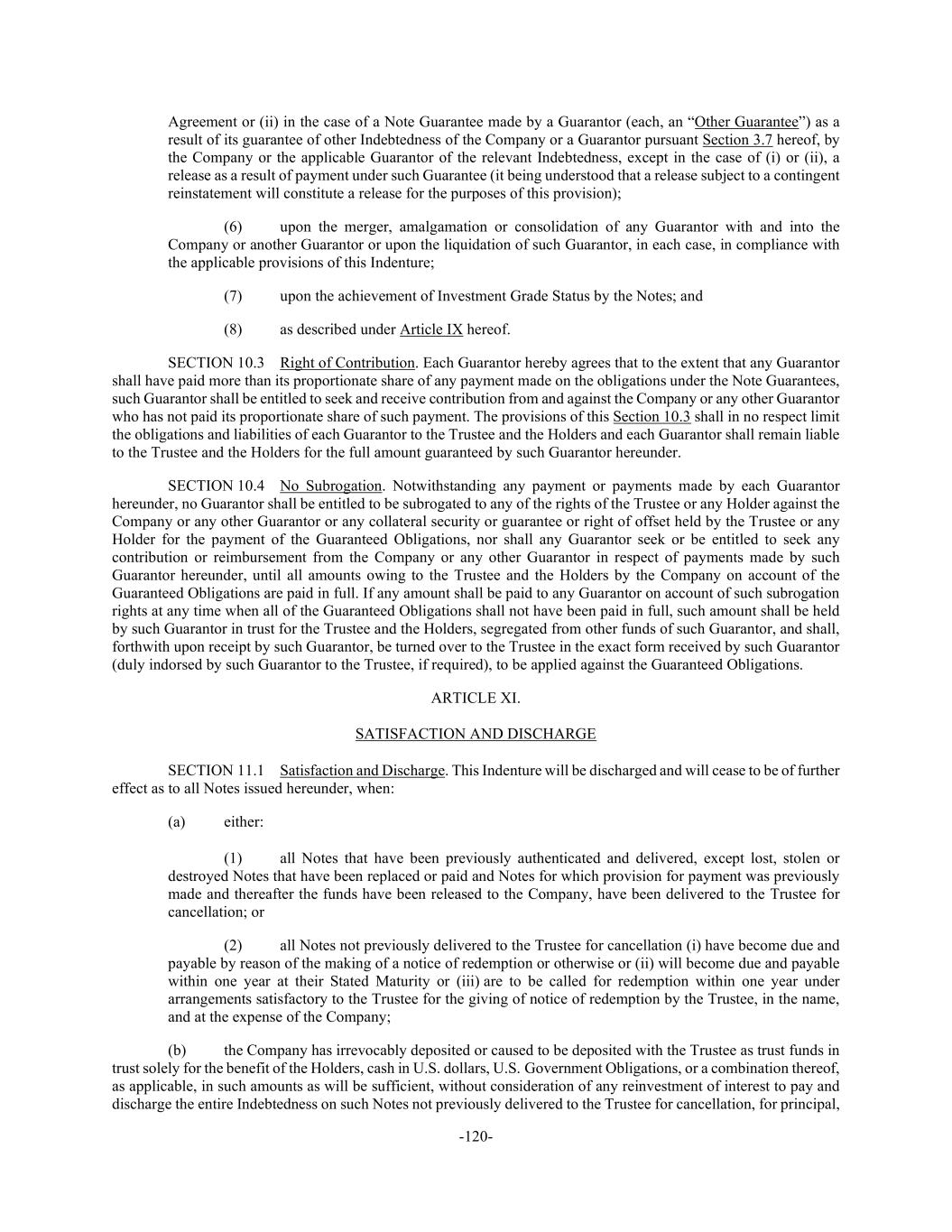-120- Agreement or (ii) in the case of a Note Guarantee made by a Guarantor (each, an “Other Guarantee”) as a result of its guarantee of other Indebtedness of the Company or a Guarantor pursuant Section 3.7 hereof, by the Company or the applicable Guarantor of the relevant Indebtedness, except in the case of (i) or (ii), a release as a result of payment under such Guarantee (it being understood that a release subject to a contingent reinstatement will constitute a release for the purposes of this provision); (6) upon the merger, amalgamation or consolidation of any Guarantor with and into the Company or another Guarantor or upon the liquidation of such Guarantor, in each case, in compliance with the applicable provisions of this Indenture; (7) upon the achievement of Investment Grade Status by the Notes; and (8) as described under Article IX hereof. SECTION 10.3 Right of Contribution. Each Guarantor hereby agrees that to the extent that any Guarantor shall have paid more than its proportionate share of any payment made on the obligations under the Note Guarantees, such Guarantor shall be entitled to seek and receive contribution from and against the Company or any other Guarantor who has not paid its proportionate share of such payment. The provisions of this Section 10.3 shall in no respect limit the obligations and liabilities of each Guarantor to the Trustee and the Holders and each Guarantor shall remain liable to the Trustee and the Holders for the full amount guaranteed by such Guarantor hereunder. SECTION 10.4 No Subrogation. Notwithstanding any payment or payments made by each Guarantor hereunder, no Guarantor shall be entitled to be subrogated to any of the rights of the Trustee or any Holder against the Company or any other Guarantor or any collateral security or guarantee or right of offset held by the Trustee or any Holder for the payment of the Guaranteed Obligations, nor shall any Guarantor seek or be entitled to seek any contribution or reimbursement from the Company or any other Guarantor in respect of payments made by such Guarantor hereunder, until all amounts owing to the Trustee and the Holders by the Company on account of the Guaranteed Obligations are paid in full. If any amount shall be paid to any Guarantor on account of such subrogation rights at any time when all of the Guaranteed Obligations shall not have been paid in full, such amount shall be held by such Guarantor in trust for the Trustee and the Holders, segregated from other funds of such Guarantor, and shall, forthwith upon receipt by such Guarantor, be turned over to the Trustee in the exact form received by such Guarantor (duly indorsed by such Guarantor to the Trustee, if required), to be applied against the Guaranteed Obligations. ARTICLE XI. SATISFACTION AND DISCHARGE SECTION 11.1 Satisfaction and Discharge. This Indenture will be discharged and will cease to be of further effect as to all Notes issued hereunder, when: (a) either: (1) all Notes that have been previously authenticated and delivered, except lost, stolen or destroyed Notes that have been replaced or paid and Notes for which provision for payment was previously made and thereafter the funds have been released to the Company, have been delivered to the Trustee for cancellation; or (2) all Notes not previously delivered to the Trustee for cancellation (i) have become due and payable by reason of the making of a notice of redemption or otherwise or (ii) will become due and payable within one year at their Stated Maturity or (iii) are to be called for redemption within one year under arrangements satisfactory to the Trustee for the giving of notice of redemption by the Trustee, in the name, and at the expense of the Company; (b) the Company has irrevocably deposited or caused to be deposited with the Trustee as trust funds in trust solely for the benefit of the Holders, cash in U.S. dollars, U.S. Government Obligations, or a combination thereof, as applicable, in such amounts as will be sufficient, without consideration of any reinvestment of interest to pay and discharge the entire Indebtedness on such Notes not previously delivered to the Trustee for cancellation, for principal,