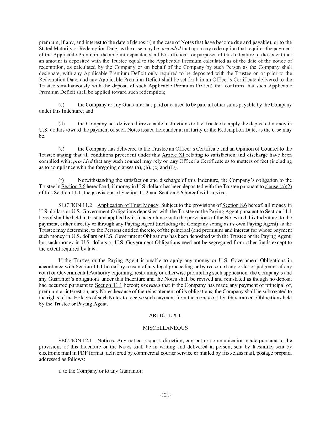 -121- premium, if any, and interest to the date of deposit (in the case of Notes that have become due and payable), or to the Stated Maturity or Redemption Date, as the case may be; provided that upon any redemption that requires the payment of the Applicable Premium, the amount deposited shall be sufficient for purposes of this Indenture to the extent that an amount is deposited with the Trustee equal to the Applicable Premium calculated as of the date of the notice of redemption, as calculated by the Company or on behalf of the Company by such Person as the Company shall designate, with any Applicable Premium Deficit only required to be deposited with the Trustee on or prior to the Redemption Date, and any Applicable Premium Deficit shall be set forth in an Officer’s Certificate delivered to the Trustee simultaneously with the deposit of such Applicable Premium Deficit) that confirms that such Applicable Premium Deficit shall be applied toward such redemption; (c) the Company or any Guarantor has paid or caused to be paid all other sums payable by the Company under this Indenture; and (d) the Company has delivered irrevocable instructions to the Trustee to apply the deposited money in U.S. dollars toward the payment of such Notes issued hereunder at maturity or the Redemption Date, as the case may be. (e) the Company has delivered to the Trustee an Officer’s Certificate and an Opinion of Counsel to the Trustee stating that all conditions precedent under this Article XI relating to satisfaction and discharge have been complied with; provided that any such counsel may rely on any Officer’s Certificate as to matters of fact (including as to compliance with the foregoing clauses (a), (b), (c) and (D). (f) Notwithstanding the satisfaction and discharge of this Indenture, the Company’s obligation to the Trustee in Section 7.6 hereof and, if money in U.S. dollars has been deposited with the Trustee pursuant to clause (a)(2) of this Section 11.1, the provisions of Section 11.2 and Section 8.6 hereof will survive. SECTION 11.2 Application of Trust Money. Subject to the provisions of Section 8.6 hereof, all money in U.S. dollars or U.S. Government Obligations deposited with the Trustee or the Paying Agent pursuant to Section 11.1 hereof shall be held in trust and applied by it, in accordance with the provisions of the Notes and this Indenture, to the payment, either directly or through any Paying Agent (including the Company acting as its own Paying Agent) as the Trustee may determine, to the Persons entitled thereto, of the principal (and premium) and interest for whose payment such money in U.S. dollars or U.S. Government Obligations has been deposited with the Trustee or the Paying Agent; but such money in U.S. dollars or U.S. Government Obligations need not be segregated from other funds except to the extent required by law. If the Trustee or the Paying Agent is unable to apply any money or U.S. Government Obligations in accordance with Section 11.1 hereof by reason of any legal proceeding or by reason of any order or judgment of any court or Governmental Authority enjoining, restraining or otherwise prohibiting such application, the Company’s and any Guarantor’s obligations under this Indenture and the Notes shall be revived and reinstated as though no deposit had occurred pursuant to Section 11.1 hereof; provided that if the Company has made any payment of principal of, premium or interest on, any Notes because of the reinstatement of its obligations, the Company shall be subrogated to the rights of the Holders of such Notes to receive such payment from the money or U.S. Government Obligations held by the Trustee or Paying Agent. ARTICLE XII. MISCELLANEOUS SECTION 12.1 Notices. Any notice, request, direction, consent or communication made pursuant to the provisions of this Indenture or the Notes shall be in writing and delivered in person, sent by facsimile, sent by electronic mail in PDF format, delivered by commercial courier service or mailed by first-class mail, postage prepaid, addressed as follows: if to the Company or to any Guarantor: