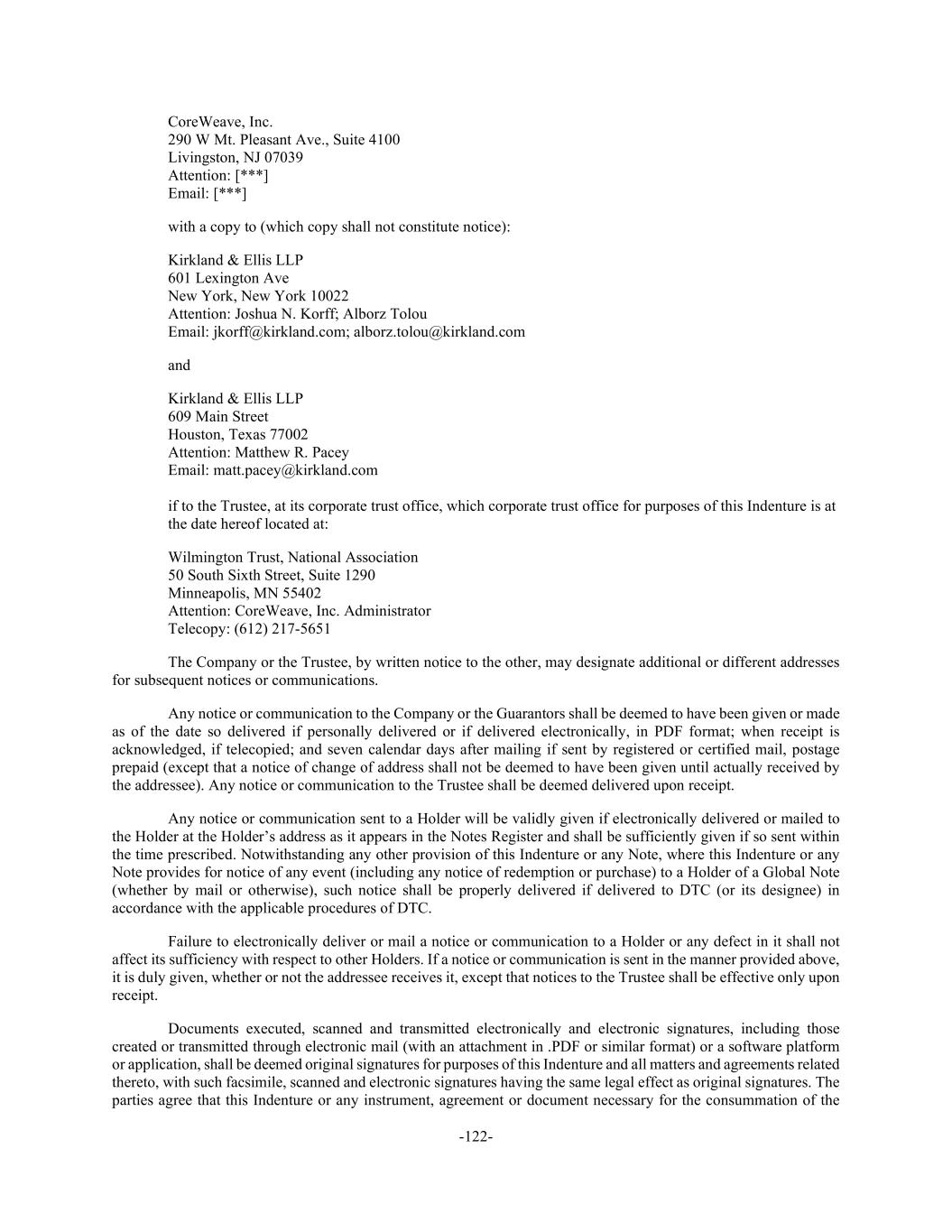 -122- CoreWeave, Inc. 290 W Mt. Pleasant Ave., Suite 4100 Livingston, NJ 07039 Attention: [***] Email: [***] with a copy to (which copy shall not constitute notice): Kirkland & Ellis LLP 601 Lexington Ave New York, New York 10022 Attention: Joshua N. Korff; Alborz Tolou Email: jkorff@kirkland.com; alborz.tolou@kirkland.com and Kirkland & Ellis LLP 609 Main Street Houston, Texas 77002 Attention: Matthew R. Pacey Email: matt.pacey@kirkland.com if to the Trustee, at its corporate trust office, which corporate trust office for purposes of this Indenture is at the date hereof located at: Wilmington Trust, National Association 50 South Sixth Street, Suite 1290 Minneapolis, MN 55402 Attention: CoreWeave, Inc. Administrator Telecopy: (612) 217-5651 The Company or the Trustee, by written notice to the other, may designate additional or different addresses for subsequent notices or communications. Any notice or communication to the Company or the Guarantors shall be deemed to have been given or made as of the date so delivered if personally delivered or if delivered electronically, in PDF format; when receipt is acknowledged, if telecopied; and seven calendar days after mailing if sent by registered or certified mail, postage prepaid (except that a notice of change of address shall not be deemed to have been given until actually received by the addressee). Any notice or communication to the Trustee shall be deemed delivered upon receipt. Any notice or communication sent to a Holder will be validly given if electronically delivered or mailed to the Holder at the Holder’s address as it appears in the Notes Register and shall be sufficiently given if so sent within the time prescribed. Notwithstanding any other provision of this Indenture or any Note, where this Indenture or any Note provides for notice of any event (including any notice of redemption or purchase) to a Holder of a Global Note (whether by mail or otherwise), such notice shall be properly delivered if delivered to DTC (or its designee) in accordance with the applicable procedures of DTC. Failure to electronically deliver or mail a notice or communication to a Holder or any defect in it shall not affect its sufficiency with respect to other Holders. If a notice or communication is sent in the manner provided above, it is duly given, whether or not the addressee receives it, except that notices to the Trustee shall be effective only upon receipt. Documents executed, scanned and transmitted electronically and electronic signatures, including those created or transmitted through electronic mail (with an attachment in .PDF or similar format) or a software platform or application, shall be deemed original signatures for purposes of this Indenture and all matters and agreements related thereto, with such facsimile, scanned and electronic signatures having the same legal effect as original signatures. The parties agree that this Indenture or any instrument, agreement or document necessary for the consummation of the