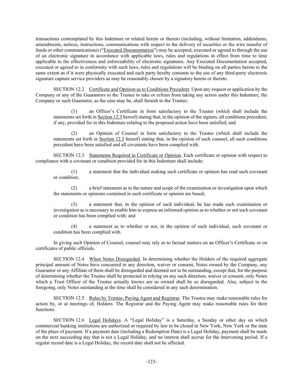 -123- transactions contemplated by this Indenture or related hereto or thereto (including, without limitation, addendums, amendments, notices, instructions, communications with respect to the delivery of securities or the wire transfer of funds or other communications) (“Executed Documentation”) may be accepted, executed or agreed to through the use of an electronic signature in accordance with applicable laws, rules and regulations in effect from time to time applicable to the effectiveness and enforceability of electronic signatures. Any Executed Documentation accepted, executed or agreed to in conformity with such laws, rules and regulations will be binding on all parties hereto to the same extent as if it were physically executed and each party hereby consents to the use of any third-party electronic signature capture service providers as may be reasonably chosen by a signatory hereto or thereto. SECTION 12.2 Certificate and Opinion as to Conditions Precedent. Upon any request or application by the Company or any of the Guarantors to the Trustee to take or refrain from taking any action under this Indenture, the Company or such Guarantor, as the case may be, shall furnish to the Trustee: (1) an Officer’s Certificate in form satisfactory to the Trustee (which shall include the statements set forth in Section 12.3 hereof) stating that, in the opinion of the signers, all conditions precedent, if any, provided for in this Indenture relating to the proposed action have been satisfied; and (2) an Opinion of Counsel in form satisfactory to the Trustee (which shall include the statements set forth in Section 12.3 hereof) stating that, in the opinion of such counsel, all such conditions precedent have been satisfied and all covenants have been complied with. SECTION 12.3 Statements Required in Certificate or Opinion. Each certificate or opinion with respect to compliance with a covenant or condition provided for in this Indenture shall include: (1) a statement that the individual making such certificate or opinion has read such covenant or condition; (2) a brief statement as to the nature and scope of the examination or investigation upon which the statements or opinions contained in such certificate or opinion are based; (3) a statement that, in the opinion of such individual, he has made such examination or investigation as is necessary to enable him to express an informed opinion as to whether or not such covenant or condition has been complied with; and (4) a statement as to whether or not, in the opinion of such individual, such covenant or condition has been complied with. In giving such Opinion of Counsel, counsel may rely as to factual matters on an Officer’s Certificate or on certificates of public officials. SECTION 12.4 When Notes Disregarded. In determining whether the Holders of the required aggregate principal amount of Notes have concurred in any direction, waiver or consent, Notes owned by the Company, any Guarantor or any Affiliate of them shall be disregarded and deemed not to be outstanding, except that, for the purpose of determining whether the Trustee shall be protected in relying on any such direction, waiver or consent, only Notes which a Trust Officer of the Trustee actually knows are so owned shall be so disregarded. Also, subject to the foregoing, only Notes outstanding at the time shall be considered in any such determination. SECTION 12.5 Rules by Trustee, Paying Agent and Registrar. The Trustee may make reasonable rules for action by, or at meetings of, Holders. The Registrar and the Paying Agent may make reasonable rules for their functions. SECTION 12.6 Legal Holidays. A “Legal Holiday” is a Saturday, a Sunday or other day on which commercial banking institutions are authorized or required by law to be closed in New York, New York or the state of the place of payment. If a payment date (including a Redemption Date) is a Legal Holiday, payment shall be made on the next succeeding day that is not a Legal Holiday, and no interest shall accrue for the intervening period. If a regular record date is a Legal Holiday, the record date shall not be affected.
