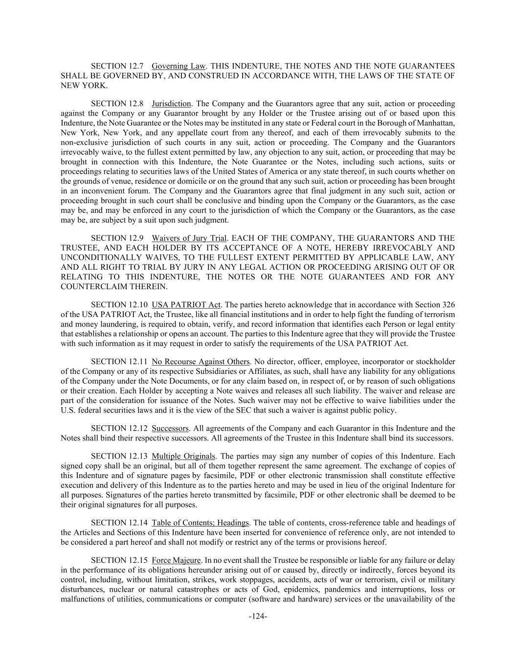 -124- SECTION 12.7 Governing Law. THIS INDENTURE, THE NOTES AND THE NOTE GUARANTEES SHALL BE GOVERNED BY, AND CONSTRUED IN ACCORDANCE WITH, THE LAWS OF THE STATE OF NEW YORK. SECTION 12.8 Jurisdiction. The Company and the Guarantors agree that any suit, action or proceeding against the Company or any Guarantor brought by any Holder or the Trustee arising out of or based upon this Indenture, the Note Guarantee or the Notes may be instituted in any state or Federal court in the Borough of Manhattan, New York, New York, and any appellate court from any thereof, and each of them irrevocably submits to the non-exclusive jurisdiction of such courts in any suit, action or proceeding. The Company and the Guarantors irrevocably waive, to the fullest extent permitted by law, any objection to any suit, action, or proceeding that may be brought in connection with this Indenture, the Note Guarantee or the Notes, including such actions, suits or proceedings relating to securities laws of the United States of America or any state thereof, in such courts whether on the grounds of venue, residence or domicile or on the ground that any such suit, action or proceeding has been brought in an inconvenient forum. The Company and the Guarantors agree that final judgment in any such suit, action or proceeding brought in such court shall be conclusive and binding upon the Company or the Guarantors, as the case may be, and may be enforced in any court to the jurisdiction of which the Company or the Guarantors, as the case may be, are subject by a suit upon such judgment. SECTION 12.9 Waivers of Jury Trial. EACH OF THE COMPANY, THE GUARANTORS AND THE TRUSTEE, AND EACH HOLDER BY ITS ACCEPTANCE OF A NOTE, HEREBY IRREVOCABLY AND UNCONDITIONALLY WAIVES, TO THE FULLEST EXTENT PERMITTED BY APPLICABLE LAW, ANY AND ALL RIGHT TO TRIAL BY JURY IN ANY LEGAL ACTION OR PROCEEDING ARISING OUT OF OR RELATING TO THIS INDENTURE, THE NOTES OR THE NOTE GUARANTEES AND FOR ANY COUNTERCLAIM THEREIN. SECTION 12.10 USA PATRIOT Act. The parties hereto acknowledge that in accordance with Section 326 of the USA PATRIOT Act, the Trustee, like all financial institutions and in order to help fight the funding of terrorism and money laundering, is required to obtain, verify, and record information that identifies each Person or legal entity that establishes a relationship or opens an account. The parties to this Indenture agree that they will provide the Trustee with such information as it may request in order to satisfy the requirements of the USA PATRIOT Act. SECTION 12.11 No Recourse Against Others. No director, officer, employee, incorporator or stockholder of the Company or any of its respective Subsidiaries or Affiliates, as such, shall have any liability for any obligations of the Company under the Note Documents, or for any claim based on, in respect of, or by reason of such obligations or their creation. Each Holder by accepting a Note waives and releases all such liability. The waiver and release are part of the consideration for issuance of the Notes. Such waiver may not be effective to waive liabilities under the U.S. federal securities laws and it is the view of the SEC that such a waiver is against public policy. SECTION 12.12 Successors. All agreements of the Company and each Guarantor in this Indenture and the Notes shall bind their respective successors. All agreements of the Trustee in this Indenture shall bind its successors. SECTION 12.13 Multiple Originals. The parties may sign any number of copies of this Indenture. Each signed copy shall be an original, but all of them together represent the same agreement. The exchange of copies of this Indenture and of signature pages by facsimile, PDF or other electronic transmission shall constitute effective execution and delivery of this Indenture as to the parties hereto and may be used in lieu of the original Indenture for all purposes. Signatures of the parties hereto transmitted by facsimile, PDF or other electronic shall be deemed to be their original signatures for all purposes. SECTION 12.14 Table of Contents; Headings. The table of contents, cross-reference table and headings of the Articles and Sections of this Indenture have been inserted for convenience of reference only, are not intended to be considered a part hereof and shall not modify or restrict any of the terms or provisions hereof. SECTION 12.15 Force Majeure. In no event shall the Trustee be responsible or liable for any failure or delay in the performance of its obligations hereunder arising out of or caused by, directly or indirectly, forces beyond its control, including, without limitation, strikes, work stoppages, accidents, acts of war or terrorism, civil or military disturbances, nuclear or natural catastrophes or acts of God, epidemics, pandemics and interruptions, loss or malfunctions of utilities, communications or computer (software and hardware) services or the unavailability of the