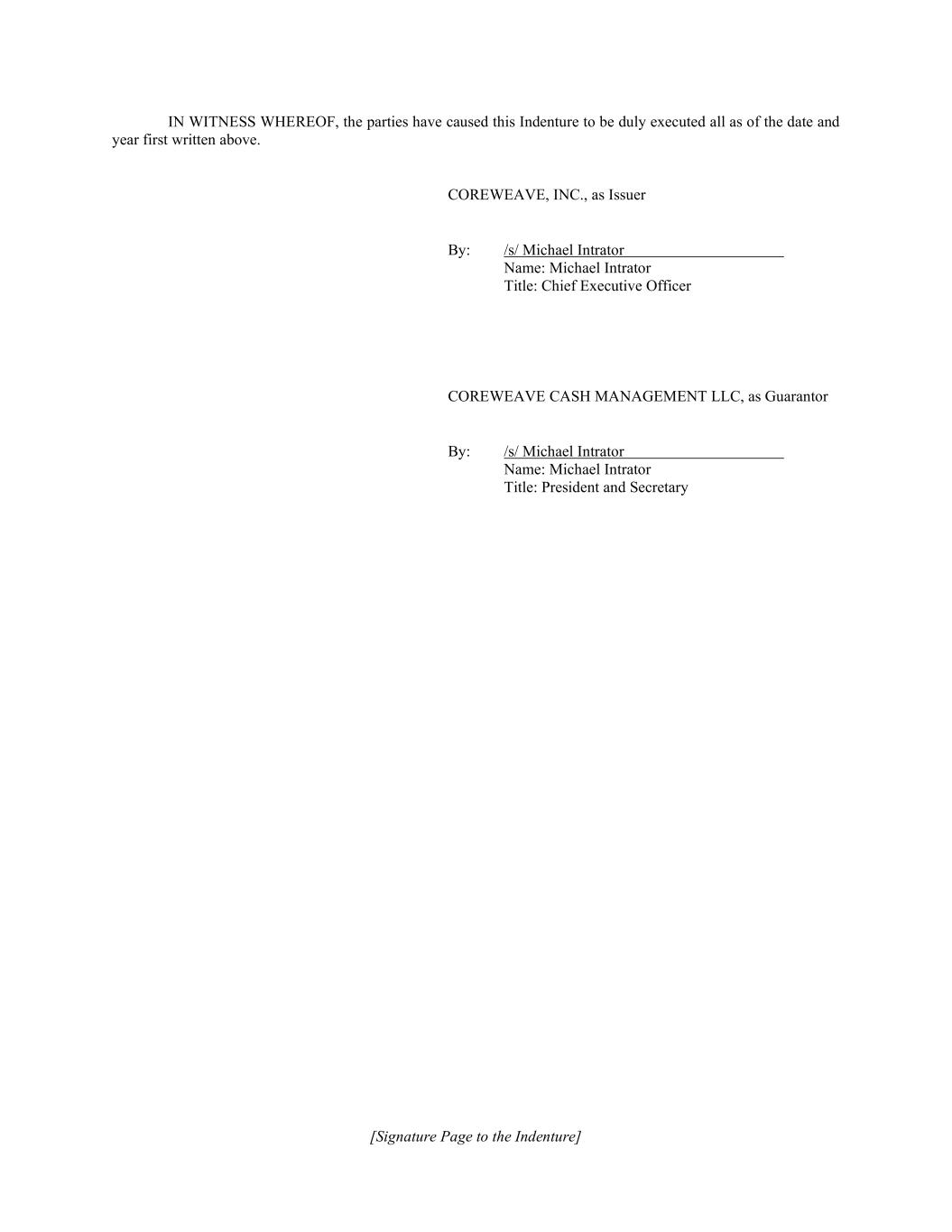[Signature Page to the Indenture] IN WITNESS WHEREOF, the parties have caused this Indenture to be duly executed all as of the date and year first written above. COREWEAVE, INC., as Issuer By: /s/ Michael Intrator Name: Michael Intrator Title: Chief Executive Officer COREWEAVE CASH MANAGEMENT LLC, as Guarantor By: /s/ Michael Intrator Name: Michael Intrator Title: President and Secretary