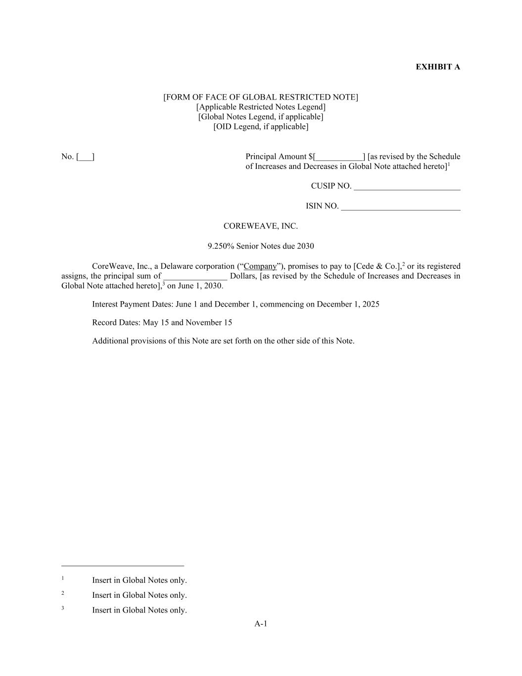 A-1 EXHIBIT A [FORM OF FACE OF GLOBAL RESTRICTED NOTE] [Applicable Restricted Notes Legend] [Global Notes Legend, if applicable] [OID Legend, if applicable] No. [___] Principal Amount $[___________] [as revised by the Schedule of Increases and Decreases in Global Note attached hereto]1 CUSIP NO. _________________________ ISIN NO. ____________________________ COREWEAVE, INC. 9.250% Senior Notes due 2030 CoreWeave, Inc., a Delaware corporation (“Company”), promises to pay to [Cede & Co.],2 or its registered assigns, the principal sum of _______________ Dollars, [as revised by the Schedule of Increases and Decreases in Global Note attached hereto],3 on June 1, 2030. Interest Payment Dates: June 1 and December 1, commencing on December 1, 2025 Record Dates: May 15 and November 15 Additional provisions of this Note are set forth on the other side of this Note. 1 Insert in Global Notes only. 2 Insert in Global Notes only. 3 Insert in Global Notes only.