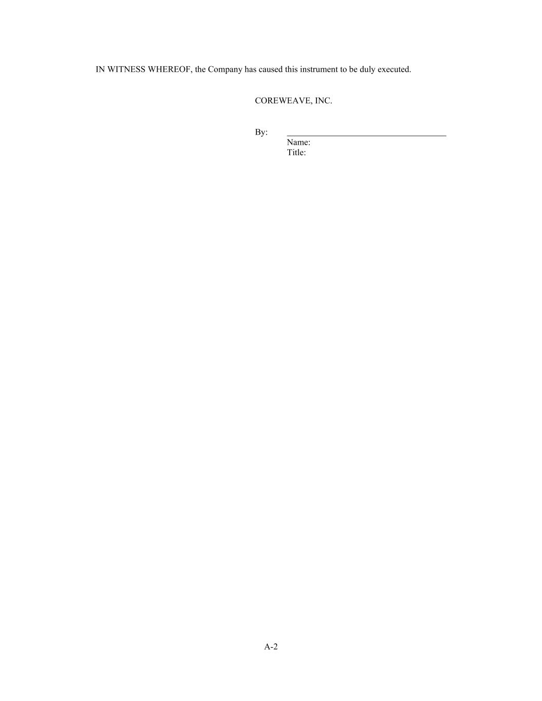 A-2 IN WITNESS WHEREOF, the Company has caused this instrument to be duly executed. COREWEAVE, INC. By: Name: Title: