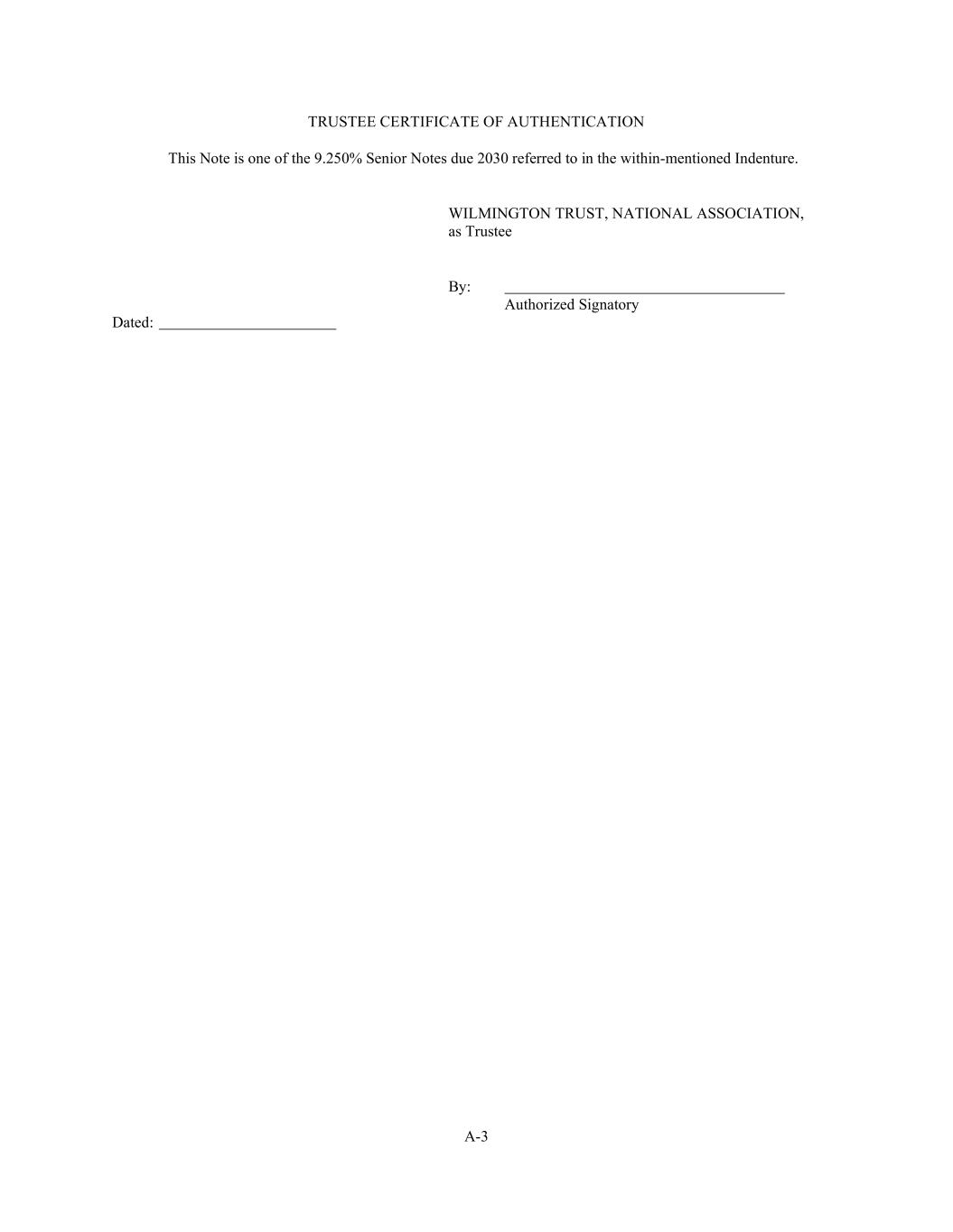 A-3 TRUSTEE CERTIFICATE OF AUTHENTICATION This Note is one of the 9.250% Senior Notes due 2030 referred to in the within-mentioned Indenture. WILMINGTON TRUST, NATIONAL ASSOCIATION, as Trustee By: Authorized Signatory Dated: