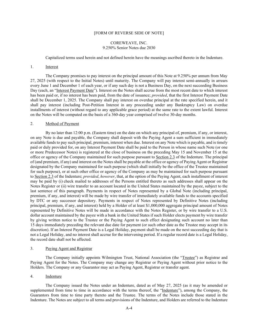 A-4 [FORM OF REVERSE SIDE OF NOTE] COREWEAVE, INC. 9.250% Senior Notes due 2030 Capitalized terms used herein and not defined herein have the meanings ascribed thereto in the Indenture. 1. Interest The Company promises to pay interest on the principal amount of this Note at 9.250% per annum from May 27, 2025 (with respect to the Initial Notes) until maturity. The Company will pay interest semi-annually in arrears every June 1 and December 1 of each year, or if any such day is not a Business Day, on the next succeeding Business Day (each, an “Interest Payment Date”). Interest on the Notes shall accrue from the most recent date to which interest has been paid or, if no interest has been paid, from the date of issuance; provided, that the first Interest Payment Date shall be December 1, 2025. The Company shall pay interest on overdue principal at the rate specified herein, and it shall pay interest (including Post-Petition Interest in any proceeding under any Bankruptcy Law) on overdue installments of interest (without regard to any applicable grace period) at the same rate to the extent lawful. Interest on the Notes will be computed on the basis of a 360-day year comprised of twelve 30-day months. 2. Method of Payment By no later than 12:00 p.m. (Eastern time) on the date on which any principal of, premium, if any, or interest, on any Note is due and payable, the Company shall deposit with the Paying Agent a sum sufficient in immediately available funds to pay such principal, premium, interest when due. Interest on any Note which is payable, and is timely paid or duly provided for, on any Interest Payment Date shall be paid to the Person in whose name such Note (or one or more Predecessor Notes) is registered at the close of business on the preceding May 15 and November 15 at the office or agency of the Company maintained for such purpose pursuant to Section 2.3 of the Indenture. The principal of (and premium, if any) and interest on the Notes shall be payable at the office or agency of Paying Agent or Registrar designated by the Company maintained for such purpose (which shall initially be the office of the Trustee maintained for such purpose), or at such other office or agency of the Company as may be maintained for such purpose pursuant to Section 2.3 of the Indenture; provided, however, that, at the option of the Paying Agent, each installment of interest may be paid by (i) check mailed to addresses of the Persons entitled thereto as such addresses shall appear on the Notes Register or (ii) wire transfer to an account located in the United States maintained by the payee, subject to the last sentence of this paragraph. Payments in respect of Notes represented by a Global Note (including principal, premium, if any, and interest) will be made by wire transfer of immediately available funds to the accounts specified by DTC or any successor depository. Payments in respect of Notes represented by Definitive Notes (including principal, premium, if any, and interest) held by a Holder of at least $1,000,000 aggregate principal amount of Notes represented by Definitive Notes will be made in accordance with the Notes Register, or by wire transfer to a U.S. dollar account maintained by the payee with a bank in the United States if such Holder elects payment by wire transfer by giving written notice to the Trustee or the Paying Agent to such effect designating such account no later than 15 days immediately preceding the relevant due date for payment (or such other date as the Trustee may accept in its discretion). If an Interest Payment Date is a Legal Holiday, payment shall be made on the next succeeding day that is not a Legal Holiday, and no interest shall accrue for the intervening period. If a regular record date is a Legal Holiday, the record date shall not be affected. 3. Paying Agent and Registrar The Company initially appoints Wilmington Trust, National Association (the “Trustee”) as Registrar and Paying Agent for the Notes. The Company may change any Registrar or Paying Agent without prior notice to the Holders. The Company or any Guarantor may act as Paying Agent, Registrar or transfer agent. 4. Indenture The Company issued the Notes under an Indenture, dated as of May 27, 2025 (as it may be amended or supplemented from time to time in accordance with the terms thereof, the “Indenture”), among the Company, the Guarantors from time to time party thereto and the Trustee. The terms of the Notes include those stated in the Indenture. The Notes are subject to all terms and provisions of the Indenture, and Holders are referred to the Indenture