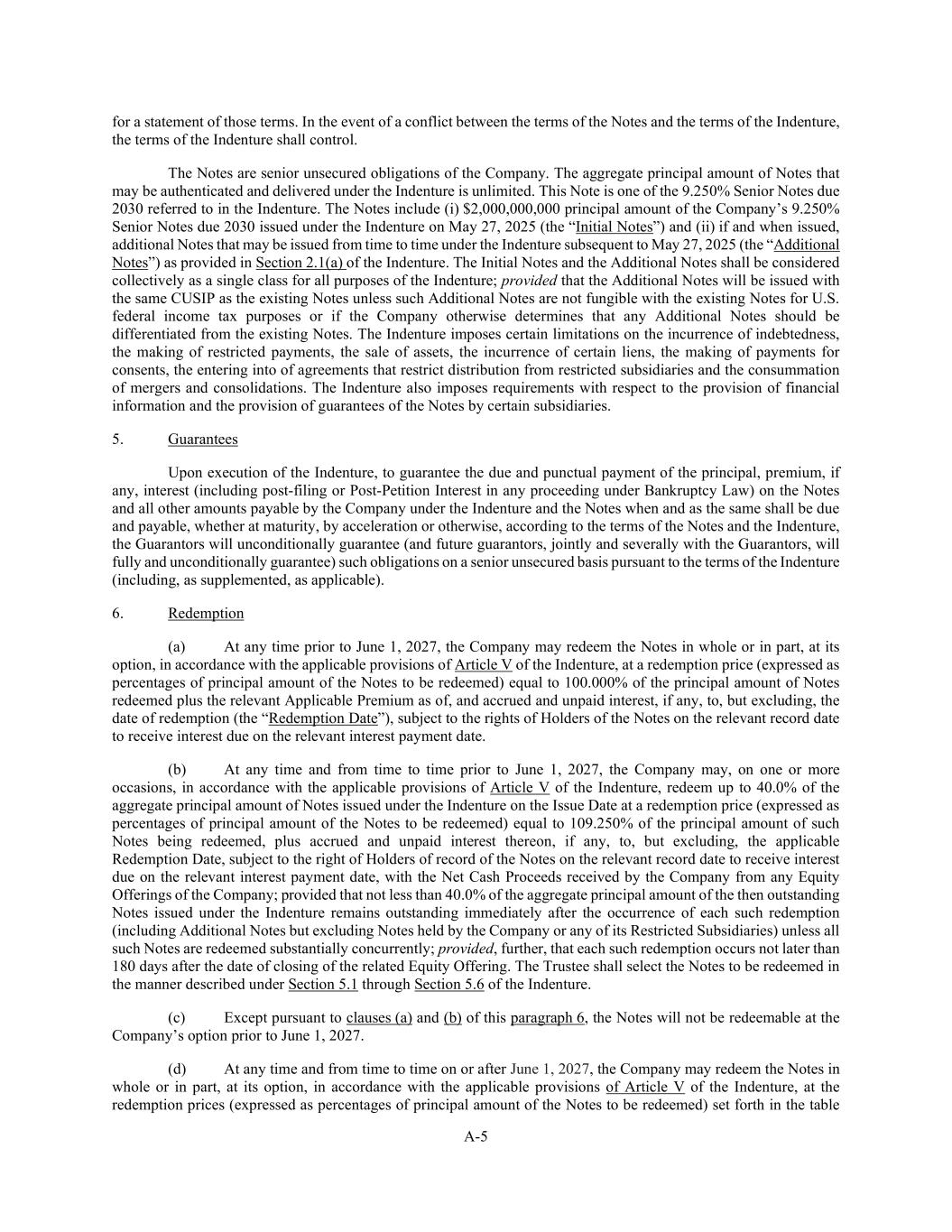 A-5 for a statement of those terms. In the event of a conflict between the terms of the Notes and the terms of the Indenture, the terms of the Indenture shall control. The Notes are senior unsecured obligations of the Company. The aggregate principal amount of Notes that may be authenticated and delivered under the Indenture is unlimited. This Note is one of the 9.250% Senior Notes due 2030 referred to in the Indenture. The Notes include (i) $2,000,000,000 principal amount of the Company’s 9.250% Senior Notes due 2030 issued under the Indenture on May 27, 2025 (the “Initial Notes”) and (ii) if and when issued, additional Notes that may be issued from time to time under the Indenture subsequent to May 27, 2025 (the “Additional Notes”) as provided in Section 2.1(a) of the Indenture. The Initial Notes and the Additional Notes shall be considered collectively as a single class for all purposes of the Indenture; provided that the Additional Notes will be issued with the same CUSIP as the existing Notes unless such Additional Notes are not fungible with the existing Notes for U.S. federal income tax purposes or if the Company otherwise determines that any Additional Notes should be differentiated from the existing Notes. The Indenture imposes certain limitations on the incurrence of indebtedness, the making of restricted payments, the sale of assets, the incurrence of certain liens, the making of payments for consents, the entering into of agreements that restrict distribution from restricted subsidiaries and the consummation of mergers and consolidations. The Indenture also imposes requirements with respect to the provision of financial information and the provision of guarantees of the Notes by certain subsidiaries. 5. Guarantees Upon execution of the Indenture, to guarantee the due and punctual payment of the principal, premium, if any, interest (including post-filing or Post-Petition Interest in any proceeding under Bankruptcy Law) on the Notes and all other amounts payable by the Company under the Indenture and the Notes when and as the same shall be due and payable, whether at maturity, by acceleration or otherwise, according to the terms of the Notes and the Indenture, the Guarantors will unconditionally guarantee (and future guarantors, jointly and severally with the Guarantors, will fully and unconditionally guarantee) such obligations on a senior unsecured basis pursuant to the terms of the Indenture (including, as supplemented, as applicable). 6. Redemption (a) At any time prior to June 1, 2027, the Company may redeem the Notes in whole or in part, at its option, in accordance with the applicable provisions of Article V of the Indenture, at a redemption price (expressed as percentages of principal amount of the Notes to be redeemed) equal to 100.000% of the principal amount of Notes redeemed plus the relevant Applicable Premium as of, and accrued and unpaid interest, if any, to, but excluding, the date of redemption (the “Redemption Date”), subject to the rights of Holders of the Notes on the relevant record date to receive interest due on the relevant interest payment date. (b) At any time and from time to time prior to June 1, 2027, the Company may, on one or more occasions, in accordance with the applicable provisions of Article V of the Indenture, redeem up to 40.0% of the aggregate principal amount of Notes issued under the Indenture on the Issue Date at a redemption price (expressed as percentages of principal amount of the Notes to be redeemed) equal to 109.250% of the principal amount of such Notes being redeemed, plus accrued and unpaid interest thereon, if any, to, but excluding, the applicable Redemption Date, subject to the right of Holders of record of the Notes on the relevant record date to receive interest due on the relevant interest payment date, with the Net Cash Proceeds received by the Company from any Equity Offerings of the Company; provided that not less than 40.0% of the aggregate principal amount of the then outstanding Notes issued under the Indenture remains outstanding immediately after the occurrence of each such redemption (including Additional Notes but excluding Notes held by the Company or any of its Restricted Subsidiaries) unless all such Notes are redeemed substantially concurrently; provided, further, that each such redemption occurs not later than 180 days after the date of closing of the related Equity Offering. The Trustee shall select the Notes to be redeemed in the manner described under Section 5.1 through Section 5.6 of the Indenture. (c) Except pursuant to clauses (a) and (b) of this paragraph 6, the Notes will not be redeemable at the Company’s option prior to June 1, 2027. (d) At any time and from time to time on or after June 1, 2027, the Company may redeem the Notes in whole or in part, at its option, in accordance with the applicable provisions of Article V of the Indenture, at the redemption prices (expressed as percentages of principal amount of the Notes to be redeemed) set forth in the table