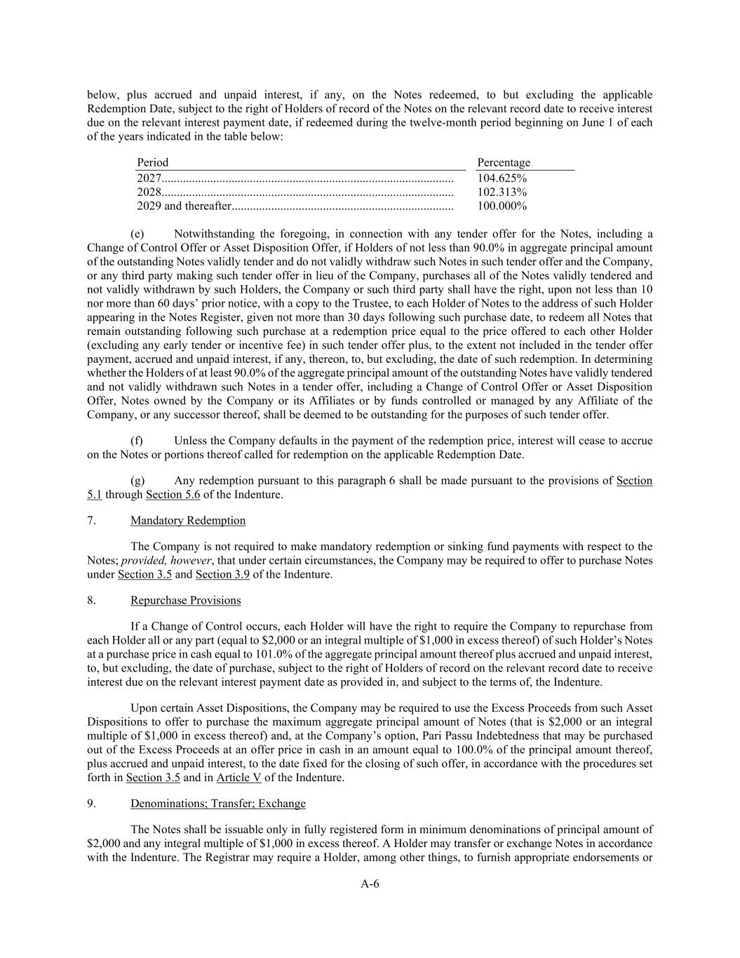 A-6 below, plus accrued and unpaid interest, if any, on the Notes redeemed, to but excluding the applicable Redemption Date, subject to the right of Holders of record of the Notes on the relevant record date to receive interest due on the relevant interest payment date, if redeemed during the twelve-month period beginning on June 1 of each of the years indicated in the table below: Period Percentage 2027 ................................................................................................ 104.625% 2028 ................................................................................................ 102.313% 2029 and thereafter ......................................................................... 100.000% (e) Notwithstanding the foregoing, in connection with any tender offer for the Notes, including a Change of Control Offer or Asset Disposition Offer, if Holders of not less than 90.0% in aggregate principal amount of the outstanding Notes validly tender and do not validly withdraw such Notes in such tender offer and the Company, or any third party making such tender offer in lieu of the Company, purchases all of the Notes validly tendered and not validly withdrawn by such Holders, the Company or such third party shall have the right, upon not less than 10 nor more than 60 days’ prior notice, with a copy to the Trustee, to each Holder of Notes to the address of such Holder appearing in the Notes Register, given not more than 30 days following such purchase date, to redeem all Notes that remain outstanding following such purchase at a redemption price equal to the price offered to each other Holder (excluding any early tender or incentive fee) in such tender offer plus, to the extent not included in the tender offer payment, accrued and unpaid interest, if any, thereon, to, but excluding, the date of such redemption. In determining whether the Holders of at least 90.0% of the aggregate principal amount of the outstanding Notes have validly tendered and not validly withdrawn such Notes in a tender offer, including a Change of Control Offer or Asset Disposition Offer, Notes owned by the Company or its Affiliates or by funds controlled or managed by any Affiliate of the Company, or any successor thereof, shall be deemed to be outstanding for the purposes of such tender offer. (f) Unless the Company defaults in the payment of the redemption price, interest will cease to accrue on the Notes or portions thereof called for redemption on the applicable Redemption Date. (g) Any redemption pursuant to this paragraph 6 shall be made pursuant to the provisions of Section 5.1 through Section 5.6 of the Indenture. 7. Mandatory Redemption The Company is not required to make mandatory redemption or sinking fund payments with respect to the Notes; provided, however, that under certain circumstances, the Company may be required to offer to purchase Notes under Section 3.5 and Section 3.9 of the Indenture. 8. Repurchase Provisions If a Change of Control occurs, each Holder will have the right to require the Company to repurchase from each Holder all or any part (equal to $2,000 or an integral multiple of $1,000 in excess thereof) of such Holder’s Notes at a purchase price in cash equal to 101.0% of the aggregate principal amount thereof plus accrued and unpaid interest, to, but excluding, the date of purchase, subject to the right of Holders of record on the relevant record date to receive interest due on the relevant interest payment date as provided in, and subject to the terms of, the Indenture. Upon certain Asset Dispositions, the Company may be required to use the Excess Proceeds from such Asset Dispositions to offer to purchase the maximum aggregate principal amount of Notes (that is $2,000 or an integral multiple of $1,000 in excess thereof) and, at the Company’s option, Pari Passu Indebtedness that may be purchased out of the Excess Proceeds at an offer price in cash in an amount equal to 100.0% of the principal amount thereof, plus accrued and unpaid interest, to the date fixed for the closing of such offer, in accordance with the procedures set forth in Section 3.5 and in Article V of the Indenture. 9. Denominations; Transfer; Exchange The Notes shall be issuable only in fully registered form in minimum denominations of principal amount of $2,000 and any integral multiple of $1,000 in excess thereof. A Holder may transfer or exchange Notes in accordance with the Indenture. The Registrar may require a Holder, among other things, to furnish appropriate endorsements or