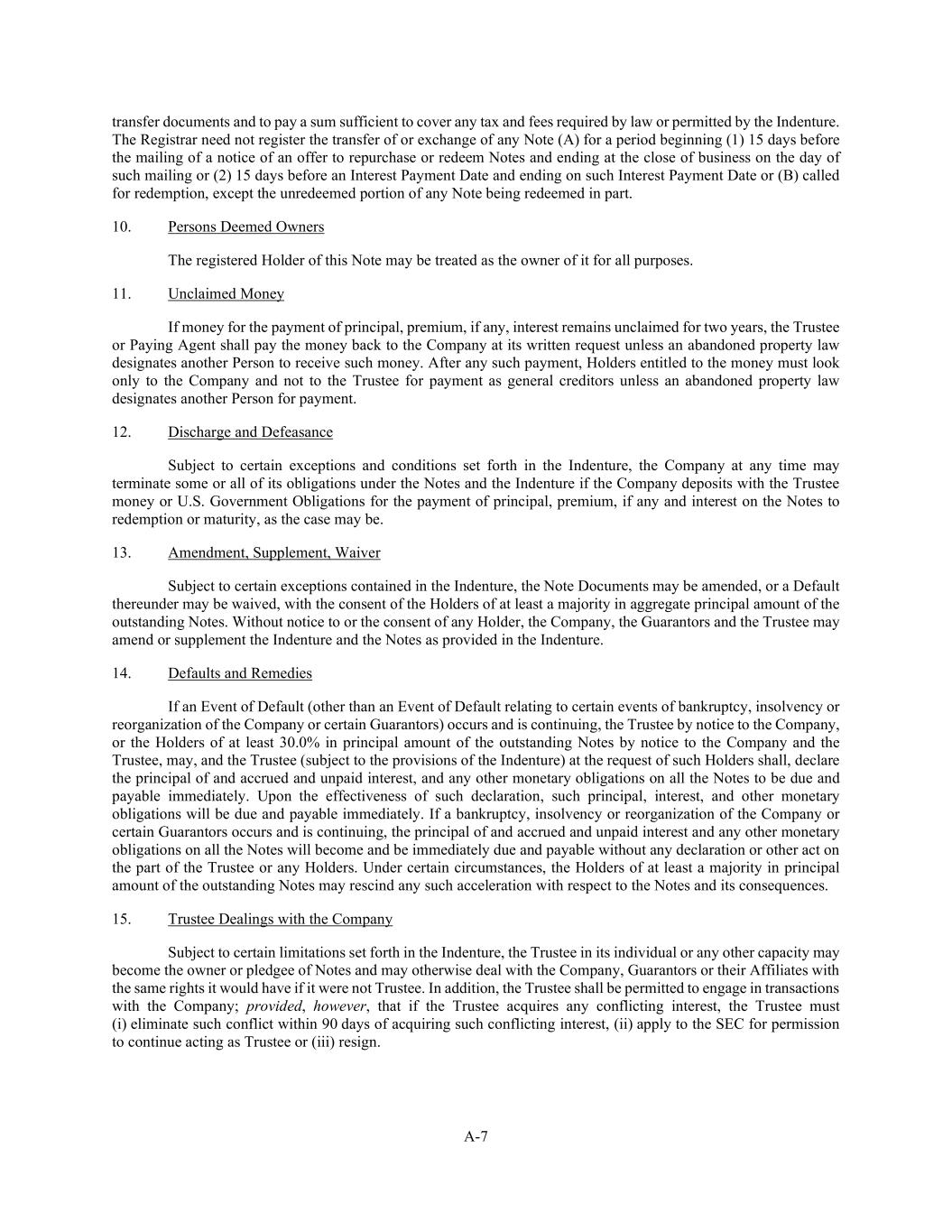 A-7 transfer documents and to pay a sum sufficient to cover any tax and fees required by law or permitted by the Indenture. The Registrar need not register the transfer of or exchange of any Note (A) for a period beginning (1) 15 days before the mailing of a notice of an offer to repurchase or redeem Notes and ending at the close of business on the day of such mailing or (2) 15 days before an Interest Payment Date and ending on such Interest Payment Date or (B) called for redemption, except the unredeemed portion of any Note being redeemed in part. 10. Persons Deemed Owners The registered Holder of this Note may be treated as the owner of it for all purposes. 11. Unclaimed Money If money for the payment of principal, premium, if any, interest remains unclaimed for two years, the Trustee or Paying Agent shall pay the money back to the Company at its written request unless an abandoned property law designates another Person to receive such money. After any such payment, Holders entitled to the money must look only to the Company and not to the Trustee for payment as general creditors unless an abandoned property law designates another Person for payment. 12. Discharge and Defeasance Subject to certain exceptions and conditions set forth in the Indenture, the Company at any time may terminate some or all of its obligations under the Notes and the Indenture if the Company deposits with the Trustee money or U.S. Government Obligations for the payment of principal, premium, if any and interest on the Notes to redemption or maturity, as the case may be. 13. Amendment, Supplement, Waiver Subject to certain exceptions contained in the Indenture, the Note Documents may be amended, or a Default thereunder may be waived, with the consent of the Holders of at least a majority in aggregate principal amount of the outstanding Notes. Without notice to or the consent of any Holder, the Company, the Guarantors and the Trustee may amend or supplement the Indenture and the Notes as provided in the Indenture. 14. Defaults and Remedies If an Event of Default (other than an Event of Default relating to certain events of bankruptcy, insolvency or reorganization of the Company or certain Guarantors) occurs and is continuing, the Trustee by notice to the Company, or the Holders of at least 30.0% in principal amount of the outstanding Notes by notice to the Company and the Trustee, may, and the Trustee (subject to the provisions of the Indenture) at the request of such Holders shall, declare the principal of and accrued and unpaid interest, and any other monetary obligations on all the Notes to be due and payable immediately. Upon the effectiveness of such declaration, such principal, interest, and other monetary obligations will be due and payable immediately. If a bankruptcy, insolvency or reorganization of the Company or certain Guarantors occurs and is continuing, the principal of and accrued and unpaid interest and any other monetary obligations on all the Notes will become and be immediately due and payable without any declaration or other act on the part of the Trustee or any Holders. Under certain circumstances, the Holders of at least a majority in principal amount of the outstanding Notes may rescind any such acceleration with respect to the Notes and its consequences. 15. Trustee Dealings with the Company Subject to certain limitations set forth in the Indenture, the Trustee in its individual or any other capacity may become the owner or pledgee of Notes and may otherwise deal with the Company, Guarantors or their Affiliates with the same rights it would have if it were not Trustee. In addition, the Trustee shall be permitted to engage in transactions with the Company; provided, however, that if the Trustee acquires any conflicting interest, the Trustee must (i) eliminate such conflict within 90 days of acquiring such conflicting interest, (ii) apply to the SEC for permission to continue acting as Trustee or (iii) resign.