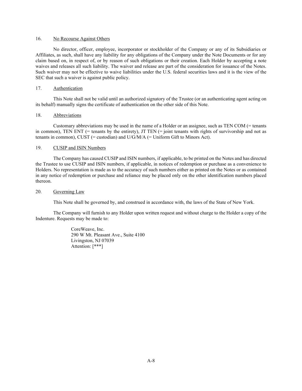 A-8 16. No Recourse Against Others No director, officer, employee, incorporator or stockholder of the Company or any of its Subsidiaries or Affiliates, as such, shall have any liability for any obligations of the Company under the Note Documents or for any claim based on, in respect of, or by reason of such obligations or their creation. Each Holder by accepting a note waives and releases all such liability. The waiver and release are part of the consideration for issuance of the Notes. Such waiver may not be effective to waive liabilities under the U.S. federal securities laws and it is the view of the SEC that such a waiver is against public policy. 17. Authentication This Note shall not be valid until an authorized signatory of the Trustee (or an authenticating agent acting on its behalf) manually signs the certificate of authentication on the other side of this Note. 18. Abbreviations Customary abbreviations may be used in the name of a Holder or an assignee, such as TEN COM (= tenants in common), TEN ENT (= tenants by the entirety), JT TEN (= joint tenants with rights of survivorship and not as tenants in common), CUST (= custodian) and U/G/M/A (= Uniform Gift to Minors Act). 19. CUSIP and ISIN Numbers The Company has caused CUSIP and ISIN numbers, if applicable, to be printed on the Notes and has directed the Trustee to use CUSIP and ISIN numbers, if applicable, in notices of redemption or purchase as a convenience to Holders. No representation is made as to the accuracy of such numbers either as printed on the Notes or as contained in any notice of redemption or purchase and reliance may be placed only on the other identification numbers placed thereon. 20. Governing Law This Note shall be governed by, and construed in accordance with, the laws of the State of New York. The Company will furnish to any Holder upon written request and without charge to the Holder a copy of the Indenture. Requests may be made to: CoreWeave, Inc. 290 W Mt. Pleasant Ave., Suite 4100 Livingston, NJ 07039 Attention: [***]