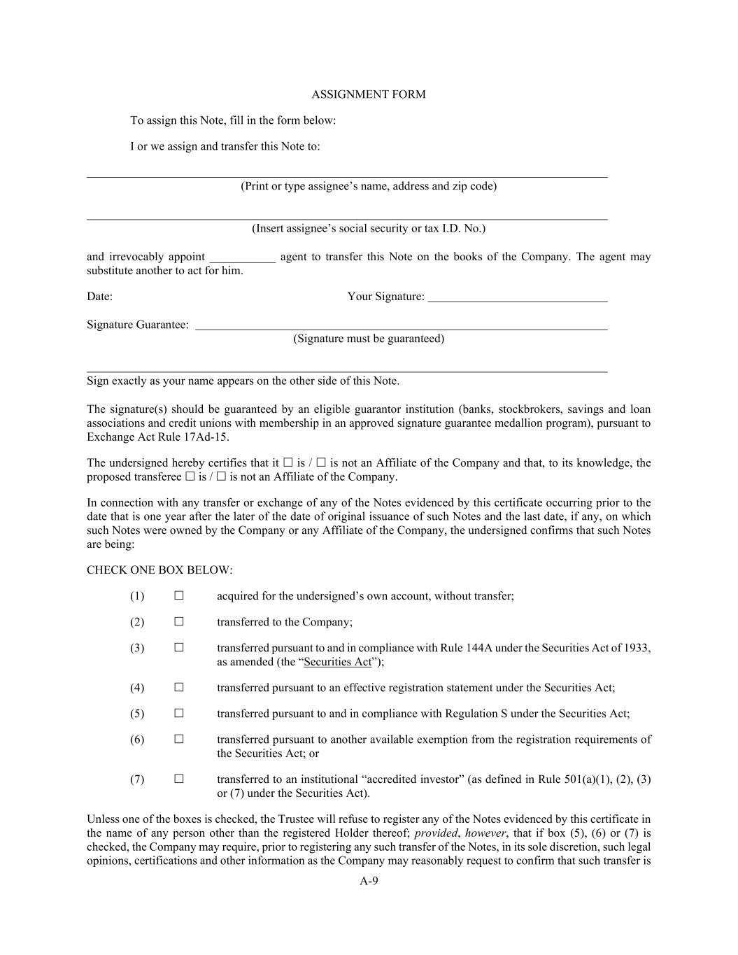 A-9 ASSIGNMENT FORM To assign this Note, fill in the form below: I or we assign and transfer this Note to: (Print or type assignee’s name, address and zip code) (Insert assignee’s social security or tax I.D. No.) and irrevocably appoint ___________ agent to transfer this Note on the books of the Company. The agent may substitute another to act for him. Date: Your Signature: Signature Guarantee: (Signature must be guaranteed) Sign exactly as your name appears on the other side of this Note. The signature(s) should be guaranteed by an eligible guarantor institution (banks, stockbrokers, savings and loan associations and credit unions with membership in an approved signature guarantee medallion program), pursuant to Exchange Act Rule 17Ad-15. The undersigned hereby certifies that it  is /  is not an Affiliate of the Company and that, to its knowledge, the proposed transferee  is /  is not an Affiliate of the Company. In connection with any transfer or exchange of any of the Notes evidenced by this certificate occurring prior to the date that is one year after the later of the date of original issuance of such Notes and the last date, if any, on which such Notes were owned by the Company or any Affiliate of the Company, the undersigned confirms that such Notes are being: CHECK ONE BOX BELOW: (1)  acquired for the undersigned’s own account, without transfer; (2)  transferred to the Company; (3)  transferred pursuant to and in compliance with Rule 144A under the Securities Act of 1933, as amended (the “Securities Act”); (4)  transferred pursuant to an effective registration statement under the Securities Act; (5)  transferred pursuant to and in compliance with Regulation S under the Securities Act; (6)  transferred pursuant to another available exemption from the registration requirements of the Securities Act; or (7)  transferred to an institutional “accredited investor” (as defined in Rule 501(a)(1), (2), (3) or (7) under the Securities Act). Unless one of the boxes is checked, the Trustee will refuse to register any of the Notes evidenced by this certificate in the name of any person other than the registered Holder thereof; provided, however, that if box (5), (6) or (7) is checked, the Company may require, prior to registering any such transfer of the Notes, in its sole discretion, such legal opinions, certifications and other information as the Company may reasonably request to confirm that such transfer is