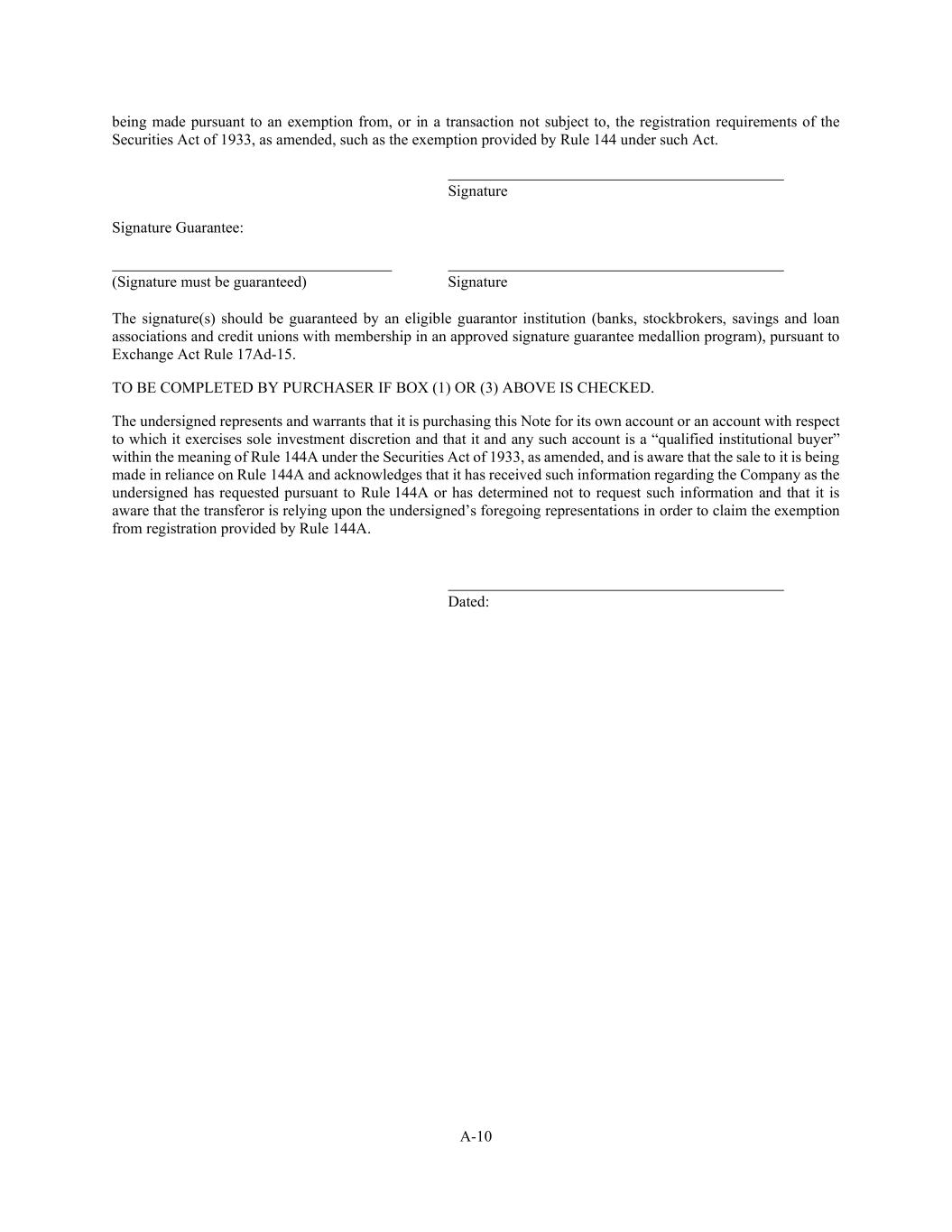 A-10 being made pursuant to an exemption from, or in a transaction not subject to, the registration requirements of the Securities Act of 1933, as amended, such as the exemption provided by Rule 144 under such Act. Signature Signature Guarantee: (Signature must be guaranteed) Signature The signature(s) should be guaranteed by an eligible guarantor institution (banks, stockbrokers, savings and loan associations and credit unions with membership in an approved signature guarantee medallion program), pursuant to Exchange Act Rule 17Ad-15. TO BE COMPLETED BY PURCHASER IF BOX (1) OR (3) ABOVE IS CHECKED. The undersigned represents and warrants that it is purchasing this Note for its own account or an account with respect to which it exercises sole investment discretion and that it and any such account is a “qualified institutional buyer” within the meaning of Rule 144A under the Securities Act of 1933, as amended, and is aware that the sale to it is being made in reliance on Rule 144A and acknowledges that it has received such information regarding the Company as the undersigned has requested pursuant to Rule 144A or has determined not to request such information and that it is aware that the transferor is relying upon the undersigned’s foregoing representations in order to claim the exemption from registration provided by Rule 144A. Dated: