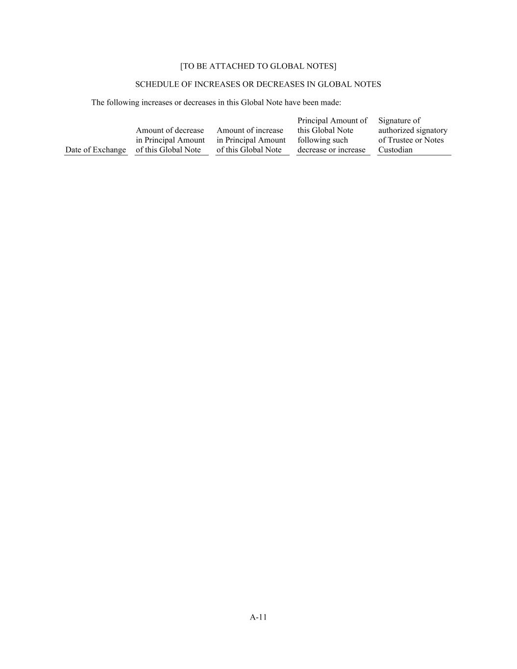 A-11 [TO BE ATTACHED TO GLOBAL NOTES] SCHEDULE OF INCREASES OR DECREASES IN GLOBAL NOTES The following increases or decreases in this Global Note have been made: Date of Exchange Amount of decrease in Principal Amount of this Global Note Amount of increase in Principal Amount of this Global Note Principal Amount of this Global Note following such decrease or increase Signature of authorized signatory of Trustee or Notes Custodian