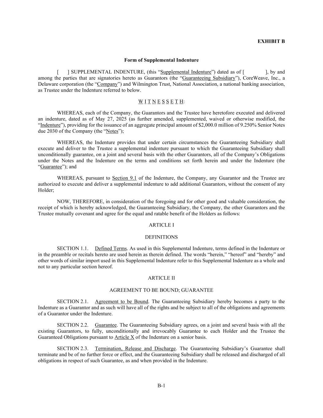 B-1 EXHIBIT B Form of Supplemental Indenture [ ] SUPPLEMENTAL INDENTURE, (this “Supplemental Indenture”) dated as of [ ], by and among the parties that are signatories hereto as Guarantors (the “Guaranteeing Subsidiary”), CoreWeave, Inc., a Delaware corporation (the “Company”) and Wilmington Trust, National Association, a national banking association, as Trustee under the Indenture referred to below. W I T N E S S E T H: WHEREAS, each of the Company, the Guarantors and the Trustee have heretofore executed and delivered an indenture, dated as of May 27, 2025 (as further amended, supplemented, waived or otherwise modified, the “Indenture”), providing for the issuance of an aggregate principal amount of $2,000.0 million of 9.250% Senior Notes due 2030 of the Company (the “Notes”); WHEREAS, the Indenture provides that under certain circumstances the Guaranteeing Subsidiary shall execute and deliver to the Trustee a supplemental indenture pursuant to which the Guaranteeing Subsidiary shall unconditionally guarantee, on a joint and several basis with the other Guarantors, all of the Company’s Obligations under the Notes and the Indenture on the terms and conditions set forth herein and under the Indenture (the “Guarantee”); and WHEREAS, pursuant to Section 9.1 of the Indenture, the Company, any Guarantor and the Trustee are authorized to execute and deliver a supplemental indenture to add additional Guarantors, without the consent of any Holder; NOW, THEREFORE, in consideration of the foregoing and for other good and valuable consideration, the receipt of which is hereby acknowledged, the Guaranteeing Subsidiary, the Company, the other Guarantors and the Trustee mutually covenant and agree for the equal and ratable benefit of the Holders as follows: ARTICLE I DEFINITIONS SECTION 1.1. Defined Terms. As used in this Supplemental Indenture, terms defined in the Indenture or in the preamble or recitals hereto are used herein as therein defined. The words “herein,” “hereof” and “hereby” and other words of similar import used in this Supplemental Indenture refer to this Supplemental Indenture as a whole and not to any particular section hereof. ARTICLE II AGREEMENT TO BE BOUND; GUARANTEE SECTION 2.1. Agreement to be Bound. The Guaranteeing Subsidiary hereby becomes a party to the Indenture as a Guarantor and as such will have all of the rights and be subject to all of the obligations and agreements of a Guarantor under the Indenture. SECTION 2.2. Guarantee. The Guaranteeing Subsidiary agrees, on a joint and several basis with all the existing Guarantors, to fully, unconditionally and irrevocably Guarantee to each Holder and the Trustee the Guaranteed Obligations pursuant to Article X of the Indenture on a senior basis. SECTION 2.3. Termination, Release and Discharge. The Guaranteeing Subsidiary’s Guarantee shall terminate and be of no further force or effect, and the Guaranteeing Subsidiary shall be released and discharged of all obligations in respect of such Guarantee, as and when provided in the Indenture.