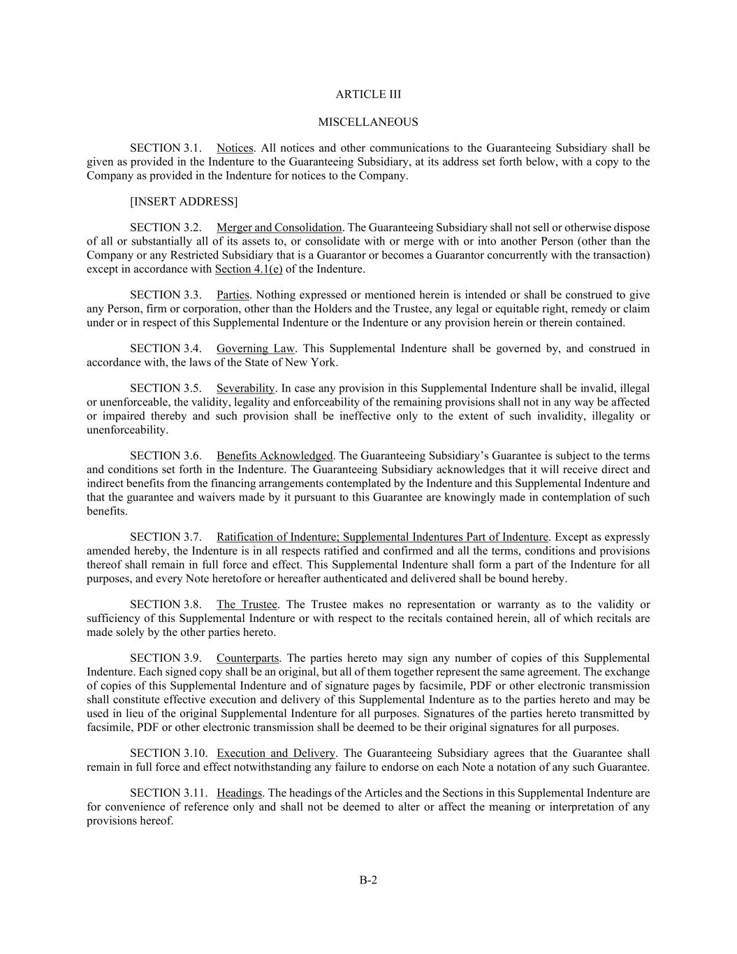 B-2 ARTICLE III MISCELLANEOUS SECTION 3.1. Notices. All notices and other communications to the Guaranteeing Subsidiary shall be given as provided in the Indenture to the Guaranteeing Subsidiary, at its address set forth below, with a copy to the Company as provided in the Indenture for notices to the Company. [INSERT ADDRESS] SECTION 3.2. Merger and Consolidation. The Guaranteeing Subsidiary shall not sell or otherwise dispose of all or substantially all of its assets to, or consolidate with or merge with or into another Person (other than the Company or any Restricted Subsidiary that is a Guarantor or becomes a Guarantor concurrently with the transaction) except in accordance with Section 4.1(e) of the Indenture. SECTION 3.3. Parties. Nothing expressed or mentioned herein is intended or shall be construed to give any Person, firm or corporation, other than the Holders and the Trustee, any legal or equitable right, remedy or claim under or in respect of this Supplemental Indenture or the Indenture or any provision herein or therein contained. SECTION 3.4. Governing Law. This Supplemental Indenture shall be governed by, and construed in accordance with, the laws of the State of New York. SECTION 3.5. Severability. In case any provision in this Supplemental Indenture shall be invalid, illegal or unenforceable, the validity, legality and enforceability of the remaining provisions shall not in any way be affected or impaired thereby and such provision shall be ineffective only to the extent of such invalidity, illegality or unenforceability. SECTION 3.6. Benefits Acknowledged. The Guaranteeing Subsidiary’s Guarantee is subject to the terms and conditions set forth in the Indenture. The Guaranteeing Subsidiary acknowledges that it will receive direct and indirect benefits from the financing arrangements contemplated by the Indenture and this Supplemental Indenture and that the guarantee and waivers made by it pursuant to this Guarantee are knowingly made in contemplation of such benefits. SECTION 3.7. Ratification of Indenture; Supplemental Indentures Part of Indenture. Except as expressly amended hereby, the Indenture is in all respects ratified and confirmed and all the terms, conditions and provisions thereof shall remain in full force and effect. This Supplemental Indenture shall form a part of the Indenture for all purposes, and every Note heretofore or hereafter authenticated and delivered shall be bound hereby. SECTION 3.8. The Trustee. The Trustee makes no representation or warranty as to the validity or sufficiency of this Supplemental Indenture or with respect to the recitals contained herein, all of which recitals are made solely by the other parties hereto. SECTION 3.9. Counterparts. The parties hereto may sign any number of copies of this Supplemental Indenture. Each signed copy shall be an original, but all of them together represent the same agreement. The exchange of copies of this Supplemental Indenture and of signature pages by facsimile, PDF or other electronic transmission shall constitute effective execution and delivery of this Supplemental Indenture as to the parties hereto and may be used in lieu of the original Supplemental Indenture for all purposes. Signatures of the parties hereto transmitted by facsimile, PDF or other electronic transmission shall be deemed to be their original signatures for all purposes. SECTION 3.10. Execution and Delivery. The Guaranteeing Subsidiary agrees that the Guarantee shall remain in full force and effect notwithstanding any failure to endorse on each Note a notation of any such Guarantee. SECTION 3.11. Headings. The headings of the Articles and the Sections in this Supplemental Indenture are for convenience of reference only and shall not be deemed to alter or affect the meaning or interpretation of any provisions hereof.
