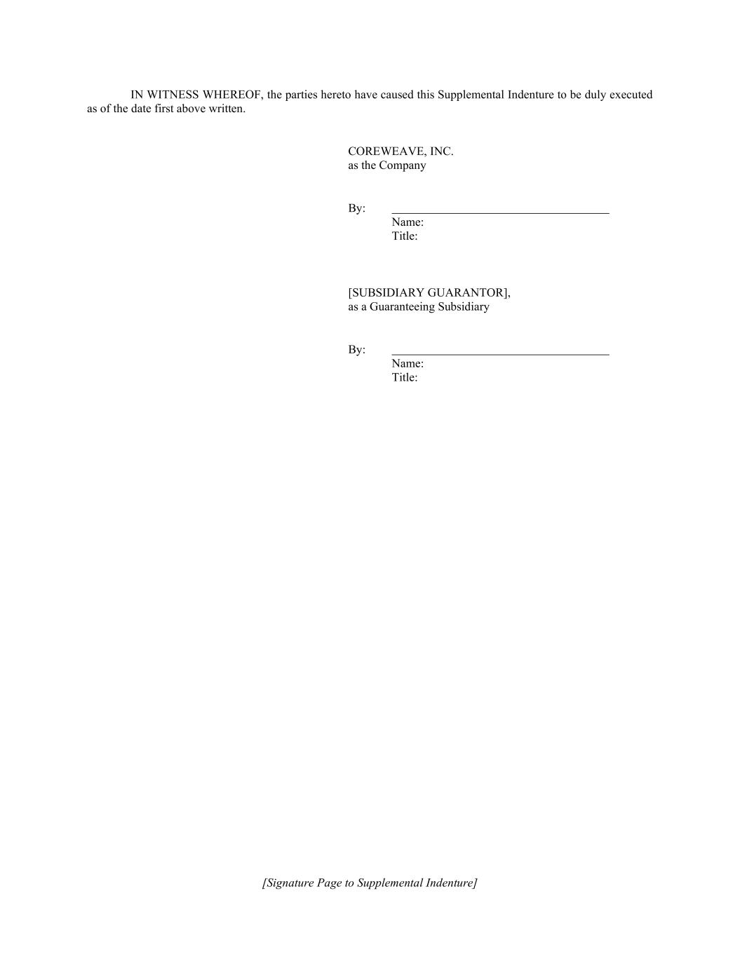 [Signature Page to Supplemental Indenture] IN WITNESS WHEREOF, the parties hereto have caused this Supplemental Indenture to be duly executed as of the date first above written. COREWEAVE, INC. as the Company By: Name: Title: [SUBSIDIARY GUARANTOR], as a Guaranteeing Subsidiary By: Name: Title: