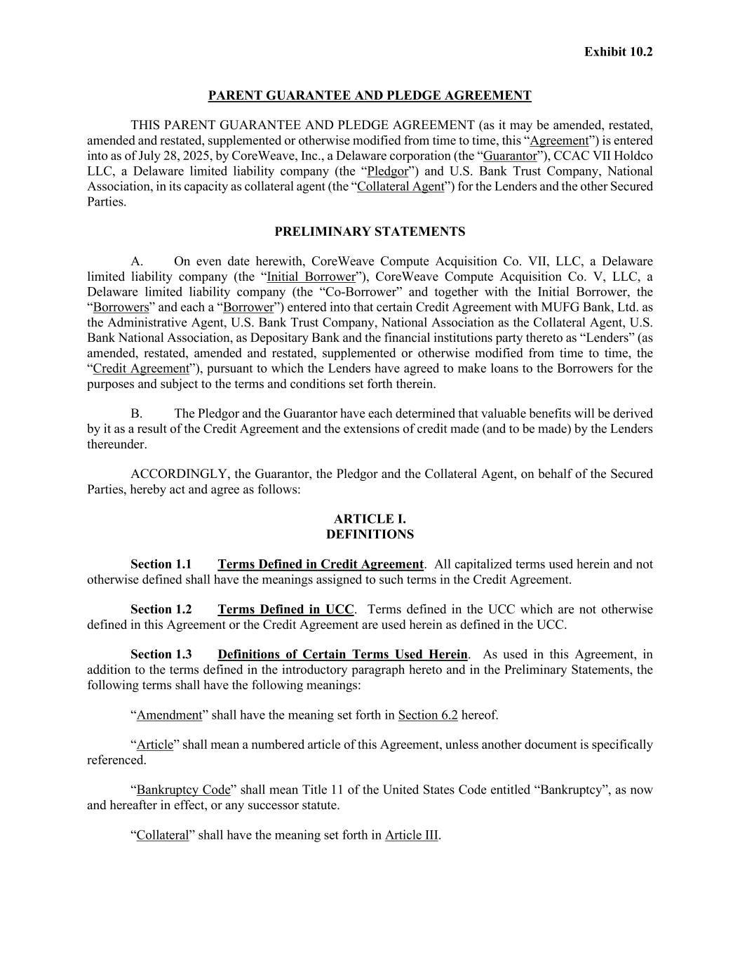 Exhibit 10.2 PARENT GUARANTEE AND PLEDGE AGREEMENT THIS PARENT GUARANTEE AND PLEDGE AGREEMENT (as it may be amended, restated, amended and restated, supplemented or otherwise modified from time to time, this “Agreement”) is entered into as of July 28, 2025, by CoreWeave, Inc., a Delaware corporation (the “Guarantor”), CCAC VII Holdco LLC, a Delaware limited liability company (the “Pledgor”) and U.S. Bank Trust Company, National Association, in its capacity as collateral agent (the “Collateral Agent”) for the Lenders and the other Secured Parties. PRELIMINARY STATEMENTS A. On even date herewith, CoreWeave Compute Acquisition Co. VII, LLC, a Delaware limited liability company (the “Initial Borrower”), CoreWeave Compute Acquisition Co. V, LLC, a Delaware limited liability company (the “Co-Borrower” and together with the Initial Borrower, the “Borrowers” and each a “Borrower”) entered into that certain Credit Agreement with MUFG Bank, Ltd. as the Administrative Agent, U.S. Bank Trust Company, National Association as the Collateral Agent, U.S. Bank National Association, as Depositary Bank and the financial institutions party thereto as “Lenders” (as amended, restated, amended and restated, supplemented or otherwise modified from time to time, the “Credit Agreement”), pursuant to which the Lenders have agreed to make loans to the Borrowers for the purposes and subject to the terms and conditions set forth therein. B. The Pledgor and the Guarantor have each determined that valuable benefits will be derived by it as a result of the Credit Agreement and the extensions of credit made (and to be made) by the Lenders thereunder. ACCORDINGLY, the Guarantor, the Pledgor and the Collateral Agent, on behalf of the Secured Parties, hereby act and agree as follows: ARTICLE I. DEFINITIONS Section 1.1 Terms Defined in Credit Agreement. All capitalized terms used herein and not otherwise defined shall have the meanings assigned to such terms in the Credit Agreement. Section 1.2 Terms Defined in UCC. Terms defined in the UCC which are not otherwise defined in this Agreement or the Credit Agreement are used herein as defined in the UCC. Section 1.3 Definitions of Certain Terms Used Herein. As used in this Agreement, in addition to the terms defined in the introductory paragraph hereto and in the Preliminary Statements, the following terms shall have the following meanings: “Amendment” shall have the meaning set forth in Section 6.2 hereof. “Article” shall mean a numbered article of this Agreement, unless another document is specifically referenced. “Bankruptcy Code” shall mean Title 11 of the United States Code entitled “Bankruptcy”, as now and hereafter in effect, or any successor statute. “Collateral” shall have the meaning set forth in Article III.