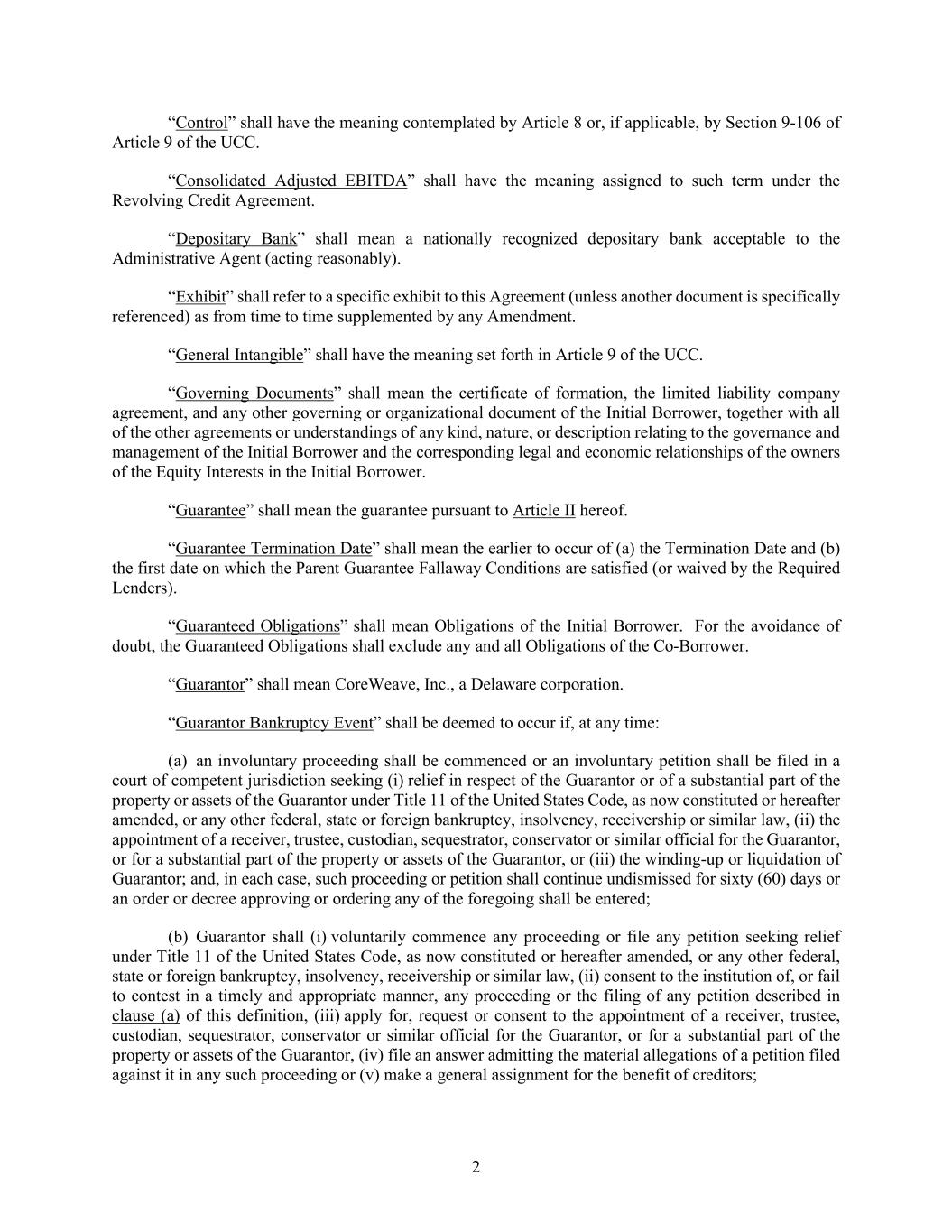 2 “Control” shall have the meaning contemplated by Article 8 or, if applicable, by Section 9-106 of Article 9 of the UCC. “Consolidated Adjusted EBITDA” shall have the meaning assigned to such term under the Revolving Credit Agreement. “Depositary Bank” shall mean a nationally recognized depositary bank acceptable to the Administrative Agent (acting reasonably). “Exhibit” shall refer to a specific exhibit to this Agreement (unless another document is specifically referenced) as from time to time supplemented by any Amendment. “General Intangible” shall have the meaning set forth in Article 9 of the UCC. “Governing Documents” shall mean the certificate of formation, the limited liability company agreement, and any other governing or organizational document of the Initial Borrower, together with all of the other agreements or understandings of any kind, nature, or description relating to the governance and management of the Initial Borrower and the corresponding legal and economic relationships of the owners of the Equity Interests in the Initial Borrower. “Guarantee” shall mean the guarantee pursuant to Article II hereof. “Guarantee Termination Date” shall mean the earlier to occur of (a) the Termination Date and (b) the first date on which the Parent Guarantee Fallaway Conditions are satisfied (or waived by the Required Lenders). “Guaranteed Obligations” shall mean Obligations of the Initial Borrower. For the avoidance of doubt, the Guaranteed Obligations shall exclude any and all Obligations of the Co-Borrower. “Guarantor” shall mean CoreWeave, Inc., a Delaware corporation. “Guarantor Bankruptcy Event” shall be deemed to occur if, at any time: (a) an involuntary proceeding shall be commenced or an involuntary petition shall be filed in a court of competent jurisdiction seeking (i) relief in respect of the Guarantor or of a substantial part of the property or assets of the Guarantor under Title 11 of the United States Code, as now constituted or hereafter amended, or any other federal, state or foreign bankruptcy, insolvency, receivership or similar law, (ii) the appointment of a receiver, trustee, custodian, sequestrator, conservator or similar official for the Guarantor, or for a substantial part of the property or assets of the Guarantor, or (iii) the winding-up or liquidation of Guarantor; and, in each case, such proceeding or petition shall continue undismissed for sixty (60) days or an order or decree approving or ordering any of the foregoing shall be entered; (b) Guarantor shall (i) voluntarily commence any proceeding or file any petition seeking relief under Title 11 of the United States Code, as now constituted or hereafter amended, or any other federal, state or foreign bankruptcy, insolvency, receivership or similar law, (ii) consent to the institution of, or fail to contest in a timely and appropriate manner, any proceeding or the filing of any petition described in clause (a) of this definition, (iii) apply for, request or consent to the appointment of a receiver, trustee, custodian, sequestrator, conservator or similar official for the Guarantor, or for a substantial part of the property or assets of the Guarantor, (iv) file an answer admitting the material allegations of a petition filed against it in any such proceeding or (v) make a general assignment for the benefit of creditors;