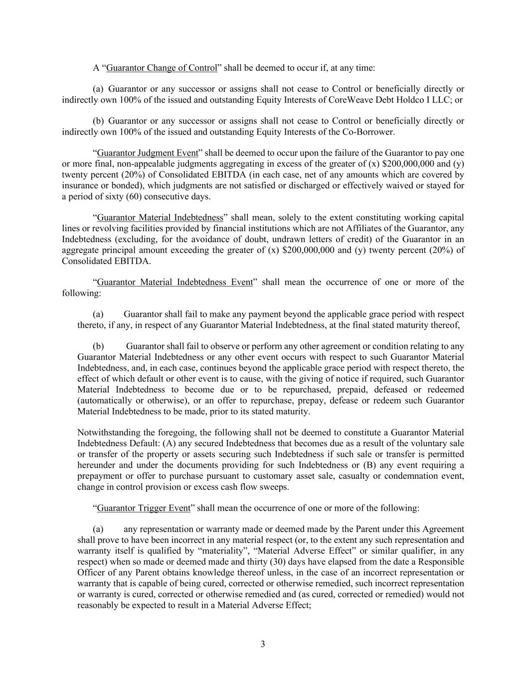3 A “Guarantor Change of Control” shall be deemed to occur if, at any time: (a) Guarantor or any successor or assigns shall not cease to Control or beneficially directly or indirectly own 100% of the issued and outstanding Equity Interests of CoreWeave Debt Holdco I LLC; or (b) Guarantor or any successor or assigns shall not cease to Control or beneficially directly or indirectly own 100% of the issued and outstanding Equity Interests of the Co-Borrower. “Guarantor Judgment Event” shall be deemed to occur upon the failure of the Guarantor to pay one or more final, non-appealable judgments aggregating in excess of the greater of (x) $200,000,000 and (y) twenty percent (20%) of Consolidated EBITDA (in each case, net of any amounts which are covered by insurance or bonded), which judgments are not satisfied or discharged or effectively waived or stayed for a period of sixty (60) consecutive days. “Guarantor Material Indebtedness” shall mean, solely to the extent constituting working capital lines or revolving facilities provided by financial institutions which are not Affiliates of the Guarantor, any Indebtedness (excluding, for the avoidance of doubt, undrawn letters of credit) of the Guarantor in an aggregate principal amount exceeding the greater of (x) $200,000,000 and (y) twenty percent (20%) of Consolidated EBITDA. “Guarantor Material Indebtedness Event” shall mean the occurrence of one or more of the following: (a) Guarantor shall fail to make any payment beyond the applicable grace period with respect thereto, if any, in respect of any Guarantor Material Indebtedness, at the final stated maturity thereof, (b) Guarantor shall fail to observe or perform any other agreement or condition relating to any Guarantor Material Indebtedness or any other event occurs with respect to such Guarantor Material Indebtedness, and, in each case, continues beyond the applicable grace period with respect thereto, the effect of which default or other event is to cause, with the giving of notice if required, such Guarantor Material Indebtedness to become due or to be repurchased, prepaid, defeased or redeemed (automatically or otherwise), or an offer to repurchase, prepay, defease or redeem such Guarantor Material Indebtedness to be made, prior to its stated maturity. Notwithstanding the foregoing, the following shall not be deemed to constitute a Guarantor Material Indebtedness Default: (A) any secured Indebtedness that becomes due as a result of the voluntary sale or transfer of the property or assets securing such Indebtedness if such sale or transfer is permitted hereunder and under the documents providing for such Indebtedness or (B) any event requiring a prepayment or offer to purchase pursuant to customary asset sale, casualty or condemnation event, change in control provision or excess cash flow sweeps. “Guarantor Trigger Event” shall mean the occurrence of one or more of the following: (a) any representation or warranty made or deemed made by the Parent under this Agreement shall prove to have been incorrect in any material respect (or, to the extent any such representation and warranty itself is qualified by “materiality”, “Material Adverse Effect” or similar qualifier, in any respect) when so made or deemed made and thirty (30) days have elapsed from the date a Responsible Officer of any Parent obtains knowledge thereof unless, in the case of an incorrect representation or warranty that is capable of being cured, corrected or otherwise remedied, such incorrect representation or warranty is cured, corrected or otherwise remedied and (as cured, corrected or remedied) would not reasonably be expected to result in a Material Adverse Effect;