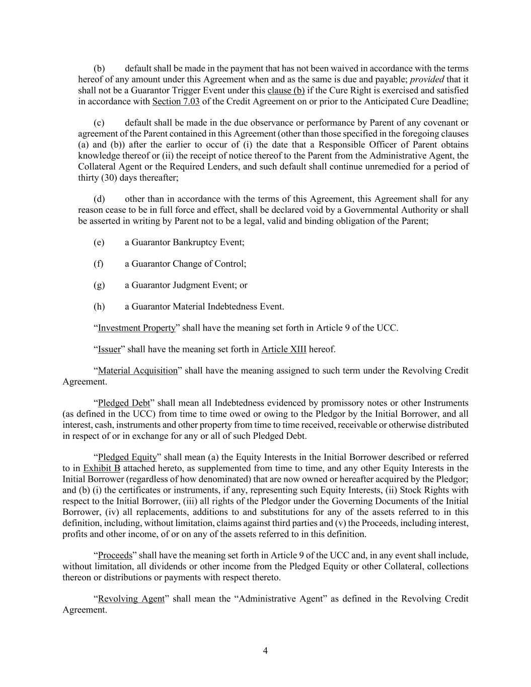 4 (b) default shall be made in the payment that has not been waived in accordance with the terms hereof of any amount under this Agreement when and as the same is due and payable; provided that it shall not be a Guarantor Trigger Event under this clause (b) if the Cure Right is exercised and satisfied in accordance with Section 7.03 of the Credit Agreement on or prior to the Anticipated Cure Deadline; (c) default shall be made in the due observance or performance by Parent of any covenant or agreement of the Parent contained in this Agreement (other than those specified in the foregoing clauses (a) and (b)) after the earlier to occur of (i) the date that a Responsible Officer of Parent obtains knowledge thereof or (ii) the receipt of notice thereof to the Parent from the Administrative Agent, the Collateral Agent or the Required Lenders, and such default shall continue unremedied for a period of thirty (30) days thereafter; (d) other than in accordance with the terms of this Agreement, this Agreement shall for any reason cease to be in full force and effect, shall be declared void by a Governmental Authority or shall be asserted in writing by Parent not to be a legal, valid and binding obligation of the Parent; (e) a Guarantor Bankruptcy Event; (f) a Guarantor Change of Control; (g) a Guarantor Judgment Event; or (h) a Guarantor Material Indebtedness Event. “Investment Property” shall have the meaning set forth in Article 9 of the UCC. “Issuer” shall have the meaning set forth in Article XIII hereof. “Material Acquisition” shall have the meaning assigned to such term under the Revolving Credit Agreement. “Pledged Debt” shall mean all Indebtedness evidenced by promissory notes or other Instruments (as defined in the UCC) from time to time owed or owing to the Pledgor by the Initial Borrower, and all interest, cash, instruments and other property from time to time received, receivable or otherwise distributed in respect of or in exchange for any or all of such Pledged Debt. “Pledged Equity” shall mean (a) the Equity Interests in the Initial Borrower described or referred to in Exhibit B attached hereto, as supplemented from time to time, and any other Equity Interests in the Initial Borrower (regardless of how denominated) that are now owned or hereafter acquired by the Pledgor; and (b) (i) the certificates or instruments, if any, representing such Equity Interests, (ii) Stock Rights with respect to the Initial Borrower, (iii) all rights of the Pledgor under the Governing Documents of the Initial Borrower, (iv) all replacements, additions to and substitutions for any of the assets referred to in this definition, including, without limitation, claims against third parties and (v) the Proceeds, including interest, profits and other income, of or on any of the assets referred to in this definition. “Proceeds” shall have the meaning set forth in Article 9 of the UCC and, in any event shall include, without limitation, all dividends or other income from the Pledged Equity or other Collateral, collections thereon or distributions or payments with respect thereto. “Revolving Agent” shall mean the “Administrative Agent” as defined in the Revolving Credit Agreement.