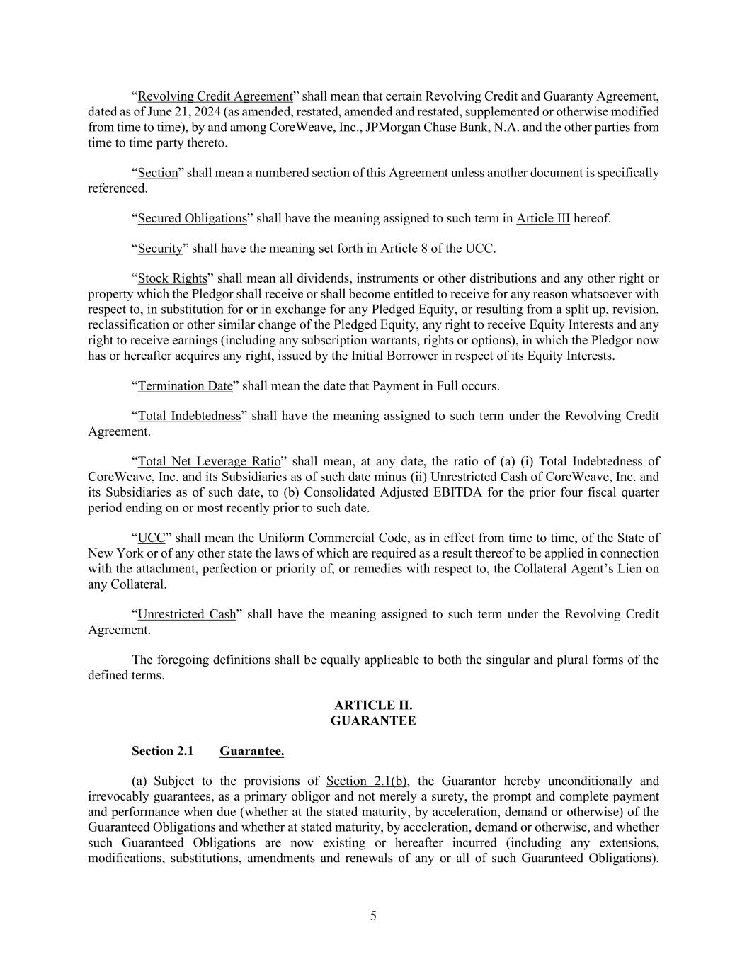 5 “Revolving Credit Agreement” shall mean that certain Revolving Credit and Guaranty Agreement, dated as of June 21, 2024 (as amended, restated, amended and restated, supplemented or otherwise modified from time to time), by and among CoreWeave, Inc., JPMorgan Chase Bank, N.A. and the other parties from time to time party thereto. “Section” shall mean a numbered section of this Agreement unless another document is specifically referenced. “Secured Obligations” shall have the meaning assigned to such term in Article III hereof. “Security” shall have the meaning set forth in Article 8 of the UCC. “Stock Rights” shall mean all dividends, instruments or other distributions and any other right or property which the Pledgor shall receive or shall become entitled to receive for any reason whatsoever with respect to, in substitution for or in exchange for any Pledged Equity, or resulting from a split up, revision, reclassification or other similar change of the Pledged Equity, any right to receive Equity Interests and any right to receive earnings (including any subscription warrants, rights or options), in which the Pledgor now has or hereafter acquires any right, issued by the Initial Borrower in respect of its Equity Interests. “Termination Date” shall mean the date that Payment in Full occurs. “Total Indebtedness” shall have the meaning assigned to such term under the Revolving Credit Agreement. “Total Net Leverage Ratio” shall mean, at any date, the ratio of (a) (i) Total Indebtedness of CoreWeave, Inc. and its Subsidiaries as of such date minus (ii) Unrestricted Cash of CoreWeave, Inc. and its Subsidiaries as of such date, to (b) Consolidated Adjusted EBITDA for the prior four fiscal quarter period ending on or most recently prior to such date. “UCC” shall mean the Uniform Commercial Code, as in effect from time to time, of the State of New York or of any other state the laws of which are required as a result thereof to be applied in connection with the attachment, perfection or priority of, or remedies with respect to, the Collateral Agent’s Lien on any Collateral. “Unrestricted Cash” shall have the meaning assigned to such term under the Revolving Credit Agreement. The foregoing definitions shall be equally applicable to both the singular and plural forms of the defined terms. ARTICLE II. GUARANTEE Section 2.1 Guarantee. (a) Subject to the provisions of Section 2.1(b), the Guarantor hereby unconditionally and irrevocably guarantees, as a primary obligor and not merely a surety, the prompt and complete payment and performance when due (whether at the stated maturity, by acceleration, demand or otherwise) of the Guaranteed Obligations and whether at stated maturity, by acceleration, demand or otherwise, and whether such Guaranteed Obligations are now existing or hereafter incurred (including any extensions, modifications, substitutions, amendments and renewals of any or all of such Guaranteed Obligations).