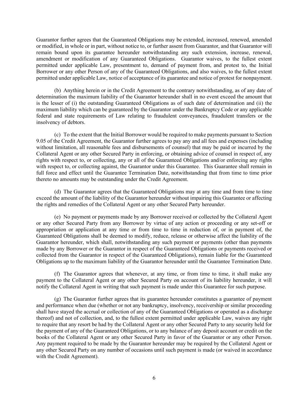 6 Guarantor further agrees that the Guaranteed Obligations may be extended, increased, renewed, amended or modified, in whole or in part, without notice to, or further assent from Guarantor, and that Guarantor will remain bound upon its guarantee hereunder notwithstanding any such extension, increase, renewal, amendment or modification of any Guaranteed Obligations. Guarantor waives, to the fullest extent permitted under applicable Law, presentment to, demand of payment from, and protest to, the Initial Borrower or any other Person of any of the Guaranteed Obligations, and also waives, to the fullest extent permitted under applicable Law, notice of acceptance of its guarantee and notice of protest for nonpayment. (b) Anything herein or in the Credit Agreement to the contrary notwithstanding, as of any date of determination the maximum liability of the Guarantor hereunder shall in no event exceed the amount that is the lesser of (i) the outstanding Guaranteed Obligations as of such date of determination and (ii) the maximum liability which can be guaranteed by the Guarantor under the Bankruptcy Code or any applicable federal and state requirements of Law relating to fraudulent conveyances, fraudulent transfers or the insolvency of debtors. (c) To the extent that the Initial Borrower would be required to make payments pursuant to Section 9.05 of the Credit Agreement, the Guarantor further agrees to pay any and all fees and expenses (including without limitation, all reasonable fees and disbursements of counsel) that may be paid or incurred by the Collateral Agent or any other Secured Party in enforcing, or obtaining advice of counsel in respect of, any rights with respect to, or collecting, any or all of the Guaranteed Obligations and/or enforcing any rights with respect to, or collecting against, the Guarantor under this Guarantee. This Guarantee shall remain in full force and effect until the Guarantee Termination Date, notwithstanding that from time to time prior thereto no amounts may be outstanding under the Credit Agreement. (d) The Guarantor agrees that the Guaranteed Obligations may at any time and from time to time exceed the amount of the liability of the Guarantor hereunder without impairing this Guarantee or affecting the rights and remedies of the Collateral Agent or any other Secured Party hereunder. (e) No payment or payments made by any Borrower received or collected by the Collateral Agent or any other Secured Party from any Borrower by virtue of any action or proceeding or any set-off or appropriation or application at any time or from time to time in reduction of, or in payment of, the Guaranteed Obligations shall be deemed to modify, reduce, release or otherwise affect the liability of the Guarantor hereunder, which shall, notwithstanding any such payment or payments (other than payments made by any Borrower or the Guarantor in respect of the Guaranteed Obligations or payments received or collected from the Guarantor in respect of the Guaranteed Obligations), remain liable for the Guaranteed Obligations up to the maximum liability of the Guarantor hereunder until the Guarantee Termination Date. (f) The Guarantor agrees that whenever, at any time, or from time to time, it shall make any payment to the Collateral Agent or any other Secured Party on account of its liability hereunder, it will notify the Collateral Agent in writing that such payment is made under this Guarantee for such purpose. (g) The Guarantor further agrees that its guarantee hereunder constitutes a guarantee of payment and performance when due (whether or not any bankruptcy, insolvency, receivership or similar proceeding shall have stayed the accrual or collection of any of the Guaranteed Obligations or operated as a discharge thereof) and not of collection, and, to the fullest extent permitted under applicable Law, waives any right to require that any resort be had by the Collateral Agent or any other Secured Party to any security held for the payment of any of the Guaranteed Obligations, or to any balance of any deposit account or credit on the books of the Collateral Agent or any other Secured Party in favor of the Guarantor or any other Person. Any payment required to be made by the Guarantor hereunder may be required by the Collateral Agent or any other Secured Party on any number of occasions until such payment is made (or waived in accordance with the Credit Agreement).