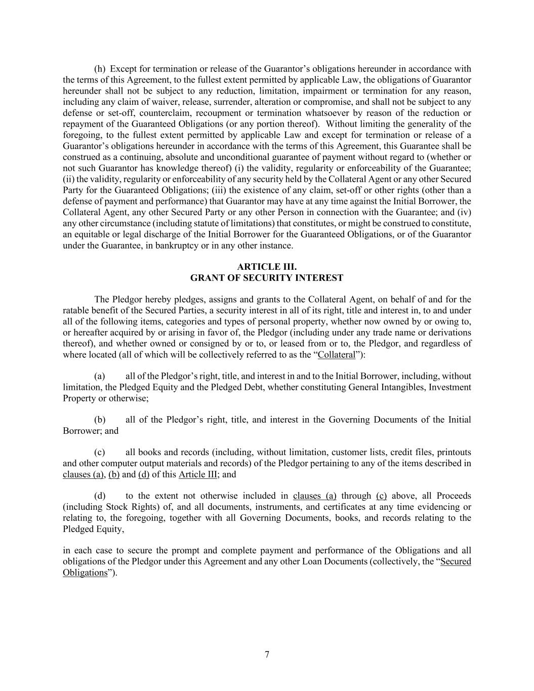 7 (h) Except for termination or release of the Guarantor’s obligations hereunder in accordance with the terms of this Agreement, to the fullest extent permitted by applicable Law, the obligations of Guarantor hereunder shall not be subject to any reduction, limitation, impairment or termination for any reason, including any claim of waiver, release, surrender, alteration or compromise, and shall not be subject to any defense or set-off, counterclaim, recoupment or termination whatsoever by reason of the reduction or repayment of the Guaranteed Obligations (or any portion thereof). Without limiting the generality of the foregoing, to the fullest extent permitted by applicable Law and except for termination or release of a Guarantor’s obligations hereunder in accordance with the terms of this Agreement, this Guarantee shall be construed as a continuing, absolute and unconditional guarantee of payment without regard to (whether or not such Guarantor has knowledge thereof) (i) the validity, regularity or enforceability of the Guarantee; (ii) the validity, regularity or enforceability of any security held by the Collateral Agent or any other Secured Party for the Guaranteed Obligations; (iii) the existence of any claim, set-off or other rights (other than a defense of payment and performance) that Guarantor may have at any time against the Initial Borrower, the Collateral Agent, any other Secured Party or any other Person in connection with the Guarantee; and (iv) any other circumstance (including statute of limitations) that constitutes, or might be construed to constitute, an equitable or legal discharge of the Initial Borrower for the Guaranteed Obligations, or of the Guarantor under the Guarantee, in bankruptcy or in any other instance. ARTICLE III. GRANT OF SECURITY INTEREST The Pledgor hereby pledges, assigns and grants to the Collateral Agent, on behalf of and for the ratable benefit of the Secured Parties, a security interest in all of its right, title and interest in, to and under all of the following items, categories and types of personal property, whether now owned by or owing to, or hereafter acquired by or arising in favor of, the Pledgor (including under any trade name or derivations thereof), and whether owned or consigned by or to, or leased from or to, the Pledgor, and regardless of where located (all of which will be collectively referred to as the “Collateral”): (a) all of the Pledgor’s right, title, and interest in and to the Initial Borrower, including, without limitation, the Pledged Equity and the Pledged Debt, whether constituting General Intangibles, Investment Property or otherwise; (b) all of the Pledgor’s right, title, and interest in the Governing Documents of the Initial Borrower; and (c) all books and records (including, without limitation, customer lists, credit files, printouts and other computer output materials and records) of the Pledgor pertaining to any of the items described in clauses (a), (b) and (d) of this Article III; and (d) to the extent not otherwise included in clauses (a) through (c) above, all Proceeds (including Stock Rights) of, and all documents, instruments, and certificates at any time evidencing or relating to, the foregoing, together with all Governing Documents, books, and records relating to the Pledged Equity, in each case to secure the prompt and complete payment and performance of the Obligations and all obligations of the Pledgor under this Agreement and any other Loan Documents (collectively, the “Secured Obligations”).