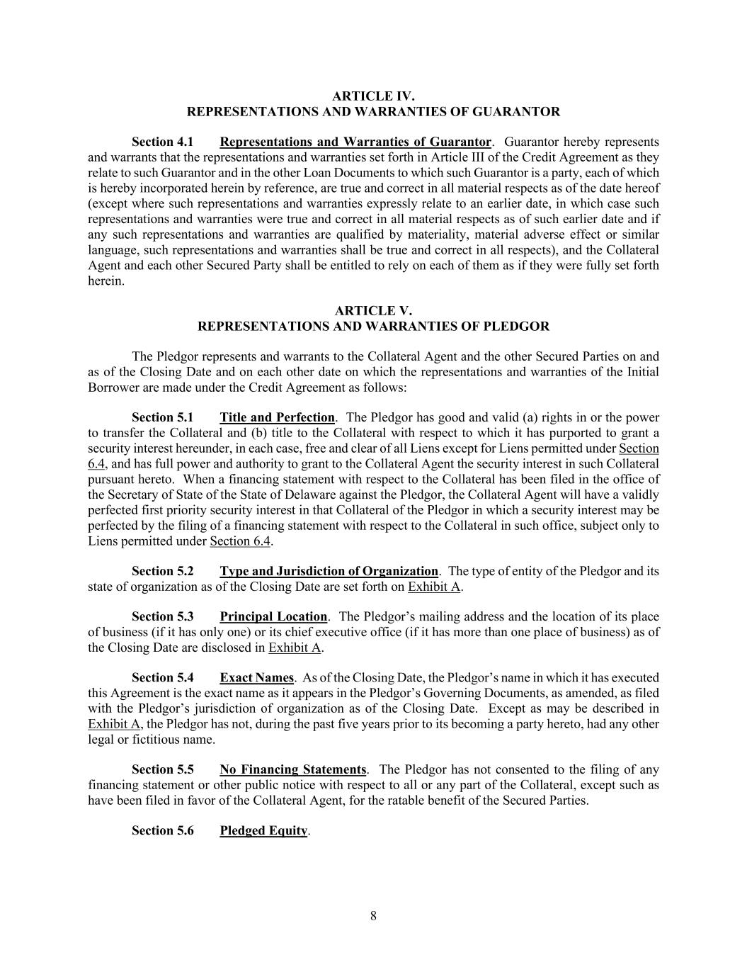8 ARTICLE IV. REPRESENTATIONS AND WARRANTIES OF GUARANTOR Section 4.1 Representations and Warranties of Guarantor. Guarantor hereby represents and warrants that the representations and warranties set forth in Article III of the Credit Agreement as they relate to such Guarantor and in the other Loan Documents to which such Guarantor is a party, each of which is hereby incorporated herein by reference, are true and correct in all material respects as of the date hereof (except where such representations and warranties expressly relate to an earlier date, in which case such representations and warranties were true and correct in all material respects as of such earlier date and if any such representations and warranties are qualified by materiality, material adverse effect or similar language, such representations and warranties shall be true and correct in all respects), and the Collateral Agent and each other Secured Party shall be entitled to rely on each of them as if they were fully set forth herein. ARTICLE V. REPRESENTATIONS AND WARRANTIES OF PLEDGOR The Pledgor represents and warrants to the Collateral Agent and the other Secured Parties on and as of the Closing Date and on each other date on which the representations and warranties of the Initial Borrower are made under the Credit Agreement as follows: Section 5.1 Title and Perfection. The Pledgor has good and valid (a) rights in or the power to transfer the Collateral and (b) title to the Collateral with respect to which it has purported to grant a security interest hereunder, in each case, free and clear of all Liens except for Liens permitted under Section 6.4, and has full power and authority to grant to the Collateral Agent the security interest in such Collateral pursuant hereto. When a financing statement with respect to the Collateral has been filed in the office of the Secretary of State of the State of Delaware against the Pledgor, the Collateral Agent will have a validly perfected first priority security interest in that Collateral of the Pledgor in which a security interest may be perfected by the filing of a financing statement with respect to the Collateral in such office, subject only to Liens permitted under Section 6.4. Section 5.2 Type and Jurisdiction of Organization. The type of entity of the Pledgor and its state of organization as of the Closing Date are set forth on Exhibit A. Section 5.3 Principal Location. The Pledgor’s mailing address and the location of its place of business (if it has only one) or its chief executive office (if it has more than one place of business) as of the Closing Date are disclosed in Exhibit A. Section 5.4 Exact Names. As of the Closing Date, the Pledgor’s name in which it has executed this Agreement is the exact name as it appears in the Pledgor’s Governing Documents, as amended, as filed with the Pledgor’s jurisdiction of organization as of the Closing Date. Except as may be described in Exhibit A, the Pledgor has not, during the past five years prior to its becoming a party hereto, had any other legal or fictitious name. Section 5.5 No Financing Statements. The Pledgor has not consented to the filing of any financing statement or other public notice with respect to all or any part of the Collateral, except such as have been filed in favor of the Collateral Agent, for the ratable benefit of the Secured Parties. Section 5.6 Pledged Equity.