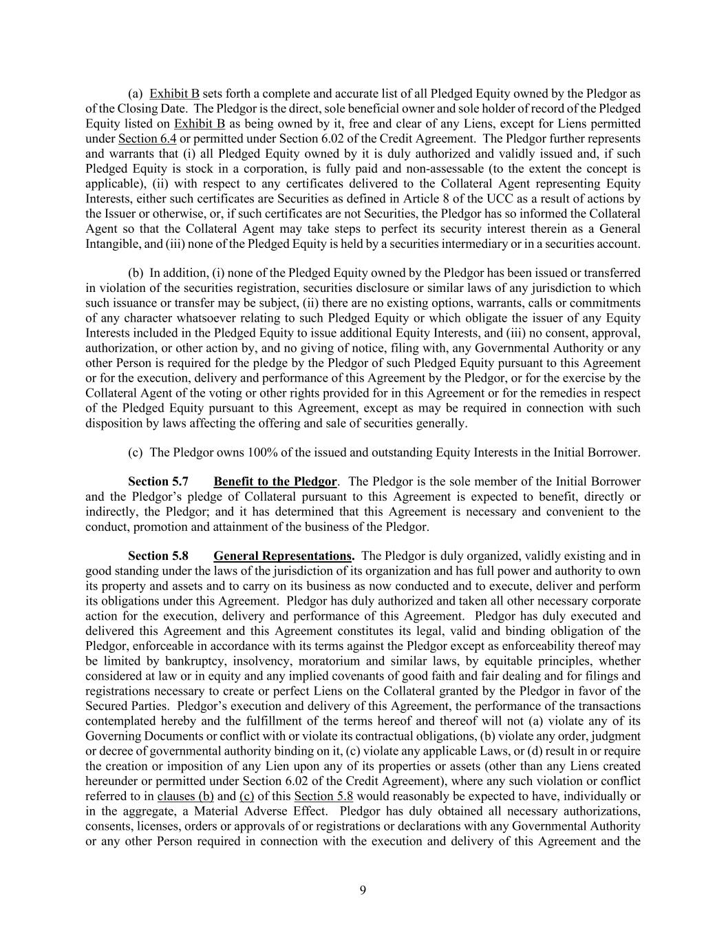 9 (a) Exhibit B sets forth a complete and accurate list of all Pledged Equity owned by the Pledgor as of the Closing Date. The Pledgor is the direct, sole beneficial owner and sole holder of record of the Pledged Equity listed on Exhibit B as being owned by it, free and clear of any Liens, except for Liens permitted under Section 6.4 or permitted under Section 6.02 of the Credit Agreement. The Pledgor further represents and warrants that (i) all Pledged Equity owned by it is duly authorized and validly issued and, if such Pledged Equity is stock in a corporation, is fully paid and non-assessable (to the extent the concept is applicable), (ii) with respect to any certificates delivered to the Collateral Agent representing Equity Interests, either such certificates are Securities as defined in Article 8 of the UCC as a result of actions by the Issuer or otherwise, or, if such certificates are not Securities, the Pledgor has so informed the Collateral Agent so that the Collateral Agent may take steps to perfect its security interest therein as a General Intangible, and (iii) none of the Pledged Equity is held by a securities intermediary or in a securities account. (b) In addition, (i) none of the Pledged Equity owned by the Pledgor has been issued or transferred in violation of the securities registration, securities disclosure or similar laws of any jurisdiction to which such issuance or transfer may be subject, (ii) there are no existing options, warrants, calls or commitments of any character whatsoever relating to such Pledged Equity or which obligate the issuer of any Equity Interests included in the Pledged Equity to issue additional Equity Interests, and (iii) no consent, approval, authorization, or other action by, and no giving of notice, filing with, any Governmental Authority or any other Person is required for the pledge by the Pledgor of such Pledged Equity pursuant to this Agreement or for the execution, delivery and performance of this Agreement by the Pledgor, or for the exercise by the Collateral Agent of the voting or other rights provided for in this Agreement or for the remedies in respect of the Pledged Equity pursuant to this Agreement, except as may be required in connection with such disposition by laws affecting the offering and sale of securities generally. (c) The Pledgor owns 100% of the issued and outstanding Equity Interests in the Initial Borrower. Section 5.7 Benefit to the Pledgor. The Pledgor is the sole member of the Initial Borrower and the Pledgor’s pledge of Collateral pursuant to this Agreement is expected to benefit, directly or indirectly, the Pledgor; and it has determined that this Agreement is necessary and convenient to the conduct, promotion and attainment of the business of the Pledgor. Section 5.8 General Representations. The Pledgor is duly organized, validly existing and in good standing under the laws of the jurisdiction of its organization and has full power and authority to own its property and assets and to carry on its business as now conducted and to execute, deliver and perform its obligations under this Agreement. Pledgor has duly authorized and taken all other necessary corporate action for the execution, delivery and performance of this Agreement. Pledgor has duly executed and delivered this Agreement and this Agreement constitutes its legal, valid and binding obligation of the Pledgor, enforceable in accordance with its terms against the Pledgor except as enforceability thereof may be limited by bankruptcy, insolvency, moratorium and similar laws, by equitable principles, whether considered at law or in equity and any implied covenants of good faith and fair dealing and for filings and registrations necessary to create or perfect Liens on the Collateral granted by the Pledgor in favor of the Secured Parties. Pledgor’s execution and delivery of this Agreement, the performance of the transactions contemplated hereby and the fulfillment of the terms hereof and thereof will not (a) violate any of its Governing Documents or conflict with or violate its contractual obligations, (b) violate any order, judgment or decree of governmental authority binding on it, (c) violate any applicable Laws, or (d) result in or require the creation or imposition of any Lien upon any of its properties or assets (other than any Liens created hereunder or permitted under Section 6.02 of the Credit Agreement), where any such violation or conflict referred to in clauses (b) and (c) of this Section 5.8 would reasonably be expected to have, individually or in the aggregate, a Material Adverse Effect. Pledgor has duly obtained all necessary authorizations, consents, licenses, orders or approvals of or registrations or declarations with any Governmental Authority or any other Person required in connection with the execution and delivery of this Agreement and the