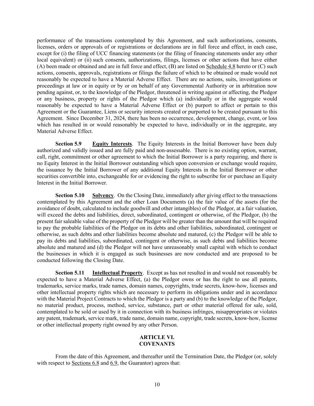 10 performance of the transactions contemplated by this Agreement, and such authorizations, consents, licenses, orders or approvals of or registrations or declarations are in full force and effect, in each case, except for (i) the filing of UCC financing statements (or the filing of financing statements under any other local equivalent) or (ii) such consents, authorizations, filings, licenses or other actions that have either (A) been made or obtained and are in full force and effect, (B) are listed on Schedule 4.8 hereto or (C) such actions, consents, approvals, registrations or filings the failure of which to be obtained or made would not reasonably be expected to have a Material Adverse Effect. There are no actions, suits, investigations or proceedings at law or in equity or by or on behalf of any Governmental Authority or in arbitration now pending against, or, to the knowledge of the Pledgor, threatened in writing against or affecting, the Pledgor or any business, property or rights of the Pledgor which (a) individually or in the aggregate would reasonably be expected to have a Material Adverse Effect or (b) purport to affect or pertain to this Agreement or the Guarantee, Liens or security interests created or purported to be created pursuant to this Agreement. Since December 31, 2024, there has been no occurrence, development, change, event, or loss which has resulted in or would reasonably be expected to have, individually or in the aggregate, any Material Adverse Effect. Section 5.9 Equity Interests. The Equity Interests in the Initial Borrower have been duly authorized and validly issued and are fully paid and non-assessable. There is no existing option, warrant, call, right, commitment or other agreement to which the Initial Borrower is a party requiring, and there is no Equity Interest in the Initial Borrower outstanding which upon conversion or exchange would require, the issuance by the Initial Borrower of any additional Equity Interests in the Initial Borrower or other securities convertible into, exchangeable for or evidencing the right to subscribe for or purchase an Equity Interest in the Initial Borrower. Section 5.10 Solvency. On the Closing Date, immediately after giving effect to the transactions contemplated by this Agreement and the other Loan Documents (a) the fair value of the assets (for the avoidance of doubt, calculated to include goodwill and other intangibles) of the Pledgor, at a fair valuation, will exceed the debts and liabilities, direct, subordinated, contingent or otherwise, of the Pledgor, (b) the present fair saleable value of the property of the Pledgor will be greater than the amount that will be required to pay the probable liabilities of the Pledgor on its debts and other liabilities, subordinated, contingent or otherwise, as such debts and other liabilities become absolute and matured, (c) the Pledgor will be able to pay its debts and liabilities, subordinated, contingent or otherwise, as such debts and liabilities become absolute and matured and (d) the Pledgor will not have unreasonably small capital with which to conduct the businesses in which it is engaged as such businesses are now conducted and are proposed to be conducted following the Closing Date. Section 5.11 Intellectual Property. Except as has not resulted in and would not reasonably be expected to have a Material Adverse Effect, (a) the Pledgor owns or has the right to use all patents, trademarks, service marks, trade names, domain names, copyrights, trade secrets, know-how, licenses and other intellectual property rights which are necessary to perform its obligations under and in accordance with the Material Project Contracts to which the Pledgor is a party and (b) to the knowledge of the Pledgor, no material product, process, method, service, substance, part or other material offered for sale, sold, contemplated to be sold or used by it in connection with its business infringes, misappropriates or violates any patent, trademark, service mark, trade name, domain name, copyright, trade secrets, know-how, license or other intellectual property right owned by any other Person. ARTICLE VI. COVENANTS From the date of this Agreement, and thereafter until the Termination Date, the Pledgor (or, solely with respect to Sections 6.8 and 6.9, the Guarantor) agrees that:
