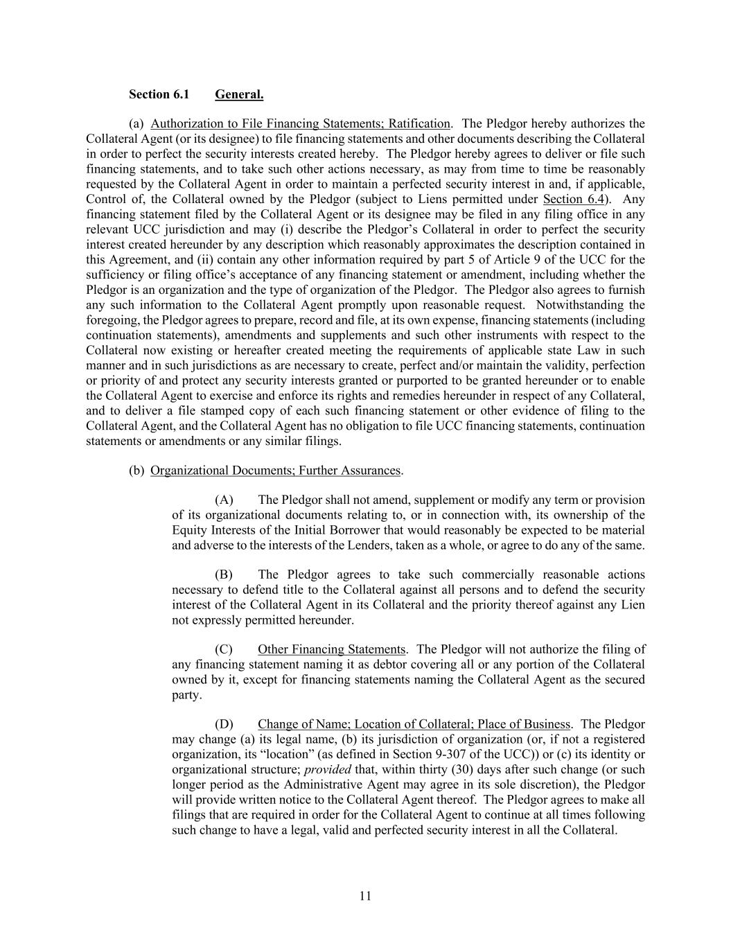 11 Section 6.1 General. (a) Authorization to File Financing Statements; Ratification. The Pledgor hereby authorizes the Collateral Agent (or its designee) to file financing statements and other documents describing the Collateral in order to perfect the security interests created hereby. The Pledgor hereby agrees to deliver or file such financing statements, and to take such other actions necessary, as may from time to time be reasonably requested by the Collateral Agent in order to maintain a perfected security interest in and, if applicable, Control of, the Collateral owned by the Pledgor (subject to Liens permitted under Section 6.4). Any financing statement filed by the Collateral Agent or its designee may be filed in any filing office in any relevant UCC jurisdiction and may (i) describe the Pledgor’s Collateral in order to perfect the security interest created hereunder by any description which reasonably approximates the description contained in this Agreement, and (ii) contain any other information required by part 5 of Article 9 of the UCC for the sufficiency or filing office’s acceptance of any financing statement or amendment, including whether the Pledgor is an organization and the type of organization of the Pledgor. The Pledgor also agrees to furnish any such information to the Collateral Agent promptly upon reasonable request. Notwithstanding the foregoing, the Pledgor agrees to prepare, record and file, at its own expense, financing statements (including continuation statements), amendments and supplements and such other instruments with respect to the Collateral now existing or hereafter created meeting the requirements of applicable state Law in such manner and in such jurisdictions as are necessary to create, perfect and/or maintain the validity, perfection or priority of and protect any security interests granted or purported to be granted hereunder or to enable the Collateral Agent to exercise and enforce its rights and remedies hereunder in respect of any Collateral, and to deliver a file stamped copy of each such financing statement or other evidence of filing to the Collateral Agent, and the Collateral Agent has no obligation to file UCC financing statements, continuation statements or amendments or any similar filings. (b) Organizational Documents; Further Assurances. (A) The Pledgor shall not amend, supplement or modify any term or provision of its organizational documents relating to, or in connection with, its ownership of the Equity Interests of the Initial Borrower that would reasonably be expected to be material and adverse to the interests of the Lenders, taken as a whole, or agree to do any of the same. (B) The Pledgor agrees to take such commercially reasonable actions necessary to defend title to the Collateral against all persons and to defend the security interest of the Collateral Agent in its Collateral and the priority thereof against any Lien not expressly permitted hereunder. (C) Other Financing Statements. The Pledgor will not authorize the filing of any financing statement naming it as debtor covering all or any portion of the Collateral owned by it, except for financing statements naming the Collateral Agent as the secured party. (D) Change of Name; Location of Collateral; Place of Business. The Pledgor may change (a) its legal name, (b) its jurisdiction of organization (or, if not a registered organization, its “location” (as defined in Section 9-307 of the UCC)) or (c) its identity or organizational structure; provided that, within thirty (30) days after such change (or such longer period as the Administrative Agent may agree in its sole discretion), the Pledgor will provide written notice to the Collateral Agent thereof. The Pledgor agrees to make all filings that are required in order for the Collateral Agent to continue at all times following such change to have a legal, valid and perfected security interest in all the Collateral.