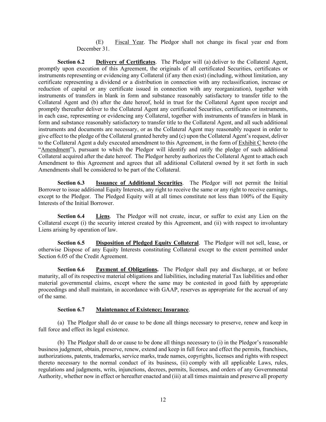 12 (E) Fiscal Year. The Pledgor shall not change its fiscal year end from December 31. Section 6.2 Delivery of Certificates. The Pledgor will (a) deliver to the Collateral Agent, promptly upon execution of this Agreement, the originals of all certificated Securities, certificates or instruments representing or evidencing any Collateral (if any then exist) (including, without limitation, any certificate representing a dividend or a distribution in connection with any reclassification, increase or reduction of capital or any certificate issued in connection with any reorganization), together with instruments of transfers in blank in form and substance reasonably satisfactory to transfer title to the Collateral Agent and (b) after the date hereof, hold in trust for the Collateral Agent upon receipt and promptly thereafter deliver to the Collateral Agent any certificated Securities, certificates or instruments, in each case, representing or evidencing any Collateral, together with instruments of transfers in blank in form and substance reasonably satisfactory to transfer title to the Collateral Agent, and all such additional instruments and documents are necessary, or as the Collateral Agent may reasonably request in order to give effect to the pledge of the Collateral granted hereby and (c) upon the Collateral Agent’s request, deliver to the Collateral Agent a duly executed amendment to this Agreement, in the form of Exhibit C hereto (the “Amendment”), pursuant to which the Pledgor will identify and ratify the pledge of such additional Collateral acquired after the date hereof. The Pledgor hereby authorizes the Collateral Agent to attach each Amendment to this Agreement and agrees that all additional Collateral owned by it set forth in such Amendments shall be considered to be part of the Collateral. Section 6.3 Issuance of Additional Securities. The Pledgor will not permit the Initial Borrower to issue additional Equity Interests, any right to receive the same or any right to receive earnings, except to the Pledgor. The Pledged Equity will at all times constitute not less than 100% of the Equity Interests of the Initial Borrower. Section 6.4 Liens. The Pledgor will not create, incur, or suffer to exist any Lien on the Collateral except (i) the security interest created by this Agreement, and (ii) with respect to involuntary Liens arising by operation of law. Section 6.5 Disposition of Pledged Equity Collateral. The Pledgor will not sell, lease, or otherwise Dispose of any Equity Interests constituting Collateral except to the extent permitted under Section 6.05 of the Credit Agreement. Section 6.6 Payment of Obligations. The Pledgor shall pay and discharge, at or before maturity, all of its respective material obligations and liabilities, including material Tax liabilities and other material governmental claims, except where the same may be contested in good faith by appropriate proceedings and shall maintain, in accordance with GAAP, reserves as appropriate for the accrual of any of the same. Section 6.7 Maintenance of Existence; Insurance. (a) The Pledgor shall do or cause to be done all things necessary to preserve, renew and keep in full force and effect its legal existence. (b) The Pledgor shall do or cause to be done all things necessary to (i) in the Pledgor’s reasonable business judgment, obtain, preserve, renew, extend and keep in full force and effect the permits, franchises, authorizations, patents, trademarks, service marks, trade names, copyrights, licenses and rights with respect thereto necessary to the normal conduct of its business, (ii) comply with all applicable Laws, rules, regulations and judgments, writs, injunctions, decrees, permits, licenses, and orders of any Governmental Authority, whether now in effect or hereafter enacted and (iii) at all times maintain and preserve all property