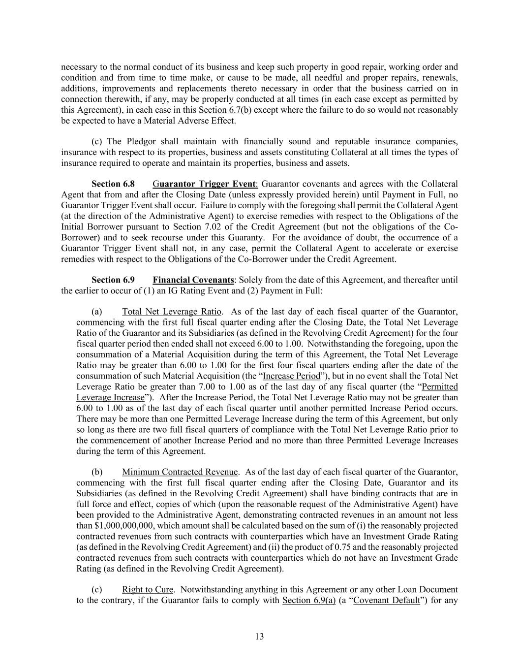 13 necessary to the normal conduct of its business and keep such property in good repair, working order and condition and from time to time make, or cause to be made, all needful and proper repairs, renewals, additions, improvements and replacements thereto necessary in order that the business carried on in connection therewith, if any, may be properly conducted at all times (in each case except as permitted by this Agreement), in each case in this Section 6.7(b) except where the failure to do so would not reasonably be expected to have a Material Adverse Effect. (c) The Pledgor shall maintain with financially sound and reputable insurance companies, insurance with respect to its properties, business and assets constituting Collateral at all times the types of insurance required to operate and maintain its properties, business and assets. Section 6.8 Guarantor Trigger Event: Guarantor covenants and agrees with the Collateral Agent that from and after the Closing Date (unless expressly provided herein) until Payment in Full, no Guarantor Trigger Event shall occur. Failure to comply with the foregoing shall permit the Collateral Agent (at the direction of the Administrative Agent) to exercise remedies with respect to the Obligations of the Initial Borrower pursuant to Section 7.02 of the Credit Agreement (but not the obligations of the Co- Borrower) and to seek recourse under this Guaranty. For the avoidance of doubt, the occurrence of a Guarantor Trigger Event shall not, in any case, permit the Collateral Agent to accelerate or exercise remedies with respect to the Obligations of the Co-Borrower under the Credit Agreement. Section 6.9 Financial Covenants: Solely from the date of this Agreement, and thereafter until the earlier to occur of (1) an IG Rating Event and (2) Payment in Full: (a) Total Net Leverage Ratio. As of the last day of each fiscal quarter of the Guarantor, commencing with the first full fiscal quarter ending after the Closing Date, the Total Net Leverage Ratio of the Guarantor and its Subsidiaries (as defined in the Revolving Credit Agreement) for the four fiscal quarter period then ended shall not exceed 6.00 to 1.00. Notwithstanding the foregoing, upon the consummation of a Material Acquisition during the term of this Agreement, the Total Net Leverage Ratio may be greater than 6.00 to 1.00 for the first four fiscal quarters ending after the date of the consummation of such Material Acquisition (the “Increase Period”), but in no event shall the Total Net Leverage Ratio be greater than 7.00 to 1.00 as of the last day of any fiscal quarter (the “Permitted Leverage Increase”). After the Increase Period, the Total Net Leverage Ratio may not be greater than 6.00 to 1.00 as of the last day of each fiscal quarter until another permitted Increase Period occurs. There may be more than one Permitted Leverage Increase during the term of this Agreement, but only so long as there are two full fiscal quarters of compliance with the Total Net Leverage Ratio prior to the commencement of another Increase Period and no more than three Permitted Leverage Increases during the term of this Agreement. (b) Minimum Contracted Revenue. As of the last day of each fiscal quarter of the Guarantor, commencing with the first full fiscal quarter ending after the Closing Date, Guarantor and its Subsidiaries (as defined in the Revolving Credit Agreement) shall have binding contracts that are in full force and effect, copies of which (upon the reasonable request of the Administrative Agent) have been provided to the Administrative Agent, demonstrating contracted revenues in an amount not less than $1,000,000,000, which amount shall be calculated based on the sum of (i) the reasonably projected contracted revenues from such contracts with counterparties which have an Investment Grade Rating (as defined in the Revolving Credit Agreement) and (ii) the product of 0.75 and the reasonably projected contracted revenues from such contracts with counterparties which do not have an Investment Grade Rating (as defined in the Revolving Credit Agreement). (c) Right to Cure. Notwithstanding anything in this Agreement or any other Loan Document to the contrary, if the Guarantor fails to comply with Section 6.9(a) (a “Covenant Default”) for any