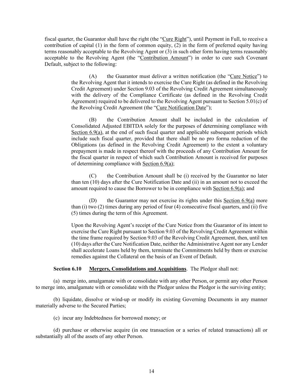 14 fiscal quarter, the Guarantor shall have the right (the “Cure Right”), until Payment in Full, to receive a contribution of capital (1) in the form of common equity, (2) in the form of preferred equity having terms reasonably acceptable to the Revolving Agent or (3) in such other form having terms reasonably acceptable to the Revolving Agent (the “Contribution Amount”) in order to cure such Covenant Default, subject to the following: (A) the Guarantor must deliver a written notification (the “Cure Notice”) to the Revolving Agent that it intends to exercise the Cure Right (as defined in the Revolving Credit Agreement) under Section 9.03 of the Revolving Credit Agreement simultaneously with the delivery of the Compliance Certificate (as defined in the Revolving Credit Agreement) required to be delivered to the Revolving Agent pursuant to Section 5.01(c) of the Revolving Credit Agreement (the “Cure Notification Date”); (B) the Contribution Amount shall be included in the calculation of Consolidated Adjusted EBITDA solely for the purposes of determining compliance with Section 6.9(a), at the end of such fiscal quarter and applicable subsequent periods which include such fiscal quarter, provided that there shall be no pro forma reduction of the Obligations (as defined in the Revolving Credit Agreement) to the extent a voluntary prepayment is made in respect thereof with the proceeds of any Contribution Amount for the fiscal quarter in respect of which such Contribution Amount is received for purposes of determining compliance with Section 6.9(a); (C) the Contribution Amount shall be (i) received by the Guarantor no later than ten (10) days after the Cure Notification Date and (ii) in an amount not to exceed the amount required to cause the Borrower to be in compliance with Section 6.9(a); and (D) the Guarantor may not exercise its rights under this Section 6.9(a) more than (i) two (2) times during any period of four (4) consecutive fiscal quarters, and (ii) five (5) times during the term of this Agreement. Upon the Revolving Agent’s receipt of the Cure Notice from the Guarantor of its intent to exercise the Cure Right pursuant to Section 9.03 of the Revolving Credit Agreement within the time frame required by Section 9.03 of the Revolving Credit Agreement, then, until ten (10) days after the Cure Notification Date, neither the Administrative Agent nor any Lender shall accelerate Loans held by them, terminate the Commitments held by them or exercise remedies against the Collateral on the basis of an Event of Default. Section 6.10 Mergers, Consolidations and Acquisitions. The Pledgor shall not: (a) merge into, amalgamate with or consolidate with any other Person, or permit any other Person to merge into, amalgamate with or consolidate with the Pledgor unless the Pledgor is the surviving entity; (b) liquidate, dissolve or wind-up or modify its existing Governing Documents in any manner materially adverse to the Secured Parties; (c) incur any Indebtedness for borrowed money; or (d) purchase or otherwise acquire (in one transaction or a series of related transactions) all or substantially all of the assets of any other Person.