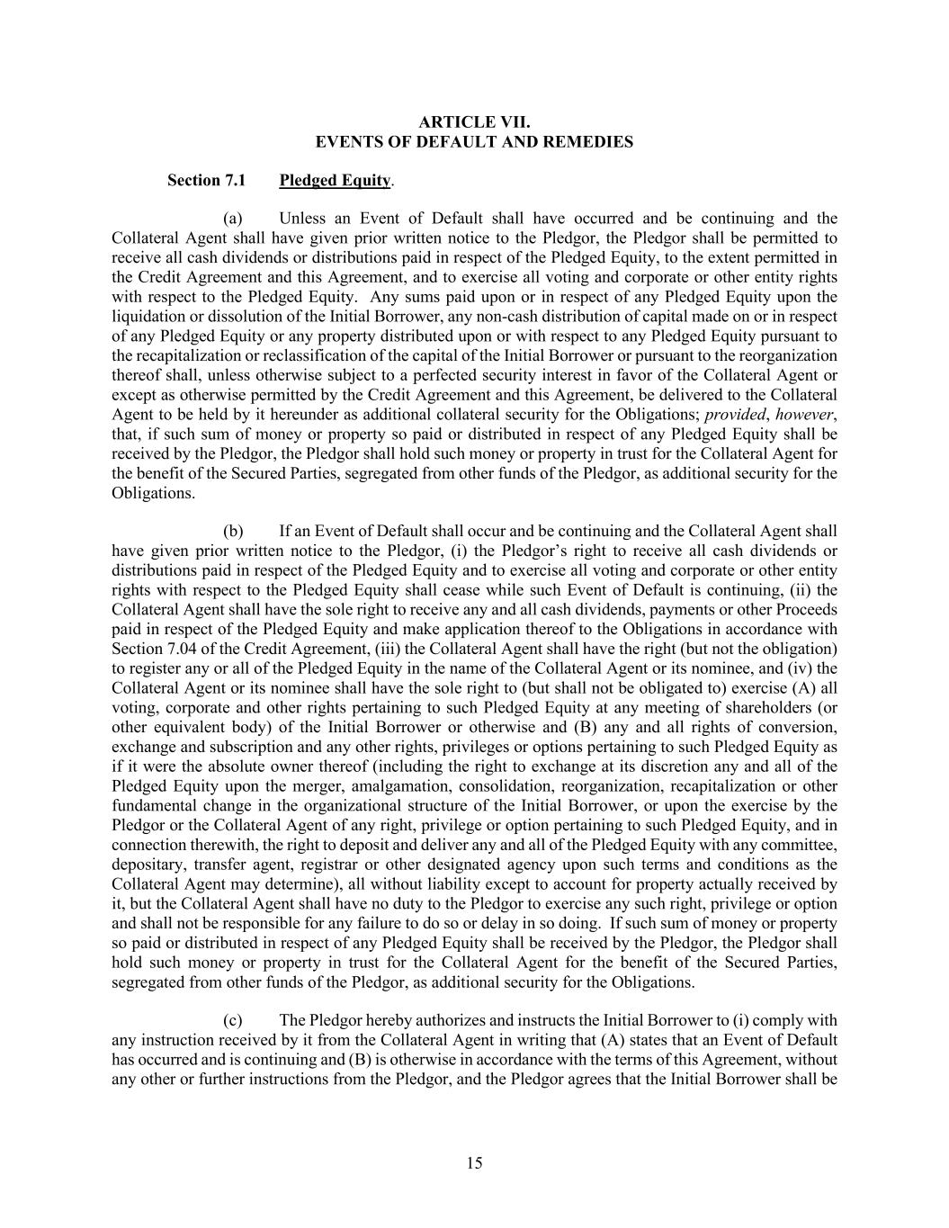 15 ARTICLE VII. EVENTS OF DEFAULT AND REMEDIES Section 7.1 Pledged Equity. (a) Unless an Event of Default shall have occurred and be continuing and the Collateral Agent shall have given prior written notice to the Pledgor, the Pledgor shall be permitted to receive all cash dividends or distributions paid in respect of the Pledged Equity, to the extent permitted in the Credit Agreement and this Agreement, and to exercise all voting and corporate or other entity rights with respect to the Pledged Equity. Any sums paid upon or in respect of any Pledged Equity upon the liquidation or dissolution of the Initial Borrower, any non-cash distribution of capital made on or in respect of any Pledged Equity or any property distributed upon or with respect to any Pledged Equity pursuant to the recapitalization or reclassification of the capital of the Initial Borrower or pursuant to the reorganization thereof shall, unless otherwise subject to a perfected security interest in favor of the Collateral Agent or except as otherwise permitted by the Credit Agreement and this Agreement, be delivered to the Collateral Agent to be held by it hereunder as additional collateral security for the Obligations; provided, however, that, if such sum of money or property so paid or distributed in respect of any Pledged Equity shall be received by the Pledgor, the Pledgor shall hold such money or property in trust for the Collateral Agent for the benefit of the Secured Parties, segregated from other funds of the Pledgor, as additional security for the Obligations. (b) If an Event of Default shall occur and be continuing and the Collateral Agent shall have given prior written notice to the Pledgor, (i) the Pledgor’s right to receive all cash dividends or distributions paid in respect of the Pledged Equity and to exercise all voting and corporate or other entity rights with respect to the Pledged Equity shall cease while such Event of Default is continuing, (ii) the Collateral Agent shall have the sole right to receive any and all cash dividends, payments or other Proceeds paid in respect of the Pledged Equity and make application thereof to the Obligations in accordance with Section 7.04 of the Credit Agreement, (iii) the Collateral Agent shall have the right (but not the obligation) to register any or all of the Pledged Equity in the name of the Collateral Agent or its nominee, and (iv) the Collateral Agent or its nominee shall have the sole right to (but shall not be obligated to) exercise (A) all voting, corporate and other rights pertaining to such Pledged Equity at any meeting of shareholders (or other equivalent body) of the Initial Borrower or otherwise and (B) any and all rights of conversion, exchange and subscription and any other rights, privileges or options pertaining to such Pledged Equity as if it were the absolute owner thereof (including the right to exchange at its discretion any and all of the Pledged Equity upon the merger, amalgamation, consolidation, reorganization, recapitalization or other fundamental change in the organizational structure of the Initial Borrower, or upon the exercise by the Pledgor or the Collateral Agent of any right, privilege or option pertaining to such Pledged Equity, and in connection therewith, the right to deposit and deliver any and all of the Pledged Equity with any committee, depositary, transfer agent, registrar or other designated agency upon such terms and conditions as the Collateral Agent may determine), all without liability except to account for property actually received by it, but the Collateral Agent shall have no duty to the Pledgor to exercise any such right, privilege or option and shall not be responsible for any failure to do so or delay in so doing. If such sum of money or property so paid or distributed in respect of any Pledged Equity shall be received by the Pledgor, the Pledgor shall hold such money or property in trust for the Collateral Agent for the benefit of the Secured Parties, segregated from other funds of the Pledgor, as additional security for the Obligations. (c) The Pledgor hereby authorizes and instructs the Initial Borrower to (i) comply with any instruction received by it from the Collateral Agent in writing that (A) states that an Event of Default has occurred and is continuing and (B) is otherwise in accordance with the terms of this Agreement, without any other or further instructions from the Pledgor, and the Pledgor agrees that the Initial Borrower shall be