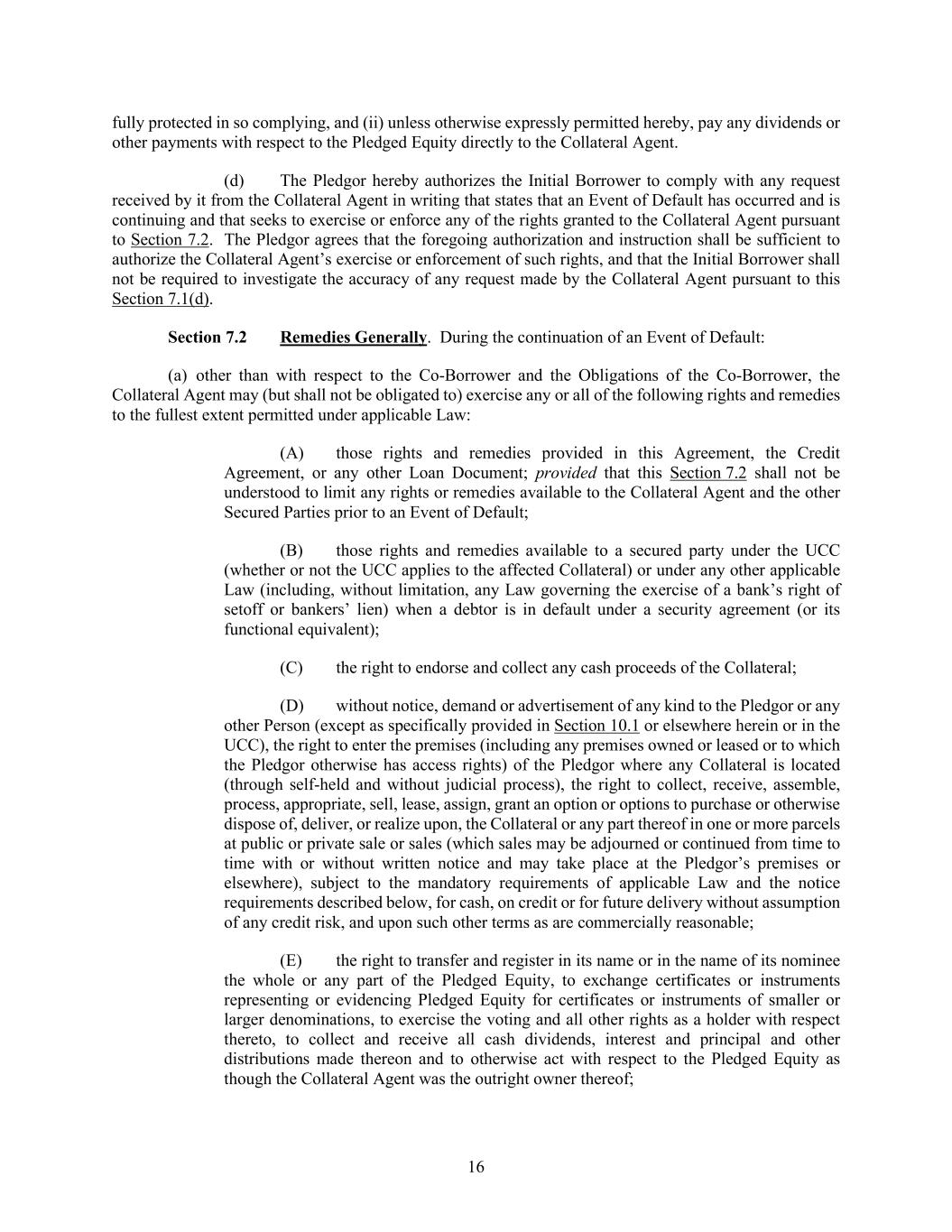 16 fully protected in so complying, and (ii) unless otherwise expressly permitted hereby, pay any dividends or other payments with respect to the Pledged Equity directly to the Collateral Agent. (d) The Pledgor hereby authorizes the Initial Borrower to comply with any request received by it from the Collateral Agent in writing that states that an Event of Default has occurred and is continuing and that seeks to exercise or enforce any of the rights granted to the Collateral Agent pursuant to Section 7.2. The Pledgor agrees that the foregoing authorization and instruction shall be sufficient to authorize the Collateral Agent’s exercise or enforcement of such rights, and that the Initial Borrower shall not be required to investigate the accuracy of any request made by the Collateral Agent pursuant to this Section 7.1(d). Section 7.2 Remedies Generally. During the continuation of an Event of Default: (a) other than with respect to the Co-Borrower and the Obligations of the Co-Borrower, the Collateral Agent may (but shall not be obligated to) exercise any or all of the following rights and remedies to the fullest extent permitted under applicable Law: (A) those rights and remedies provided in this Agreement, the Credit Agreement, or any other Loan Document; provided that this Section 7.2 shall not be understood to limit any rights or remedies available to the Collateral Agent and the other Secured Parties prior to an Event of Default; (B) those rights and remedies available to a secured party under the UCC (whether or not the UCC applies to the affected Collateral) or under any other applicable Law (including, without limitation, any Law governing the exercise of a bank’s right of setoff or bankers’ lien) when a debtor is in default under a security agreement (or its functional equivalent); (C) the right to endorse and collect any cash proceeds of the Collateral; (D) without notice, demand or advertisement of any kind to the Pledgor or any other Person (except as specifically provided in Section 10.1 or elsewhere herein or in the UCC), the right to enter the premises (including any premises owned or leased or to which the Pledgor otherwise has access rights) of the Pledgor where any Collateral is located (through self-held and without judicial process), the right to collect, receive, assemble, process, appropriate, sell, lease, assign, grant an option or options to purchase or otherwise dispose of, deliver, or realize upon, the Collateral or any part thereof in one or more parcels at public or private sale or sales (which sales may be adjourned or continued from time to time with or without written notice and may take place at the Pledgor’s premises or elsewhere), subject to the mandatory requirements of applicable Law and the notice requirements described below, for cash, on credit or for future delivery without assumption of any credit risk, and upon such other terms as are commercially reasonable; (E) the right to transfer and register in its name or in the name of its nominee the whole or any part of the Pledged Equity, to exchange certificates or instruments representing or evidencing Pledged Equity for certificates or instruments of smaller or larger denominations, to exercise the voting and all other rights as a holder with respect thereto, to collect and receive all cash dividends, interest and principal and other distributions made thereon and to otherwise act with respect to the Pledged Equity as though the Collateral Agent was the outright owner thereof;