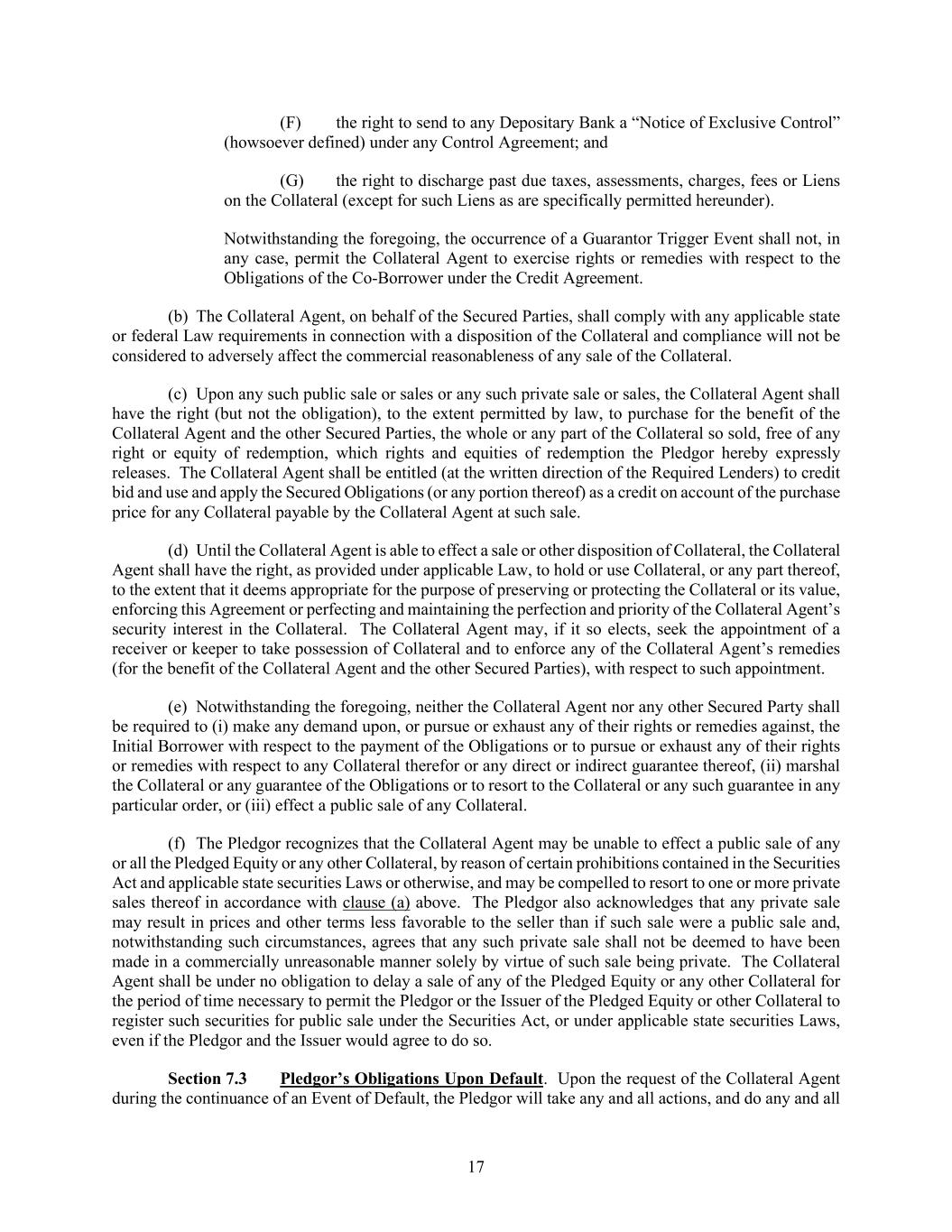17 (F) the right to send to any Depositary Bank a “Notice of Exclusive Control” (howsoever defined) under any Control Agreement; and (G) the right to discharge past due taxes, assessments, charges, fees or Liens on the Collateral (except for such Liens as are specifically permitted hereunder). Notwithstanding the foregoing, the occurrence of a Guarantor Trigger Event shall not, in any case, permit the Collateral Agent to exercise rights or remedies with respect to the Obligations of the Co-Borrower under the Credit Agreement. (b) The Collateral Agent, on behalf of the Secured Parties, shall comply with any applicable state or federal Law requirements in connection with a disposition of the Collateral and compliance will not be considered to adversely affect the commercial reasonableness of any sale of the Collateral. (c) Upon any such public sale or sales or any such private sale or sales, the Collateral Agent shall have the right (but not the obligation), to the extent permitted by law, to purchase for the benefit of the Collateral Agent and the other Secured Parties, the whole or any part of the Collateral so sold, free of any right or equity of redemption, which rights and equities of redemption the Pledgor hereby expressly releases. The Collateral Agent shall be entitled (at the written direction of the Required Lenders) to credit bid and use and apply the Secured Obligations (or any portion thereof) as a credit on account of the purchase price for any Collateral payable by the Collateral Agent at such sale. (d) Until the Collateral Agent is able to effect a sale or other disposition of Collateral, the Collateral Agent shall have the right, as provided under applicable Law, to hold or use Collateral, or any part thereof, to the extent that it deems appropriate for the purpose of preserving or protecting the Collateral or its value, enforcing this Agreement or perfecting and maintaining the perfection and priority of the Collateral Agent’s security interest in the Collateral. The Collateral Agent may, if it so elects, seek the appointment of a receiver or keeper to take possession of Collateral and to enforce any of the Collateral Agent’s remedies (for the benefit of the Collateral Agent and the other Secured Parties), with respect to such appointment. (e) Notwithstanding the foregoing, neither the Collateral Agent nor any other Secured Party shall be required to (i) make any demand upon, or pursue or exhaust any of their rights or remedies against, the Initial Borrower with respect to the payment of the Obligations or to pursue or exhaust any of their rights or remedies with respect to any Collateral therefor or any direct or indirect guarantee thereof, (ii) marshal the Collateral or any guarantee of the Obligations or to resort to the Collateral or any such guarantee in any particular order, or (iii) effect a public sale of any Collateral. (f) The Pledgor recognizes that the Collateral Agent may be unable to effect a public sale of any or all the Pledged Equity or any other Collateral, by reason of certain prohibitions contained in the Securities Act and applicable state securities Laws or otherwise, and may be compelled to resort to one or more private sales thereof in accordance with clause (a) above. The Pledgor also acknowledges that any private sale may result in prices and other terms less favorable to the seller than if such sale were a public sale and, notwithstanding such circumstances, agrees that any such private sale shall not be deemed to have been made in a commercially unreasonable manner solely by virtue of such sale being private. The Collateral Agent shall be under no obligation to delay a sale of any of the Pledged Equity or any other Collateral for the period of time necessary to permit the Pledgor or the Issuer of the Pledged Equity or other Collateral to register such securities for public sale under the Securities Act, or under applicable state securities Laws, even if the Pledgor and the Issuer would agree to do so. Section 7.3 Pledgor’s Obligations Upon Default. Upon the request of the Collateral Agent during the continuance of an Event of Default, the Pledgor will take any and all actions, and do any and all