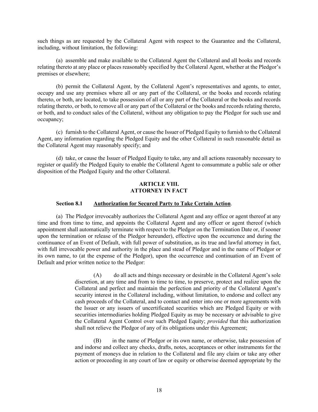 18 such things as are requested by the Collateral Agent with respect to the Guarantee and the Collateral, including, without limitation, the following: (a) assemble and make available to the Collateral Agent the Collateral and all books and records relating thereto at any place or places reasonably specified by the Collateral Agent, whether at the Pledgor’s premises or elsewhere; (b) permit the Collateral Agent, by the Collateral Agent’s representatives and agents, to enter, occupy and use any premises where all or any part of the Collateral, or the books and records relating thereto, or both, are located, to take possession of all or any part of the Collateral or the books and records relating thereto, or both, to remove all or any part of the Collateral or the books and records relating thereto, or both, and to conduct sales of the Collateral, without any obligation to pay the Pledgor for such use and occupancy; (c) furnish to the Collateral Agent, or cause the Issuer of Pledged Equity to furnish to the Collateral Agent, any information regarding the Pledged Equity and the other Collateral in such reasonable detail as the Collateral Agent may reasonably specify; and (d) take, or cause the Issuer of Pledged Equity to take, any and all actions reasonably necessary to register or qualify the Pledged Equity to enable the Collateral Agent to consummate a public sale or other disposition of the Pledged Equity and the other Collateral. ARTICLE VIII. ATTORNEY IN FACT Section 8.1 Authorization for Secured Party to Take Certain Action. (a) The Pledgor irrevocably authorizes the Collateral Agent and any office or agent thereof at any time and from time to time, and appoints the Collateral Agent and any officer or agent thereof (which appointment shall automatically terminate with respect to the Pledgor on the Termination Date or, if sooner upon the termination or release of the Pledgor hereunder), effective upon the occurrence and during the continuance of an Event of Default, with full power of substitution, as its true and lawful attorney in fact, with full irrevocable power and authority in the place and stead of Pledgor and in the name of Pledgor or its own name, to (at the expense of the Pledgor), upon the occurrence and continuation of an Event of Default and prior written notice to the Pledgor: (A) do all acts and things necessary or desirable in the Collateral Agent’s sole discretion, at any time and from to time to time, to preserve, protect and realize upon the Collateral and perfect and maintain the perfection and priority of the Collateral Agent’s security interest in the Collateral including, without limitation, to endorse and collect any cash proceeds of the Collateral, and to contact and enter into one or more agreements with the Issuer or any issuers of uncertificated securities which are Pledged Equity or with securities intermediaries holding Pledged Equity as may be necessary or advisable to give the Collateral Agent Control over such Pledged Equity; provided that this authorization shall not relieve the Pledgor of any of its obligations under this Agreement; (B) in the name of Pledgor or its own name, or otherwise, take possession of and indorse and collect any checks, drafts, notes, acceptances or other instruments for the payment of moneys due in relation to the Collateral and file any claim or take any other action or proceeding in any court of law or equity or otherwise deemed appropriate by the